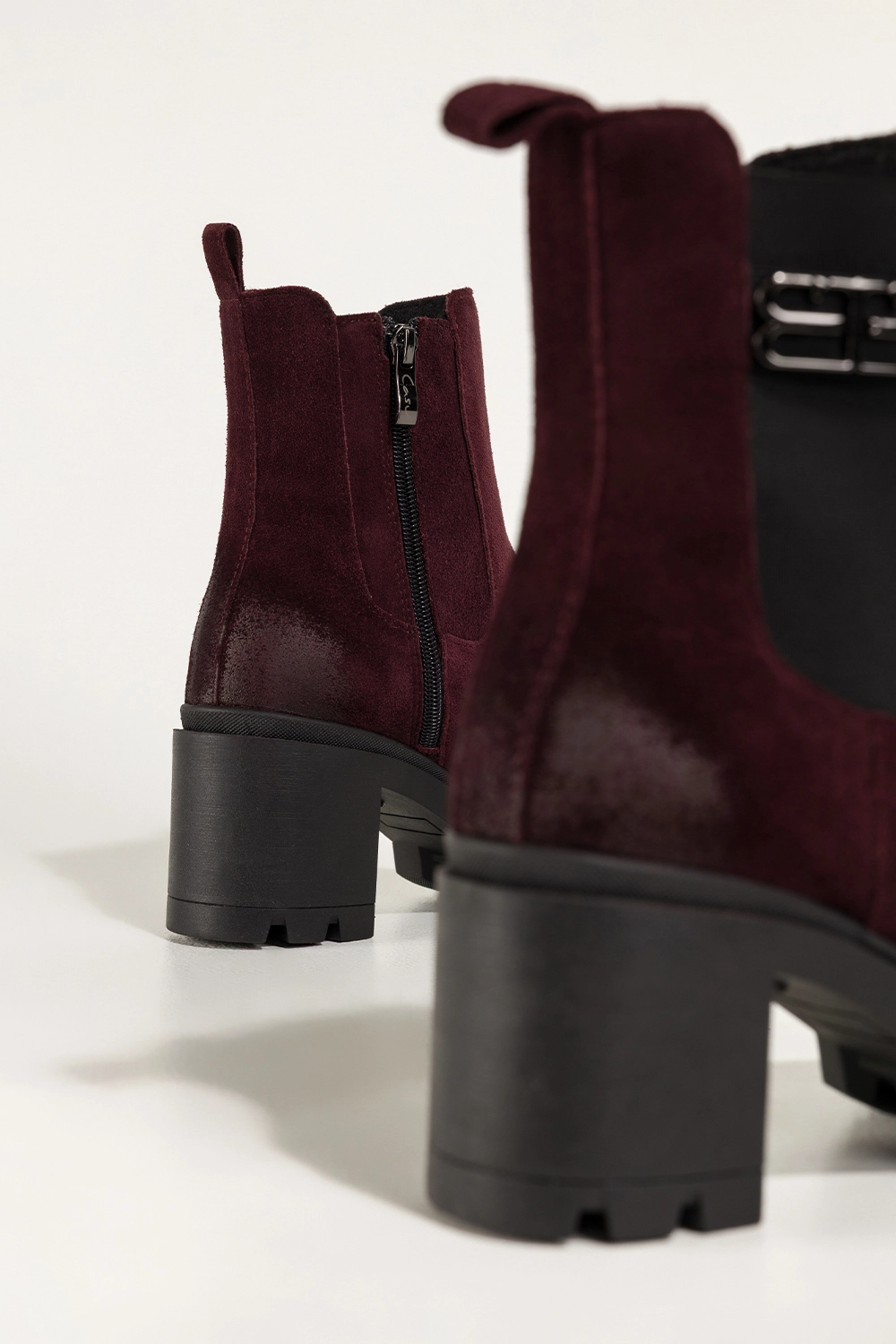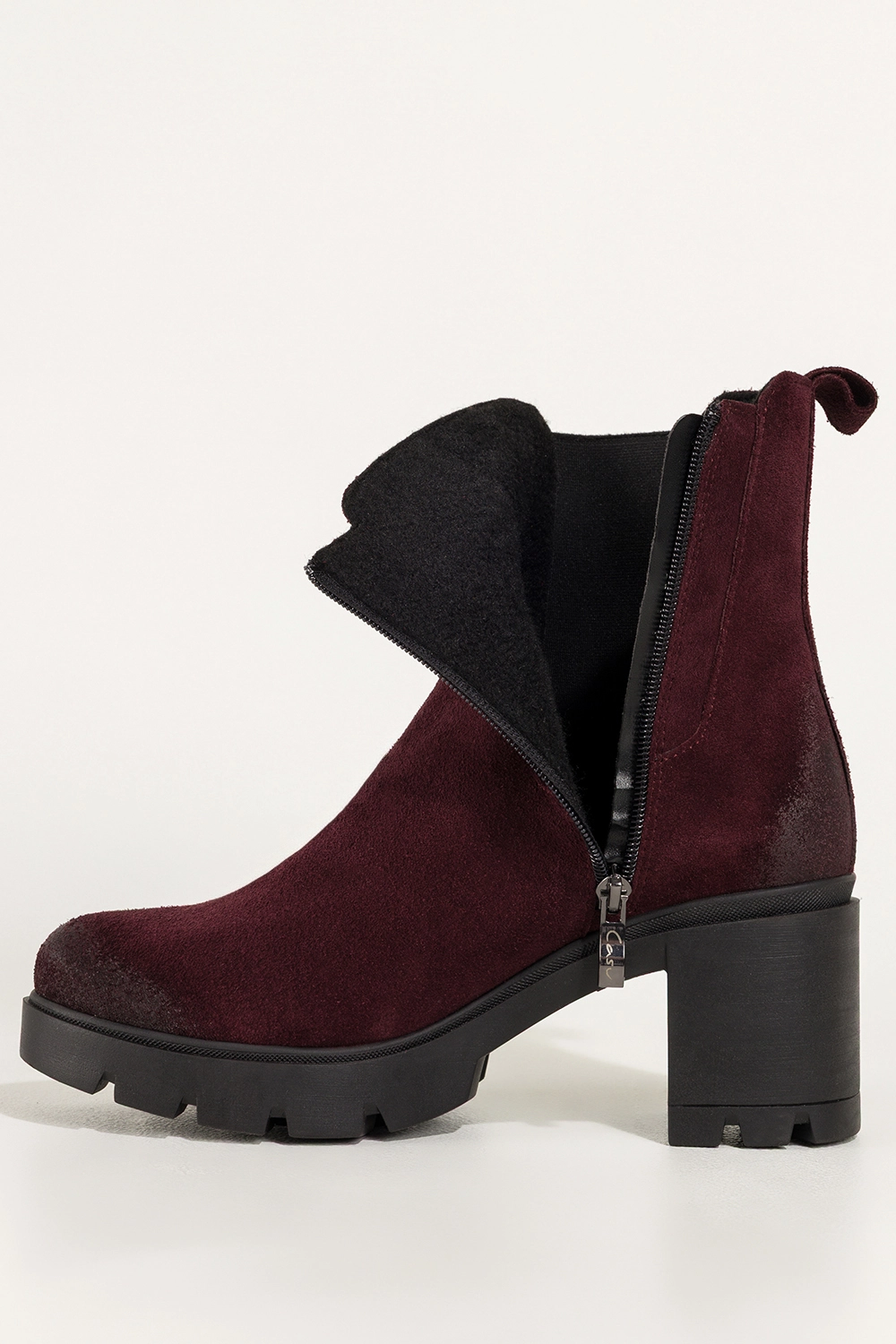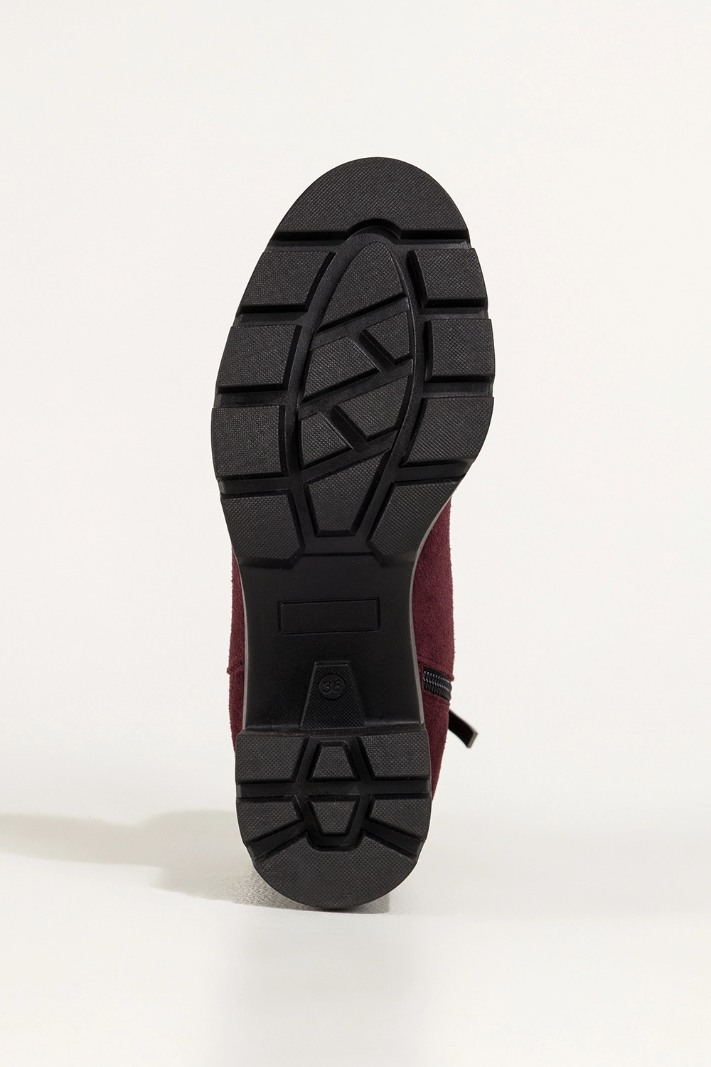 Bordowe botki skórzane damskie na szerokim klocku z gumą stalowa ozdoba PRODUKT POLSKI Casu model 39602. Wykonane z wysokogatunkowej skóry zamszowej, zachwycają nie tylko estetyką, ale i funkcjonalnością. Miękka wkładka tekstylna oraz ocieplenie kocem obuwniczym gwarantują ciepło i wygodę nawet w chłodniejsze dni. Stabilny, bieżnikowany obcas słupek i platforma zapewniają pewność kroku i doskonałą przyczepność.
