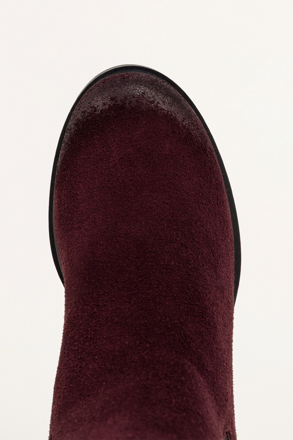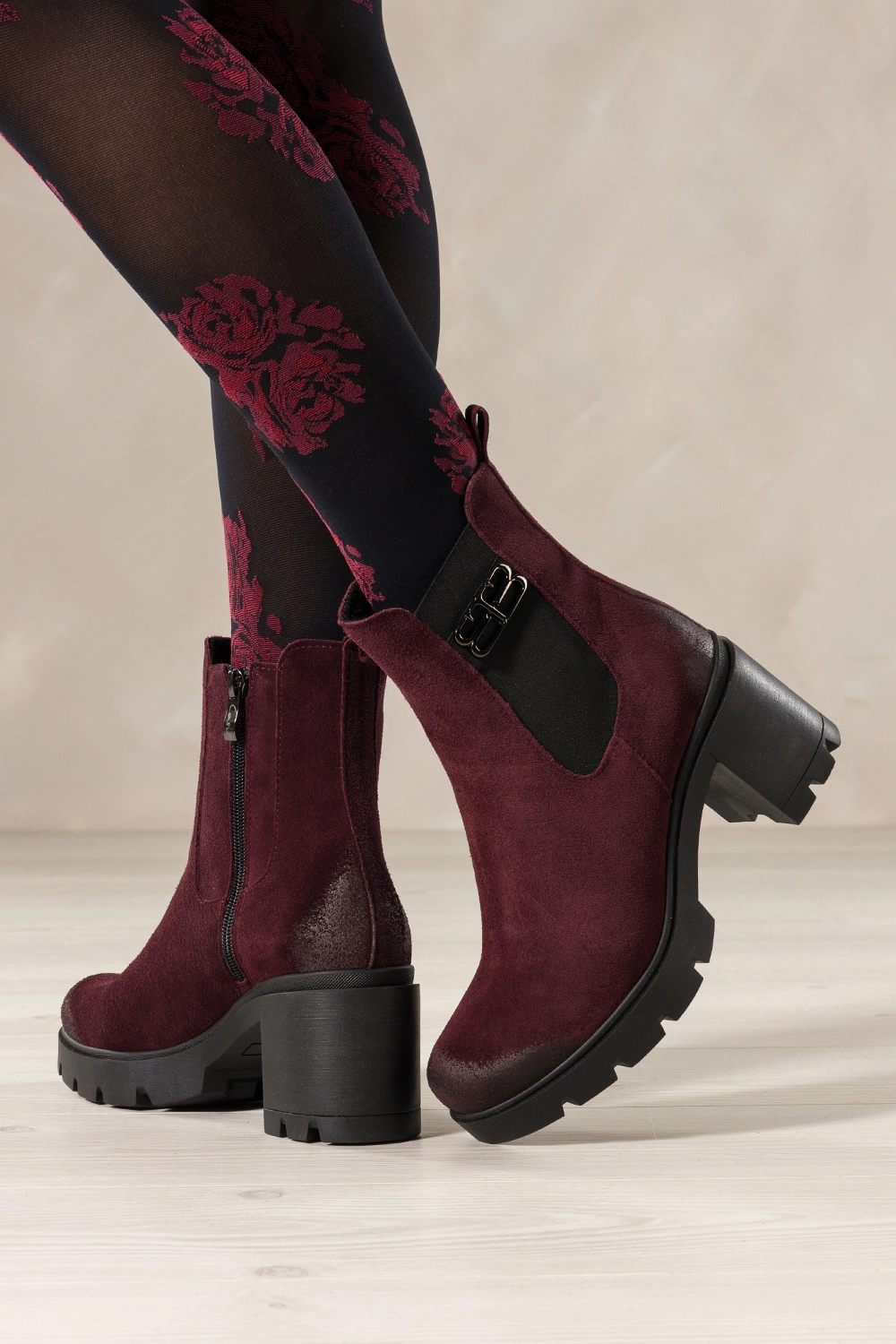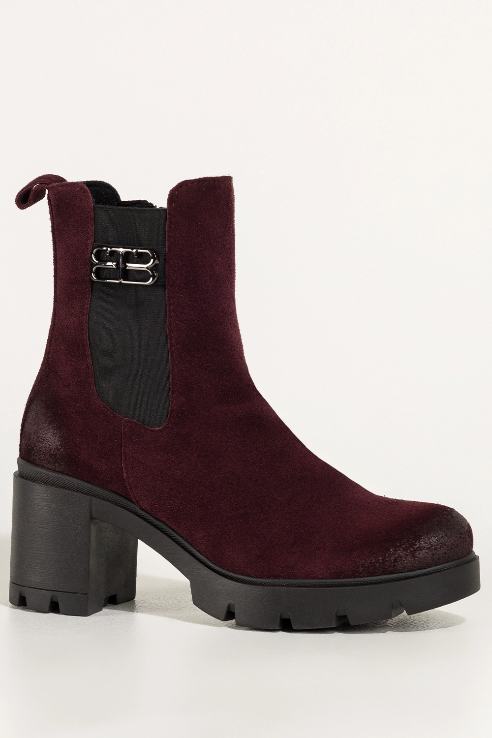 Bordowe botki skórzane damskie na szerokim klocku z gumą stalowa ozdoba PRODUKT POLSKI Casu model 39602. Wykonane z wysokogatunkowej skóry zamszowej, zachwycają nie tylko estetyką, ale i funkcjonalnością. Miękka wkładka tekstylna oraz ocieplenie kocem obuwniczym gwarantują ciepło i wygodę nawet w chłodniejsze dni. Stabilny, bieżnikowany obcas słupek i platforma zapewniają pewność kroku i doskonałą przyczepność.