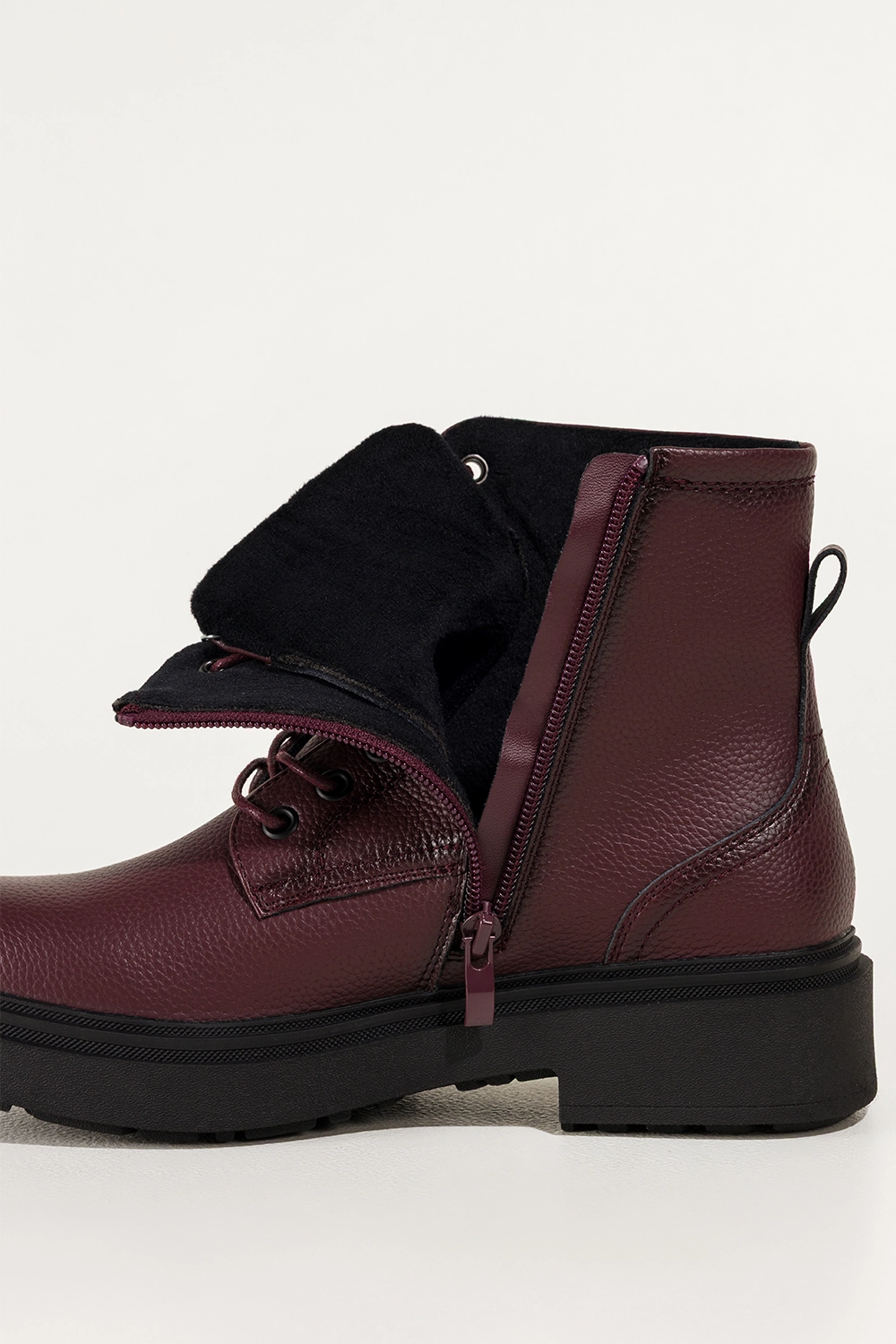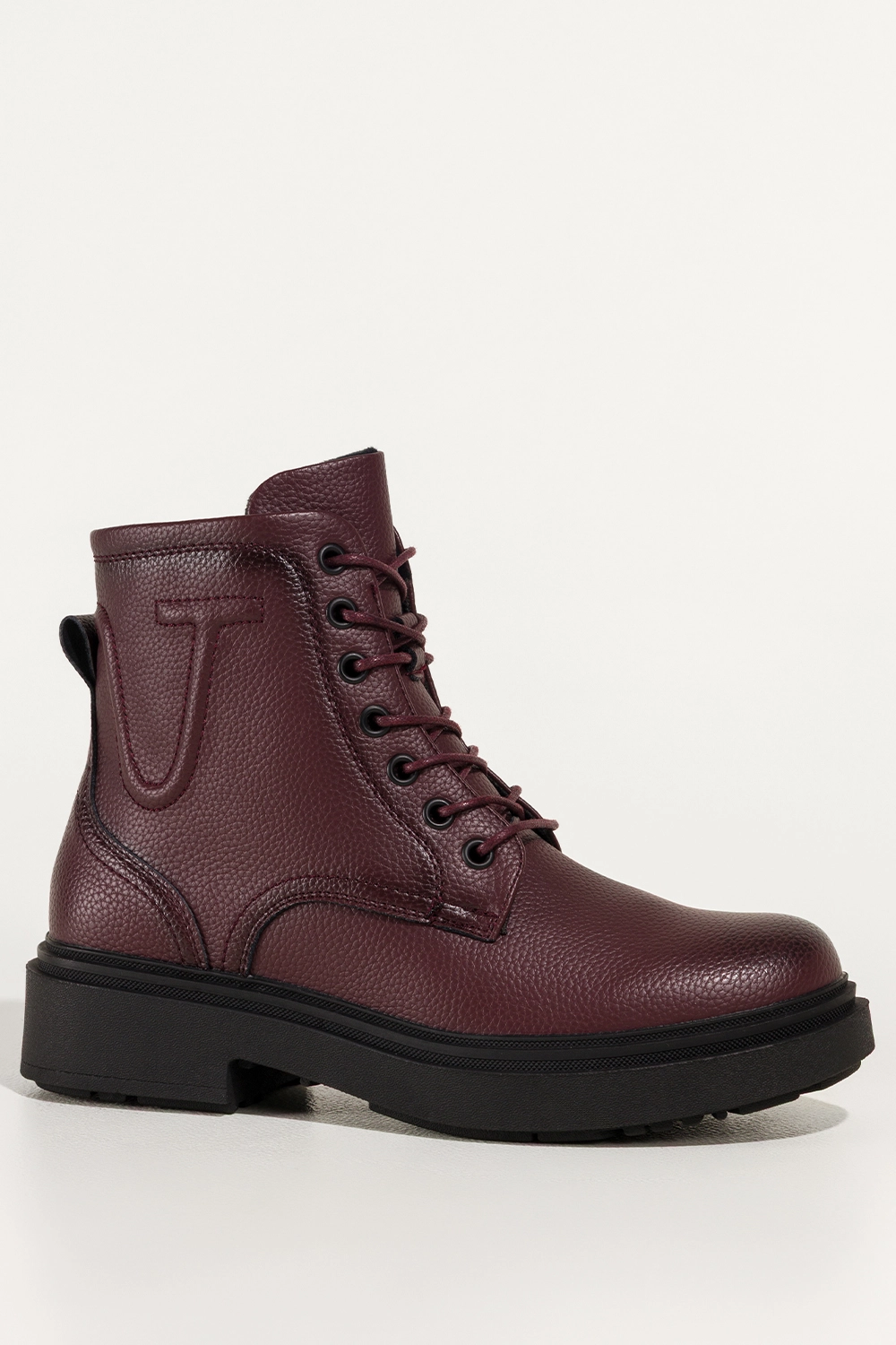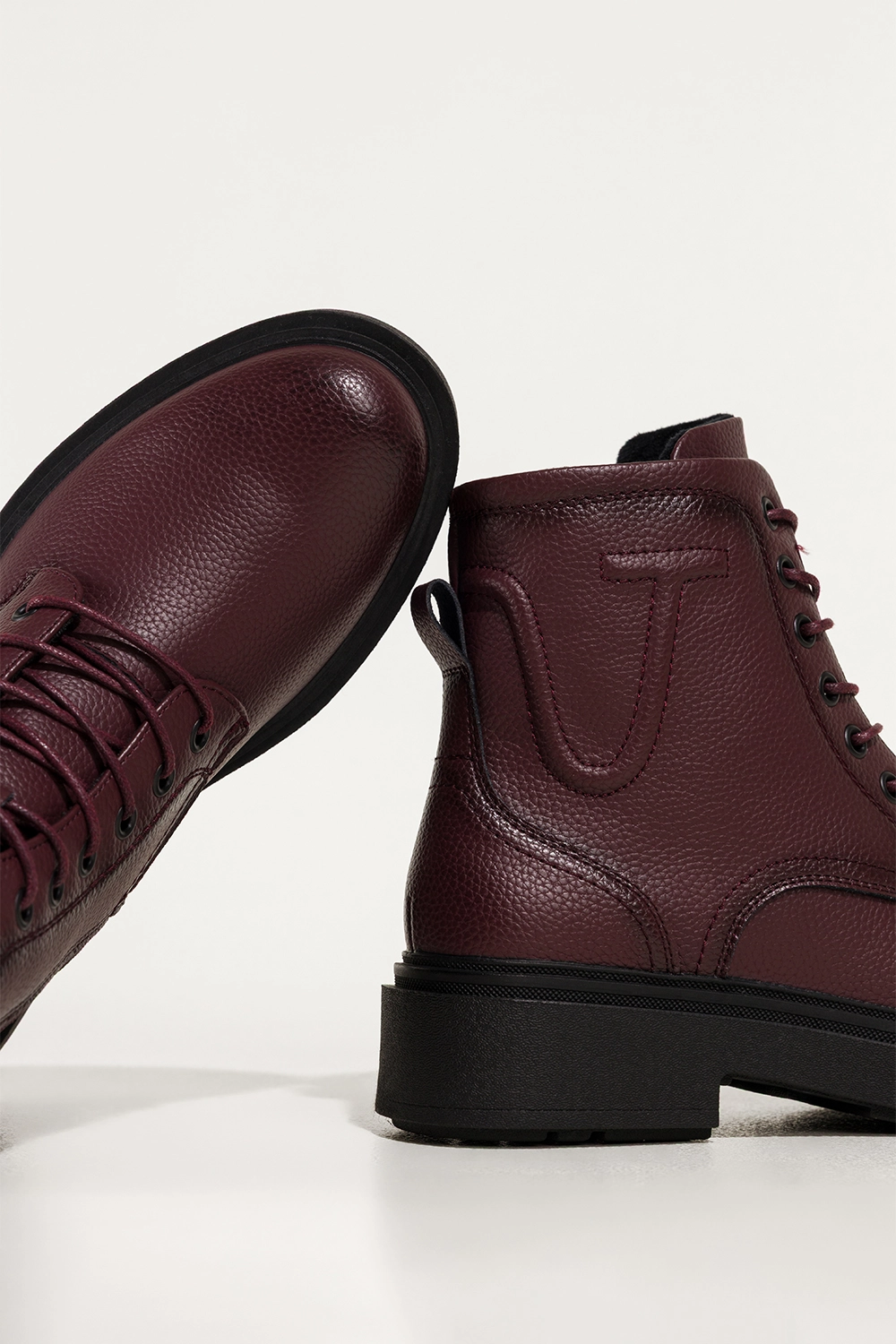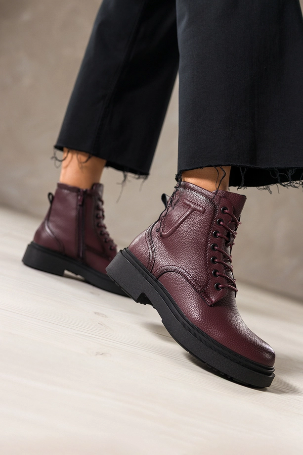 Bordowe botki skórzane damskie Sergio Leone na czarnej żłobionej platformie ozdobne przeszycia na cholewce sznurowane YG74751-H. Wykonane z wysokogatunkowej, naturalnej skóry, gwarantują trwałość i odporność na codzienne użytkowanie. Wnętrze ocieplone miękkim kocem obuwniczym zapewnia przyjemne ciepło w chłodne dni, nie rezygnując z wygody. Zaokrąglony nosek i precyzyjne wykończenia sprawiają, że każdy krok to komfort klasy premium.