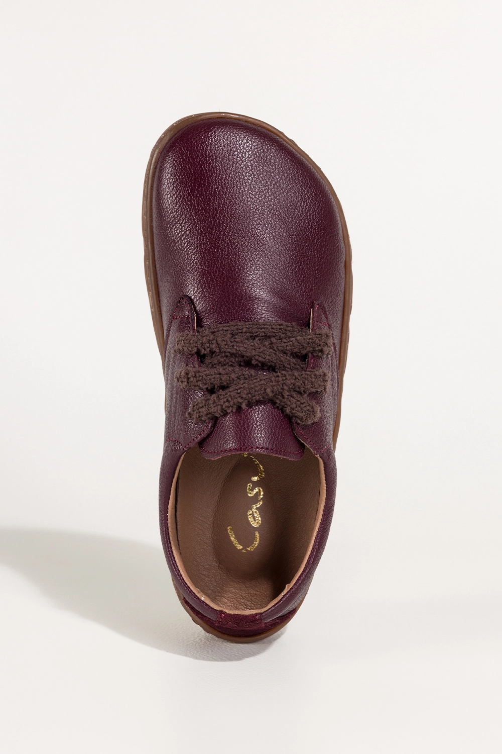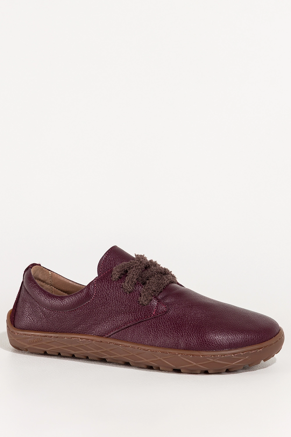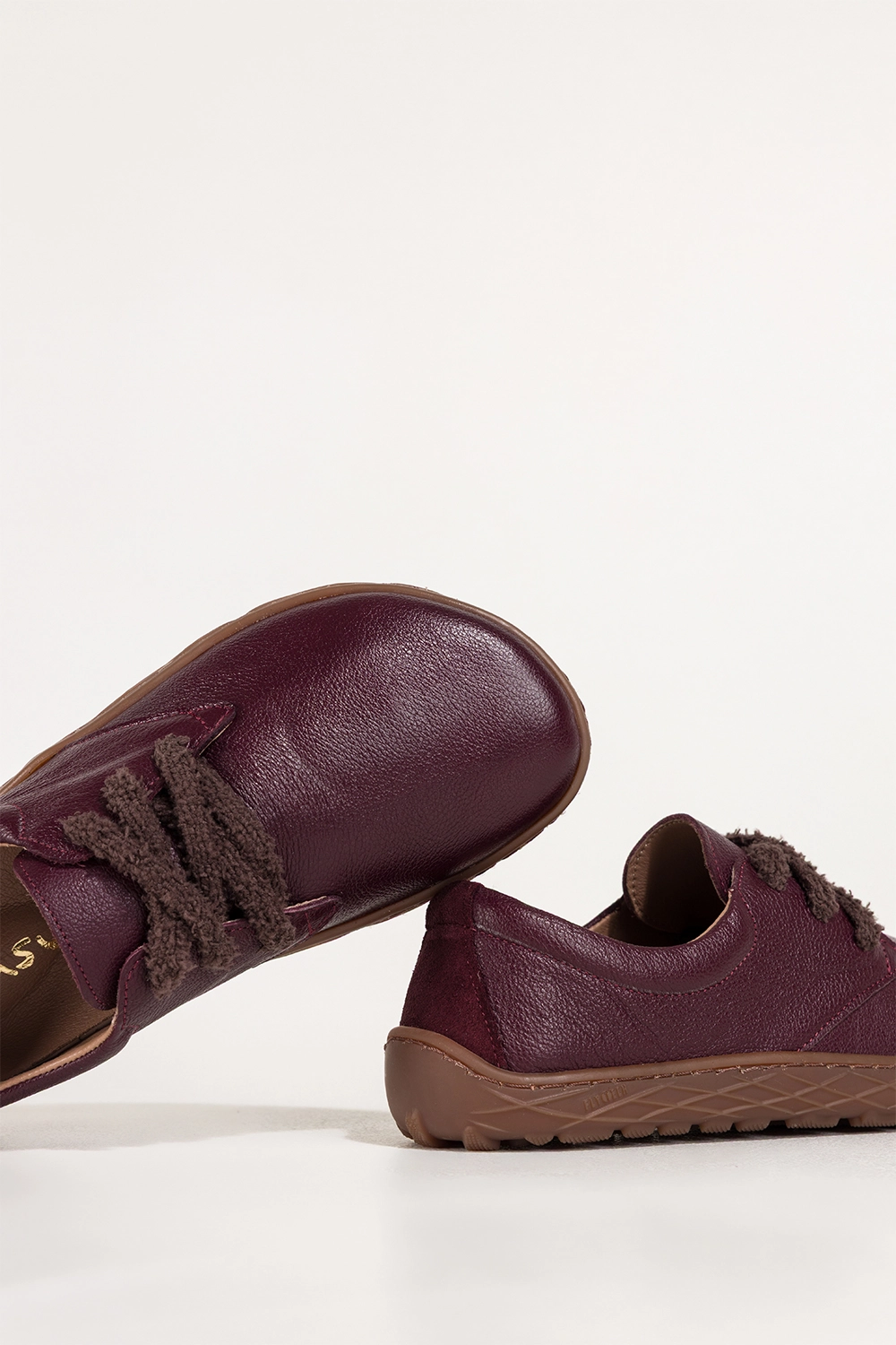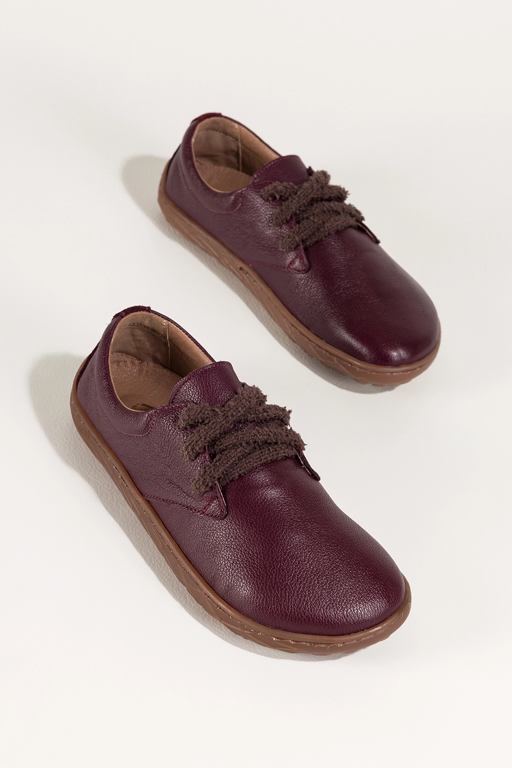 Buty barefoot w odcieniu głębokiego bordo z puszystymi brązowymi sznurówkami to unikalny akcent każdej stylizacji. Ich szeroki, zaokrąglony nosek pozwala stopie na naturalne ułożenie, co szczególnie docenią osoby z szerszymi stopami. Elastyczna, płaska podeszwa zapewnia stabilność, maksymalny kontakt z podłożem i naturalną pracę mięśni. Sprawdzą się zarówno w miejskim stylu, jak i w luźnych, codziennych outfitach. To doskonały wybór dla kobiet ceniących modę, która podąża za zdrowiem i wygodą.