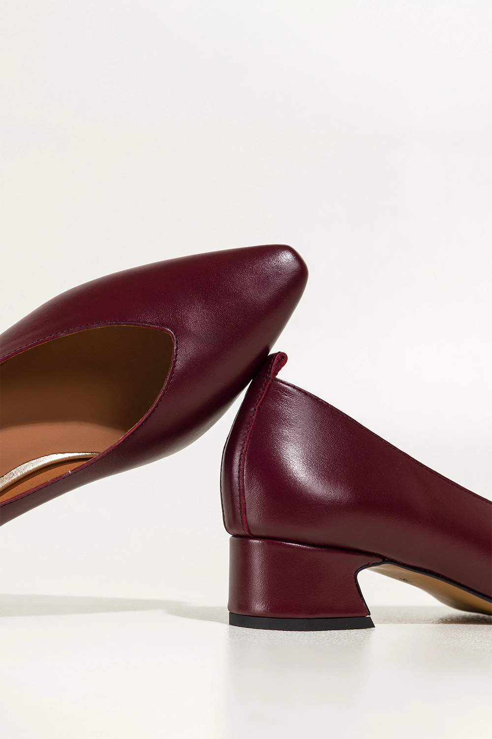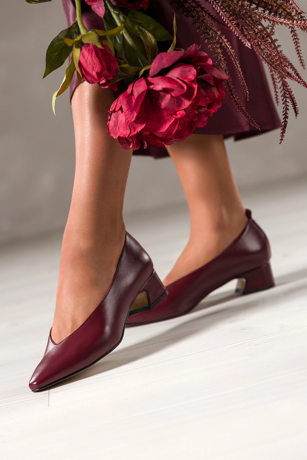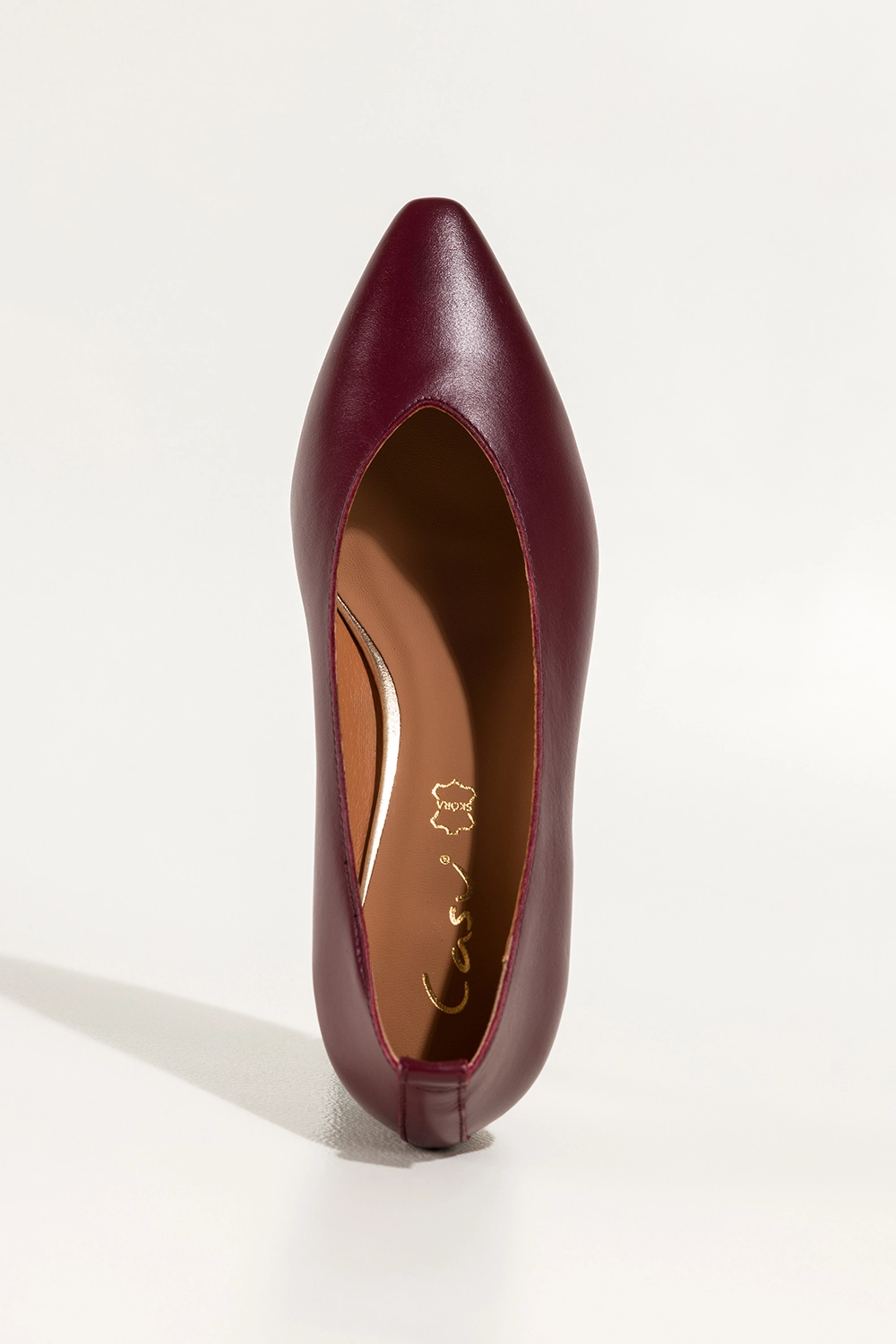 Bordowe czółenka skórzane damskie na niskim klocku wycięcie w cholewce PRODUKT POLSKI Casu 7235-771 to model który zachwyca głębokim kolorem i subtelnym wycięciem w cholewce tworzącym wysmuklającą linię stopy. Szlachetny odcień bordo pięknie współgra ze szpiczastym noskiem oraz niskim obcasem klockiem w skórzanym wykończeniu dodając lekkości i kobiecego szyku.