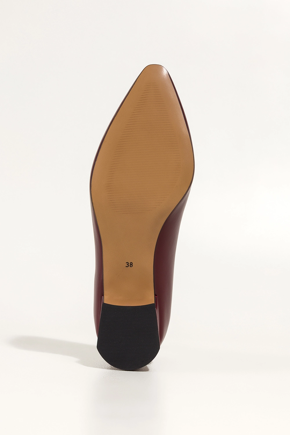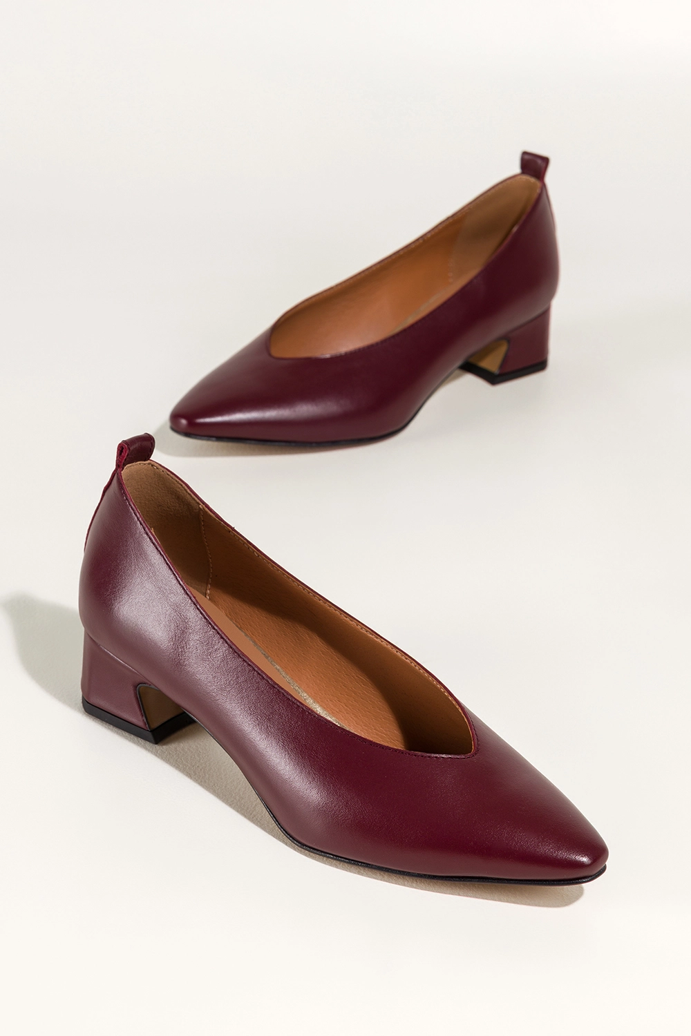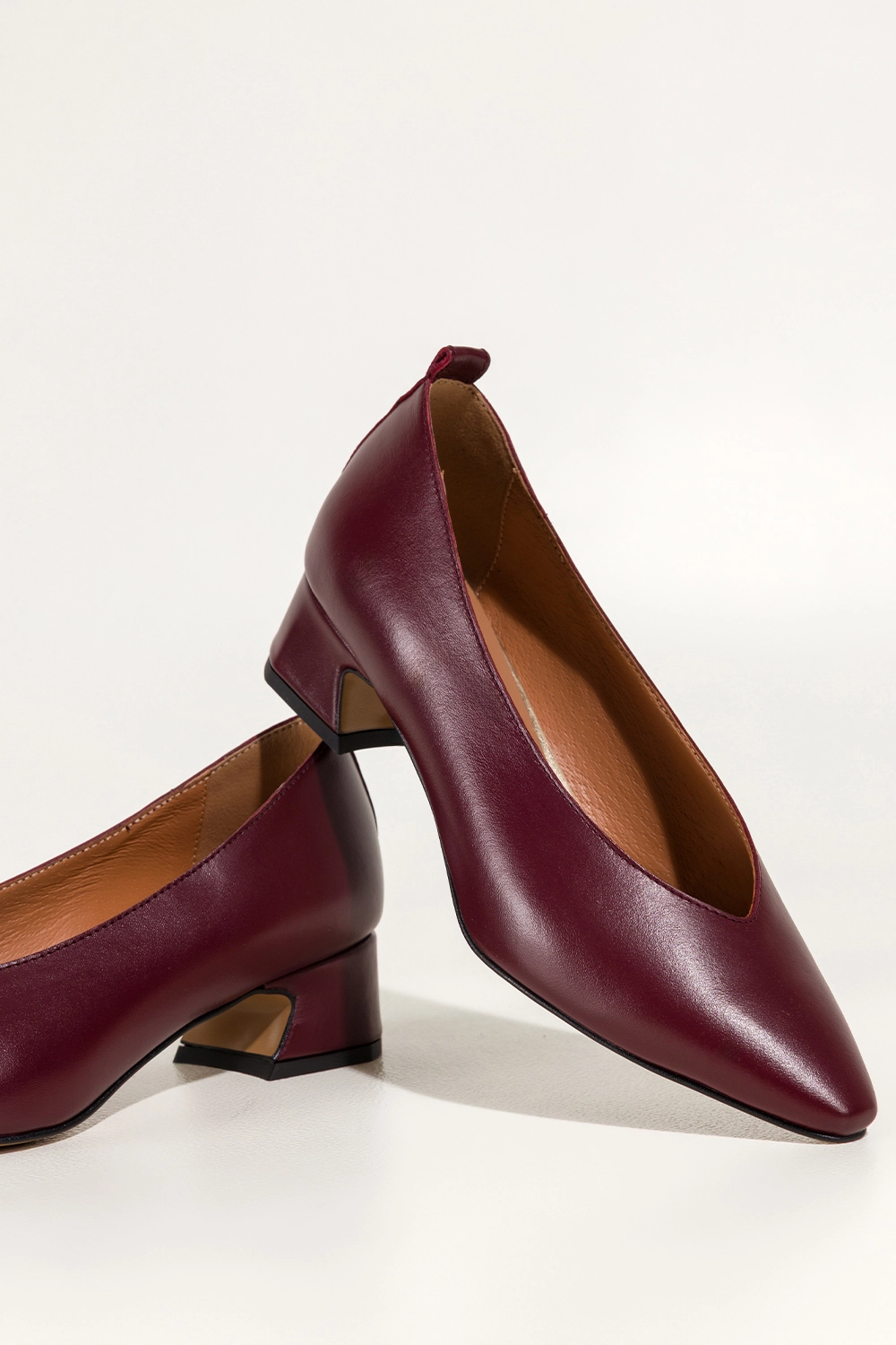 Bordowe czółenka skórzane damskie na niskim klocku wycięcie w cholewce PRODUKT POLSKI Casu 7235-771 to model który zachwyca głębokim kolorem i subtelnym wycięciem w cholewce tworzącym wysmuklającą linię stopy. Szlachetny odcień bordo pięknie współgra ze szpiczastym noskiem oraz niskim obcasem klockiem w skórzanym wykończeniu dodając lekkości i kobiecego szyku.