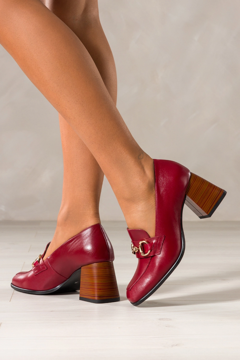 Bordowy kolor przełamany złotą sprzączką tworzy odważny, ale ponadczasowy duet, który doskonale dopełni stylizacje zarówno casualowe, jak i eleganckie. Szeroki, stabilny obcas typu klocek w paski dodaje nie tylko centymetrów, ale i charakteru, podkreślając nowoczesny design. Wsuwana forma buta to nie tylko wygoda, ale także element, który podkreśla ich nonszalancką elegancję. To buty, które opowiadają historię kobiecej pewności siebie.