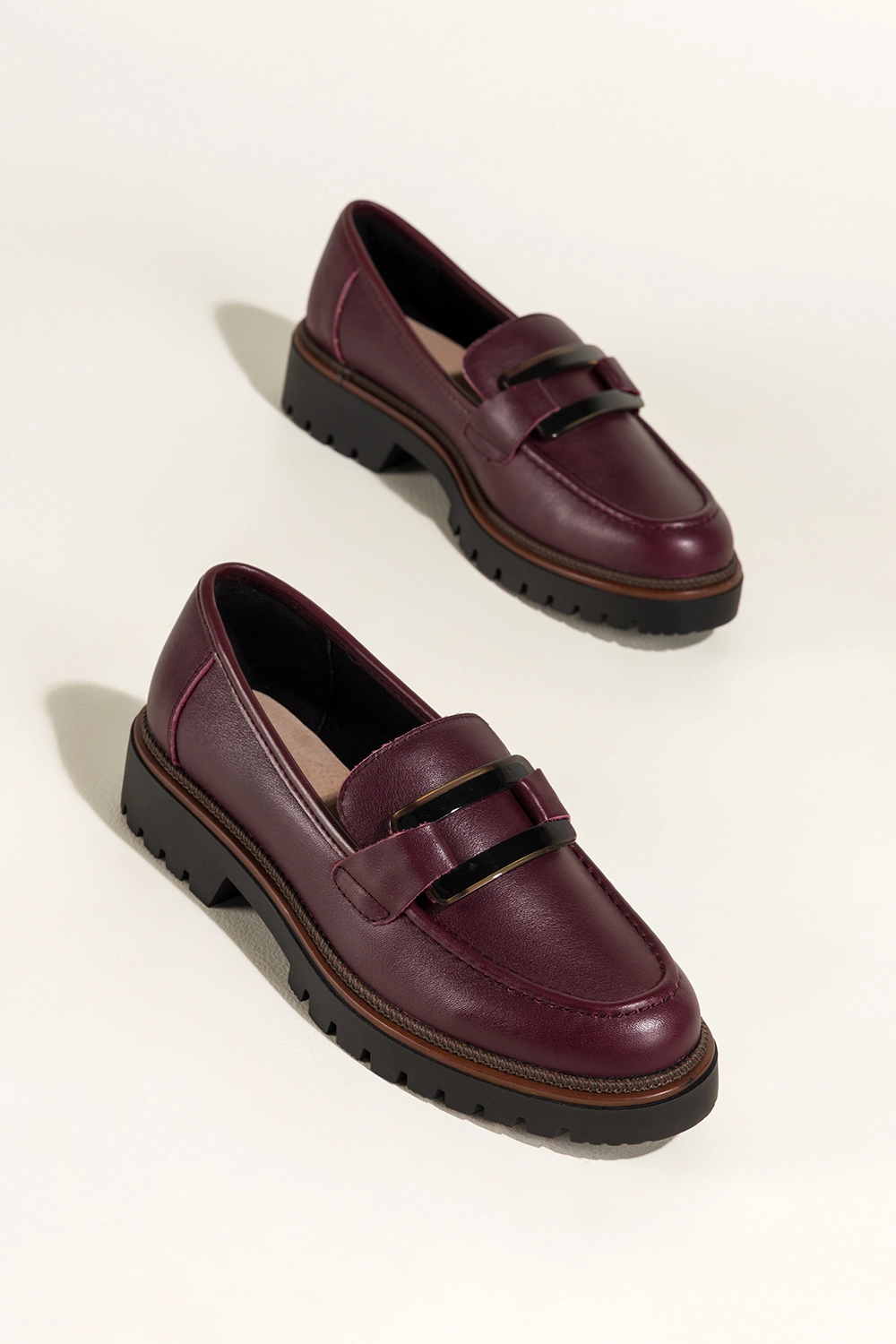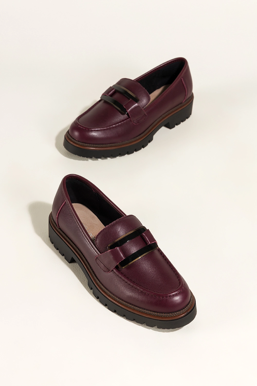 Wyjątkowy bordowy odcień wprowadza głębię i elegancję do każdej stylizacji, a czarna ozdoba na cholewce dodaje nuty nowoczesnej wyrazistości. Mokasyny świetnie komponują się zarówno z casualowymi jeansami, jak i bardziej formalnymi zestawami. Wsuwana konstrukcja ułatwia szybkie zakładanie, co czyni je idealnym wyborem dla kobiet ceniących wygodę bez kompromisów w stylu.