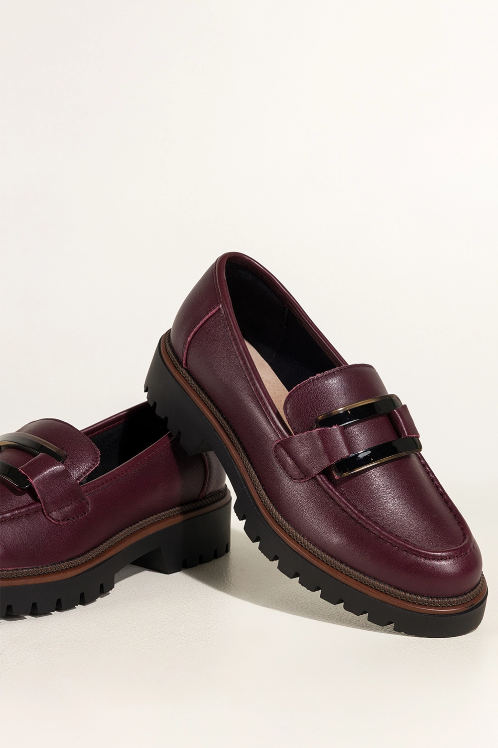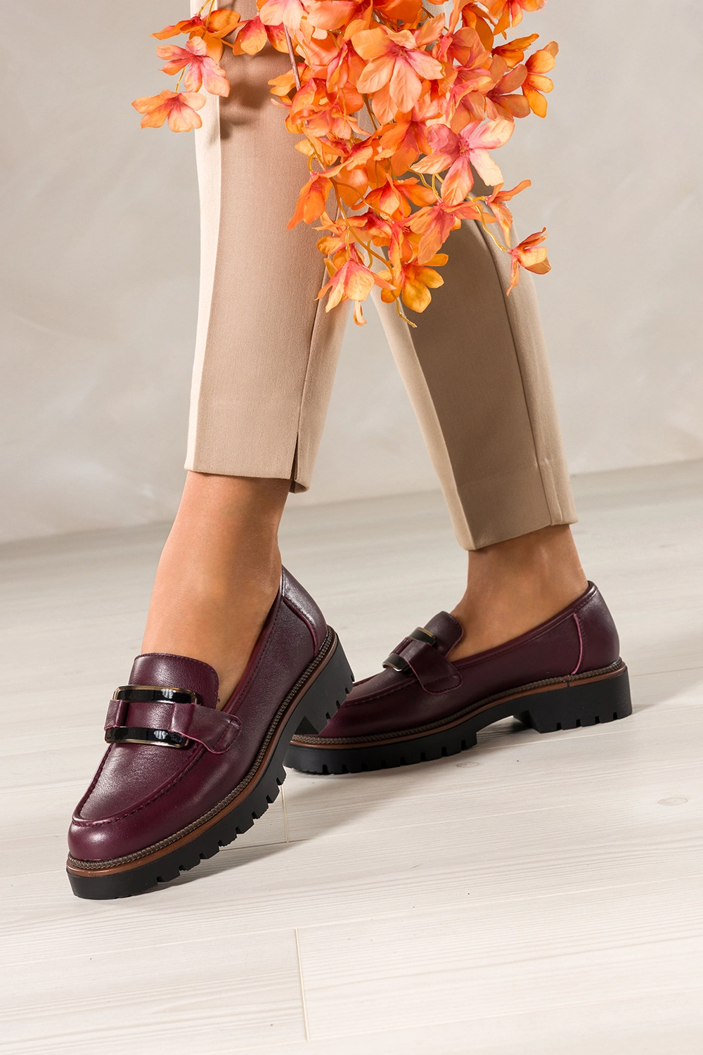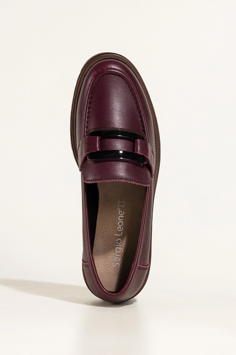 Bordowe mokasyny skórzane damskie Sergio Leone na bieżnikowanej podeszwie czarna ozdoba na cholewce NP74833-H