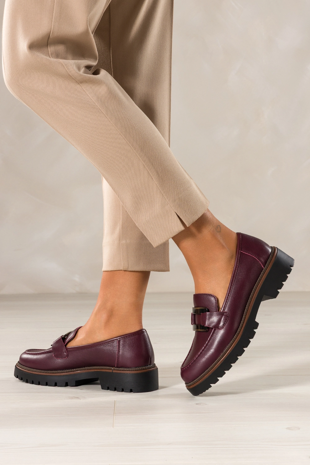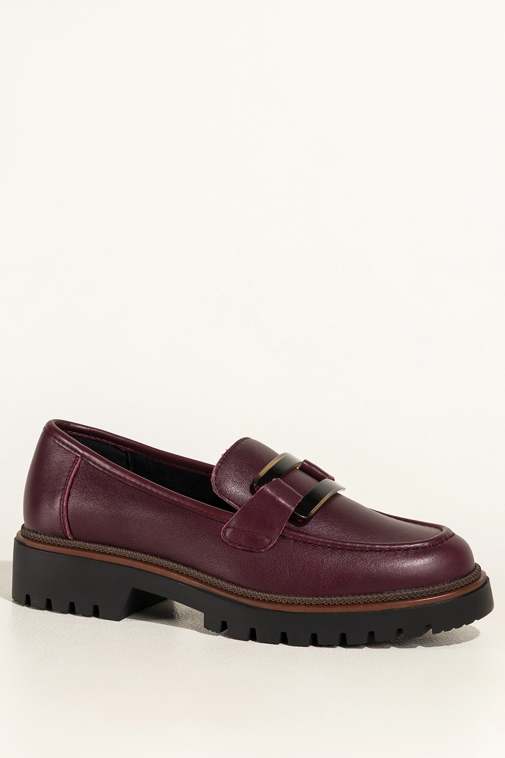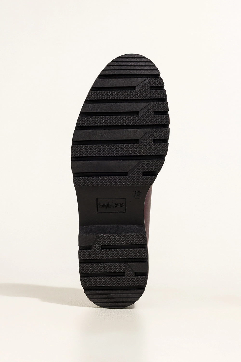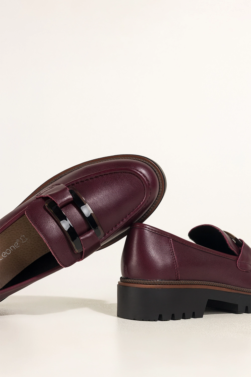 Bordowe mokasyny skórzane damskie Sergio Leone na bieżnikowanej podeszwie czarna ozdoba na cholewce NP74833-H