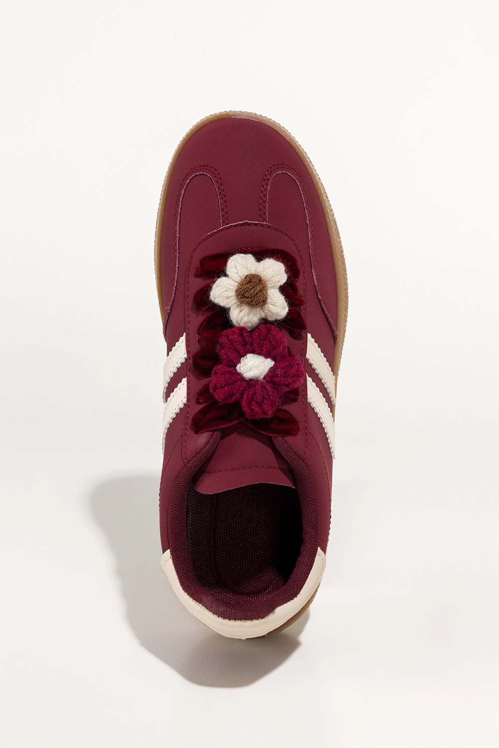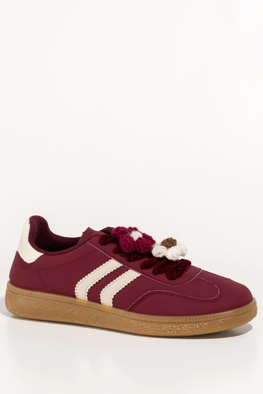Bordowe sneakersy damskie buty sportowe na platformie welurowe sznurówki z odpinanymi kwiatami beżowe wstawki Carla model X6087 to absolutny must-have dla kobiet ceniących połączenie wygody, kobiecego stylu i niebanalnych detali. Wyróżniają się nie tylko odważnym, głębokim kolorem bordowym, ale również welurowymi sznurówkami ozdobionymi subtelnymi, odpinanymi kwiatami w kolorze beżu i bordo. Ten model łączy sportowy charakter z romantyczną estetyką, tworząc wyjątkowe obuwie idealne do codziennych stylizacji, jak i bardziej wyszukanych outfitów. Projekt opiera się na nowoczesnym designie i wysokiej jakości materiałach, co czyni te sneakersy nie tylko pięknymi, ale i niezwykle komfortowymi. Beżowa platforma oraz beżowe wstawki na cholewce dodają lekkości, przełamując intensywność koloru i podkreślając uniwersalność tego modelu.
