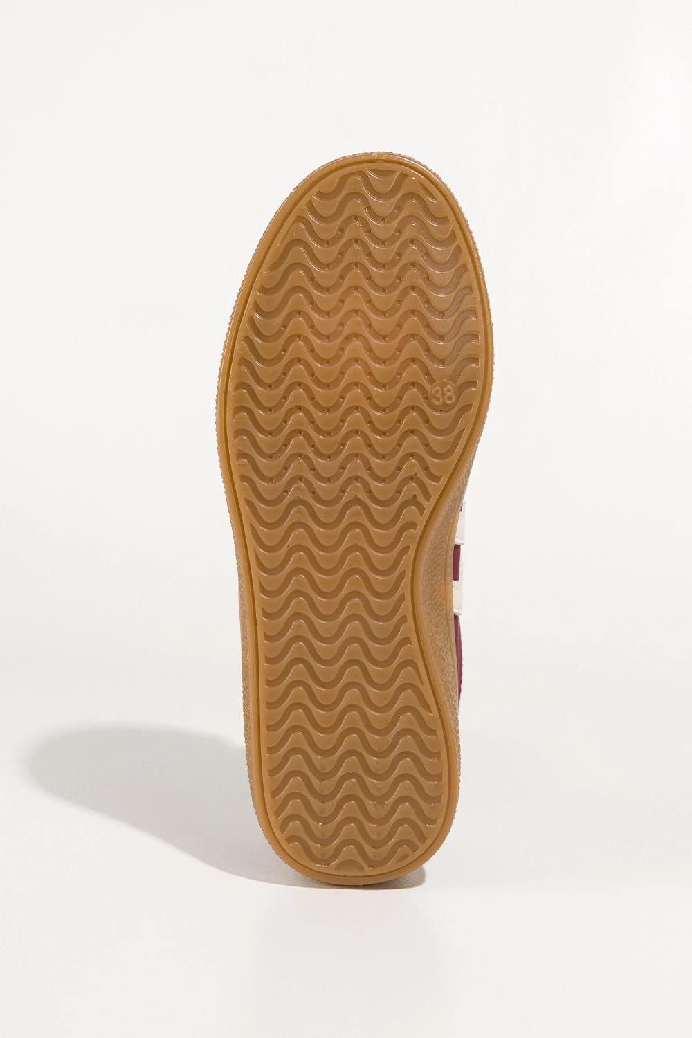 Bordowe sneakersy wykonane zostały z wysokogatunkowej skóry ekologicznej, która doskonale imituje naturalny materiał, jednocześnie oferując wyjątkową wytrzymałość oraz łatwość w pielęgnacji. Materiał ten jest przyjazny dla środowiska, a zarazem niezwykle odporny na zarysowania i warunki atmosferyczne, co czyni go idealnym wyborem na każdą porę roku. Wnętrze buta wyściełane zostało miękką, tekstylną tkaniną, a specjalna, wyjmowana wkładka dopasowuje się do kształtu stopy, zapewniając wysoki komfort podczas codziennego użytkowania. Sneakersy są lekkie, mimo solidnej platformy, co czyni je idealnym wyborem dla kobiet, które są w ciągłym ruchu i potrzebują stabilnego, ale wygodnego obuwia. Zaokrąglony nosek i anatomiczny kształt cholewki zapewniają odpowiednią cyrkulację powietrza i wygodne dopasowanie nawet przy dłuższym noszeniu.