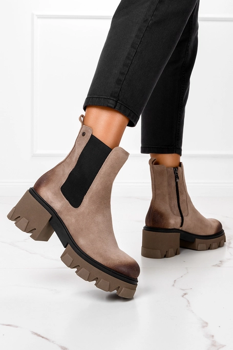 Beżowe botki na słupku z gumką POLSKA SKÓRA Casu 60375