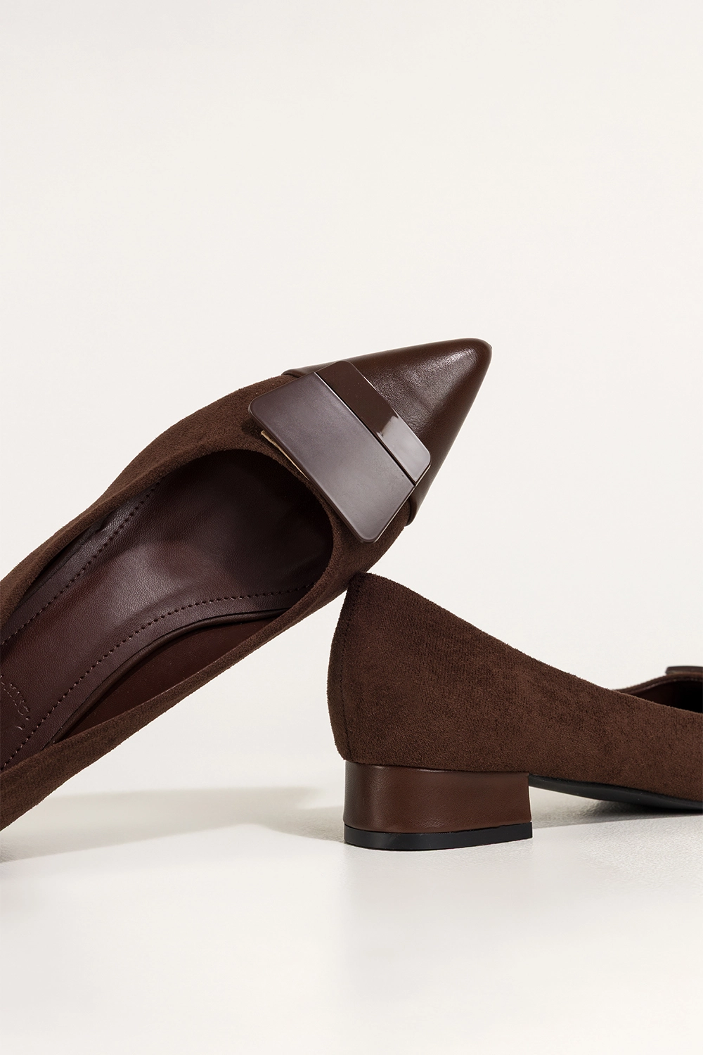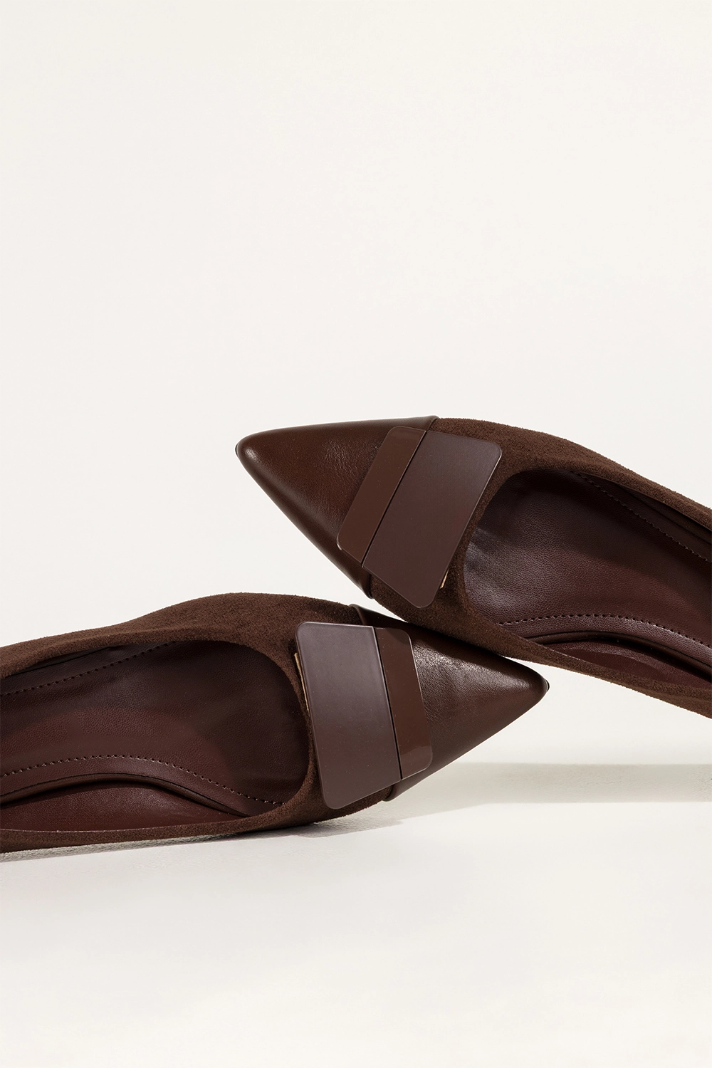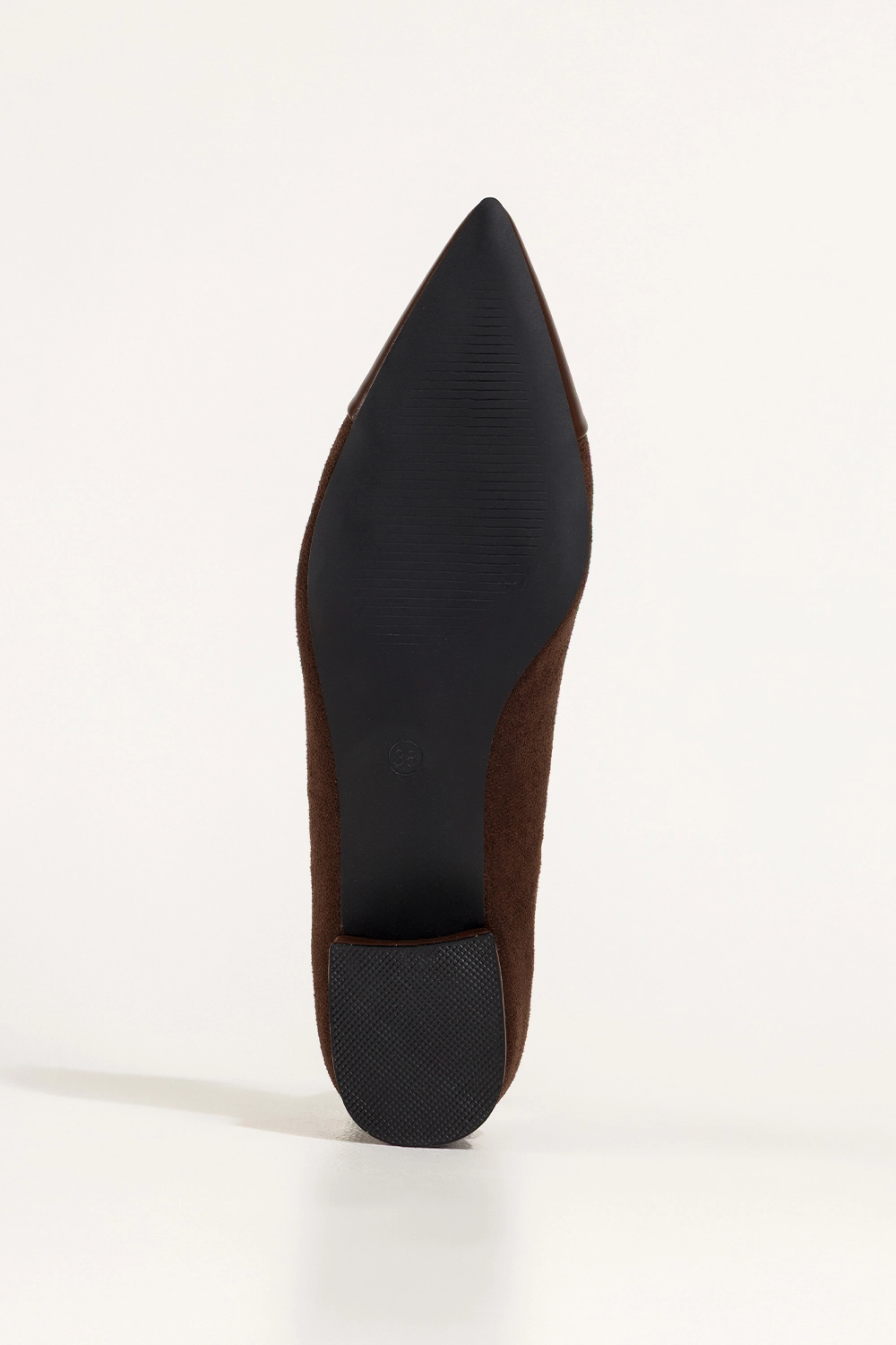 Brązowe baleriny damskie z brązową ozdobą na niskim obcasie Carla model F4994 doskonale sprawdzą się na co dzień i podczas wyjątkowych okazji. Wykonane z miękkiego, wysokogatunkowego zamszu ekologicznego oferują niezwykłą trwałość oraz luksusowy wygląd. Wkładka z ekologicznej skóry gwarantuje wygodę nawet przy długim noszeniu. Model wsuwany ułatwia szybkie zakładanie, zapewniając jednocześnie idealne dopasowanie do stopy.