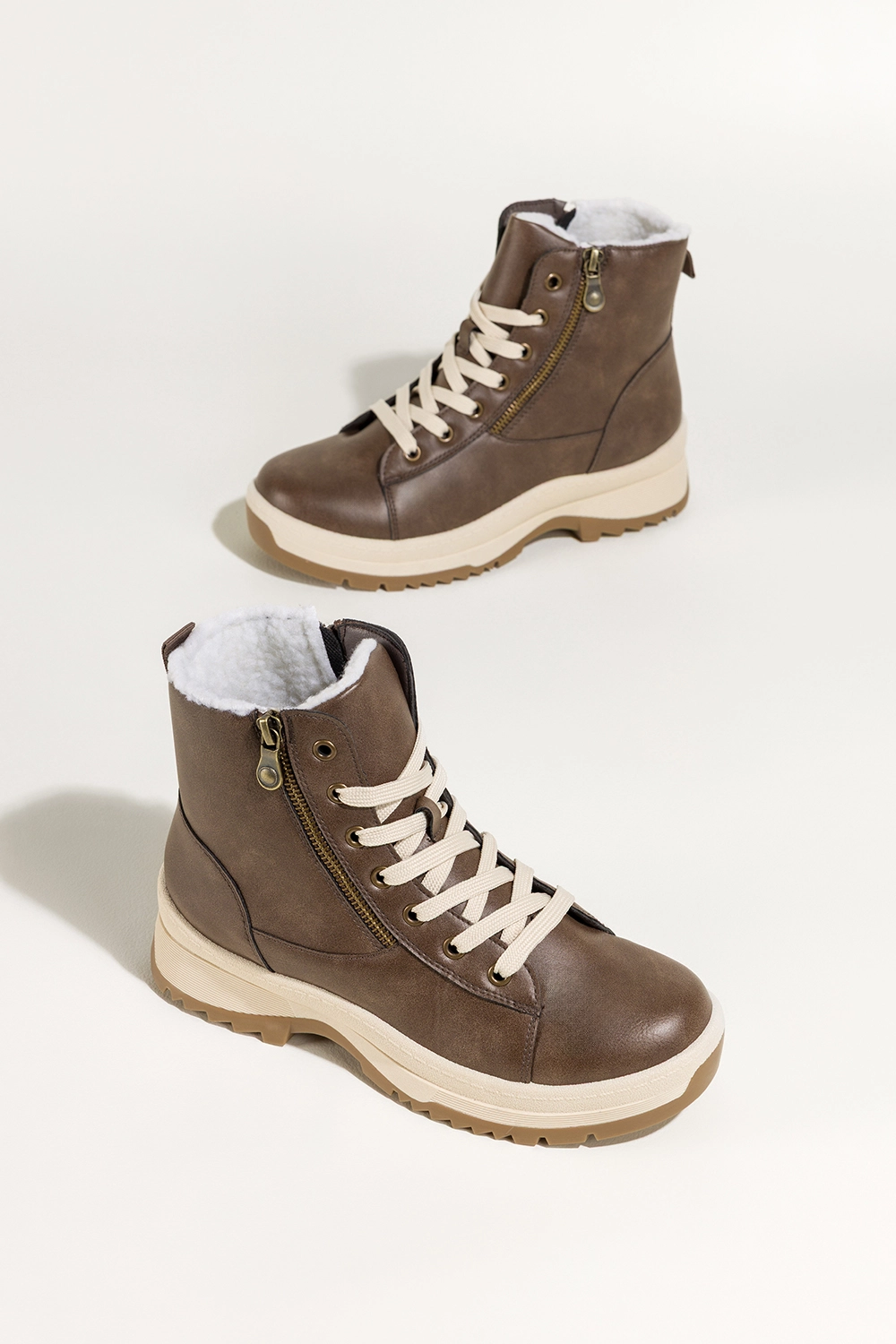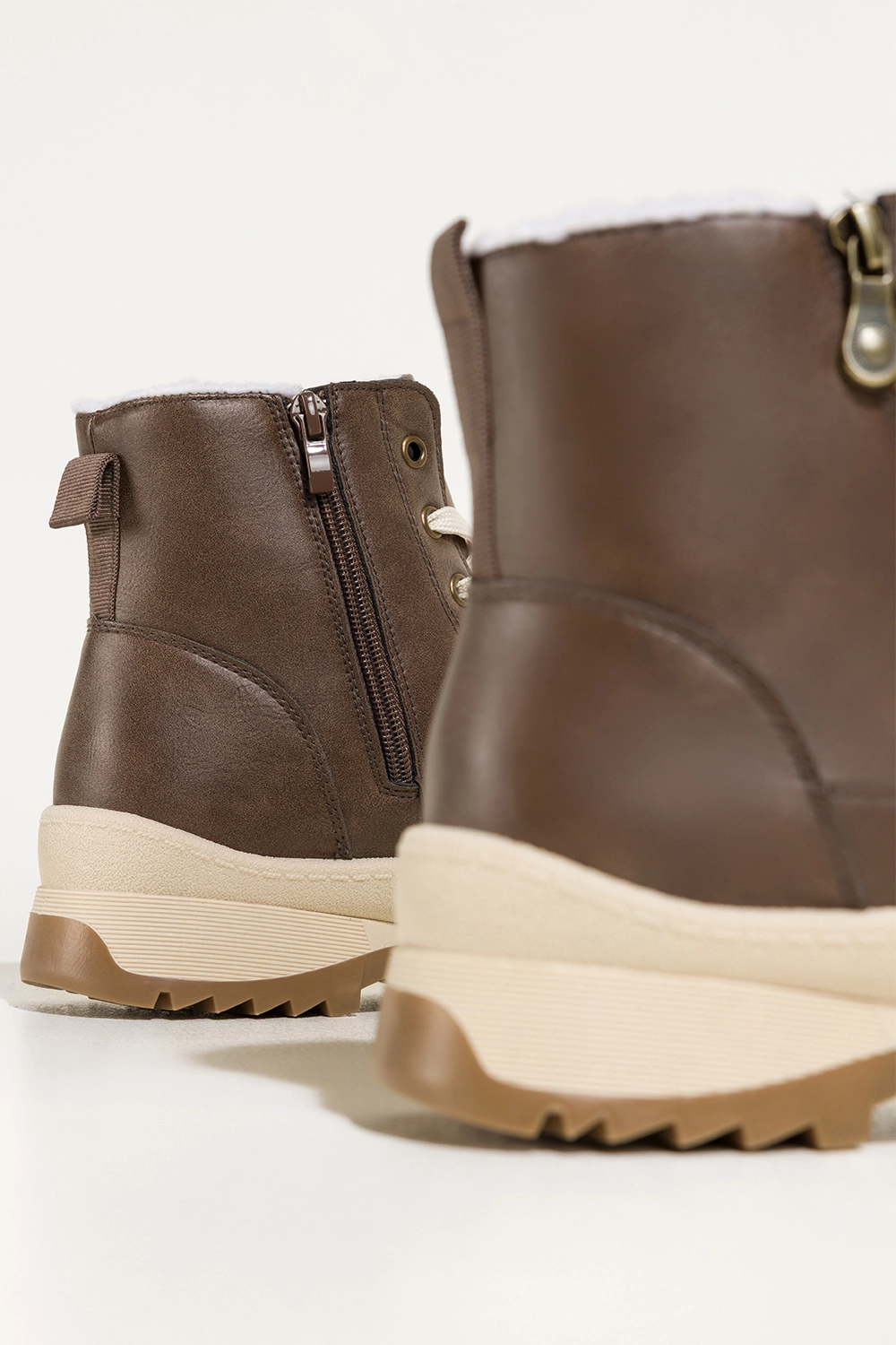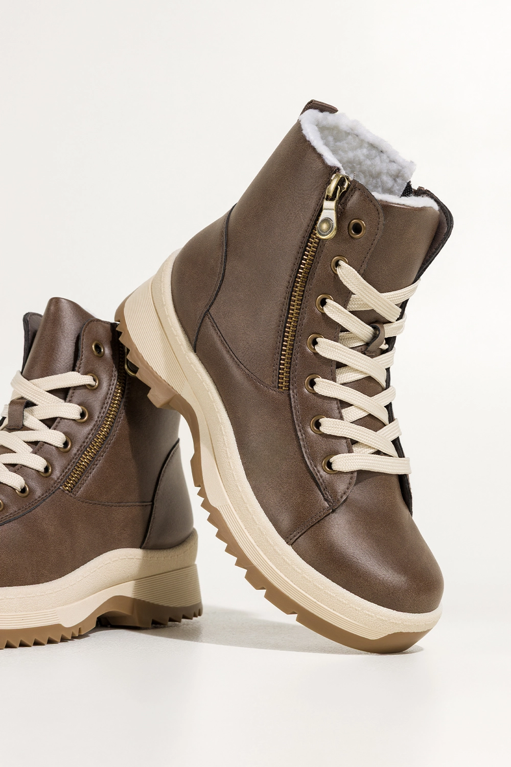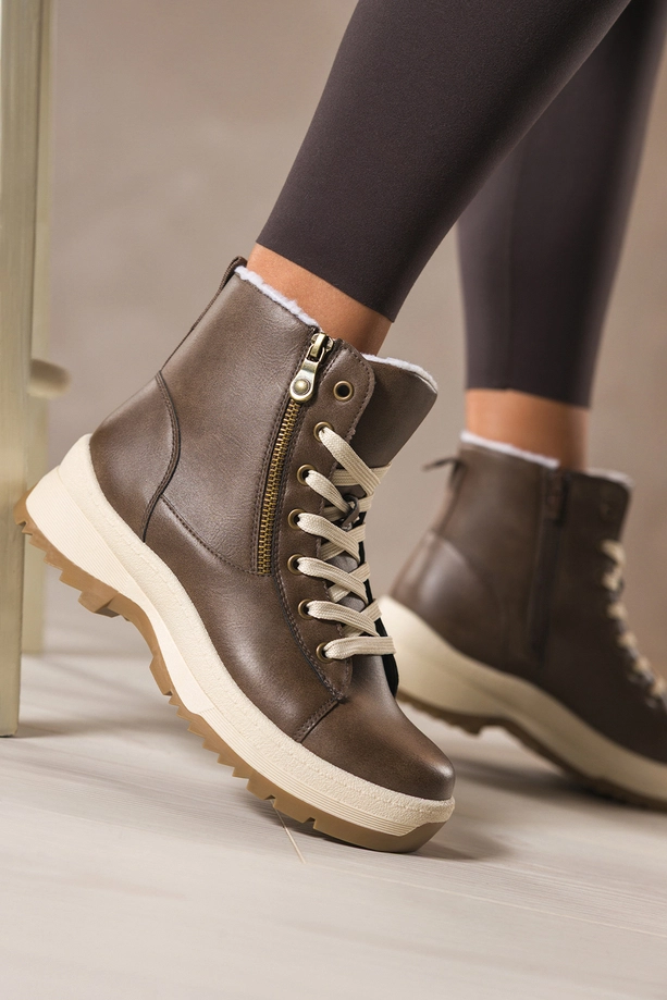 Brązowe botki damskie na bieżnikowanej elastycznej platformie ozdobny zamek na cholewce sznurowane Casu model 1912-6. Wykonane z wysokogatunkowej skóry ekologicznej, zachwycają trwałością i odpornością na zmienne warunki pogodowe. Ich wnętrze zostało ocieplone miękkim, przyjemnym w dotyku kożuszkiem, który gwarantuje ciepło nawet w najchłodniejsze dni. Dzięki zaokrąglonemu noskowi oraz elastycznej platformie z bieżnikiem, model zapewnia wygodę i stabilność przy każdym kroku.