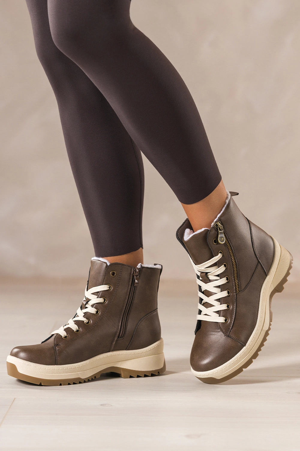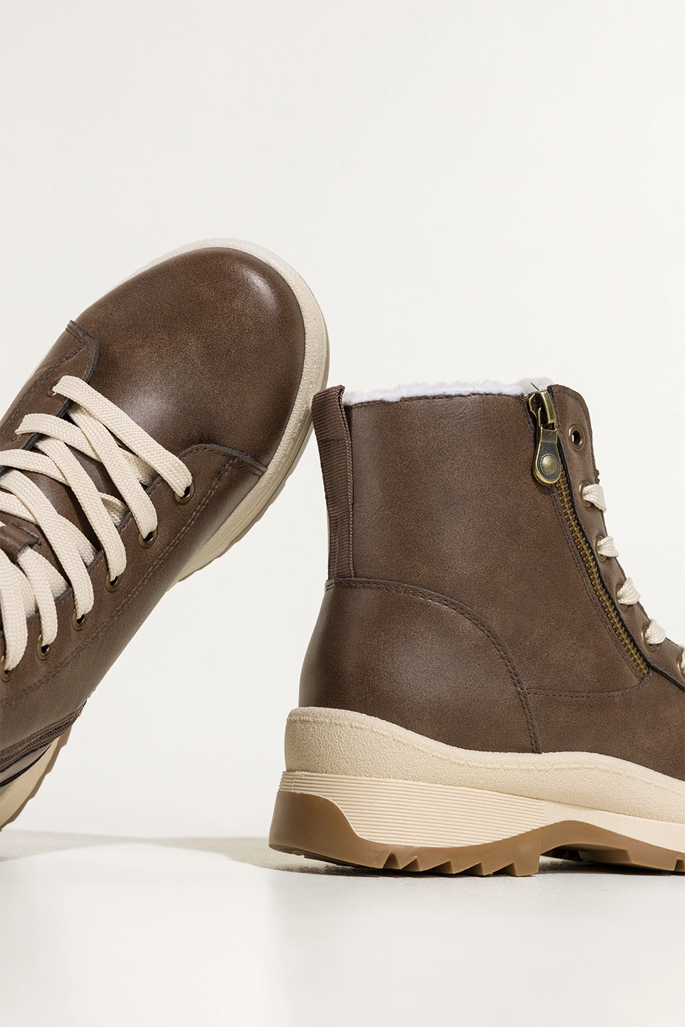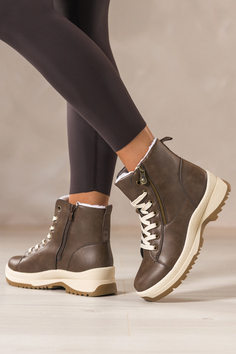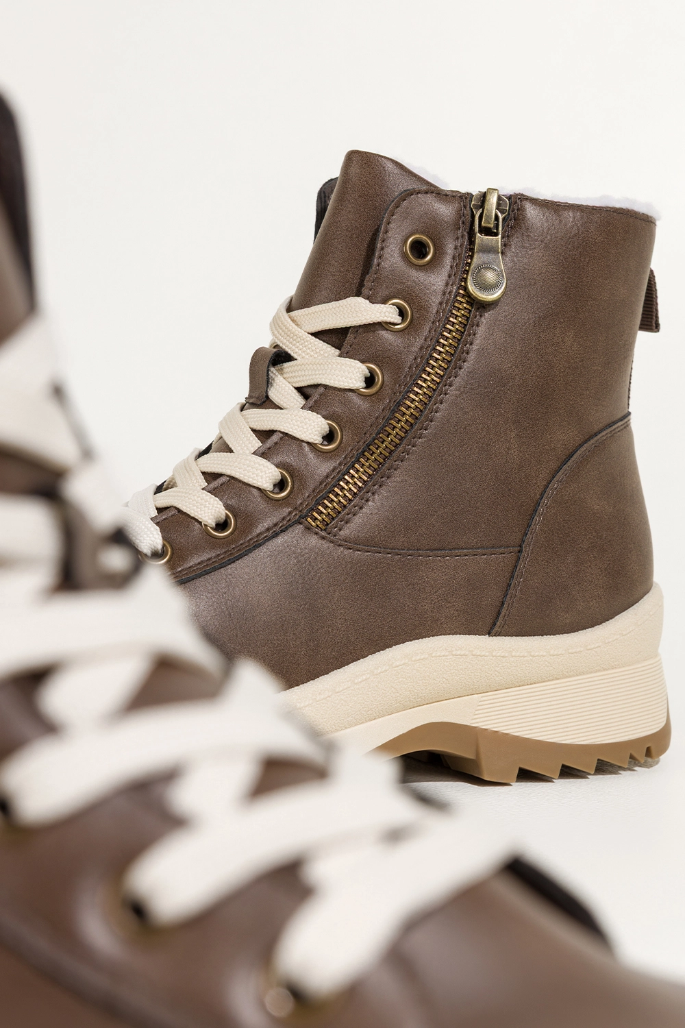 Brązowe botki damskie na bieżnikowanej elastycznej platformie ozdobny zamek na cholewce sznurowane Casu model 1912-6. Wykonane z wysokogatunkowej skóry ekologicznej, zachwycają trwałością i odpornością na zmienne warunki pogodowe. Ich wnętrze zostało ocieplone miękkim, przyjemnym w dotyku kożuszkiem, który gwarantuje ciepło nawet w najchłodniejsze dni. Dzięki zaokrąglonemu noskowi oraz elastycznej platformie z bieżnikiem, model zapewnia wygodę i stabilność przy każdym kroku.