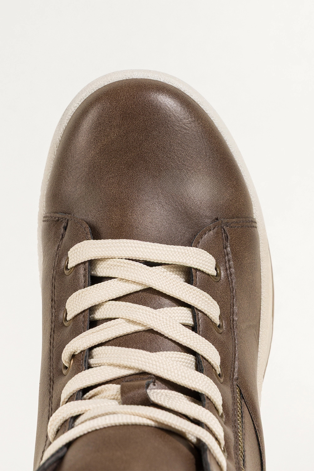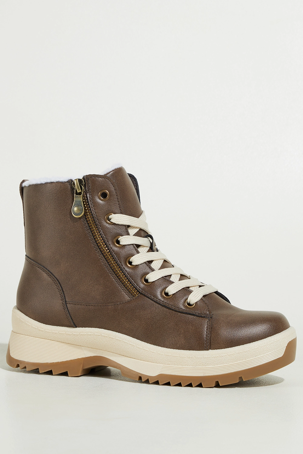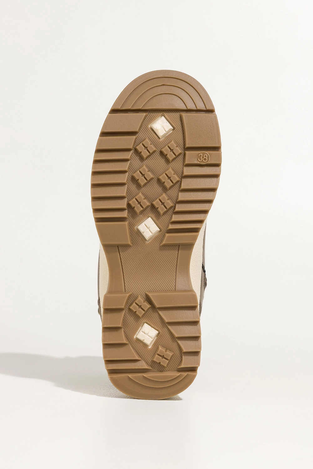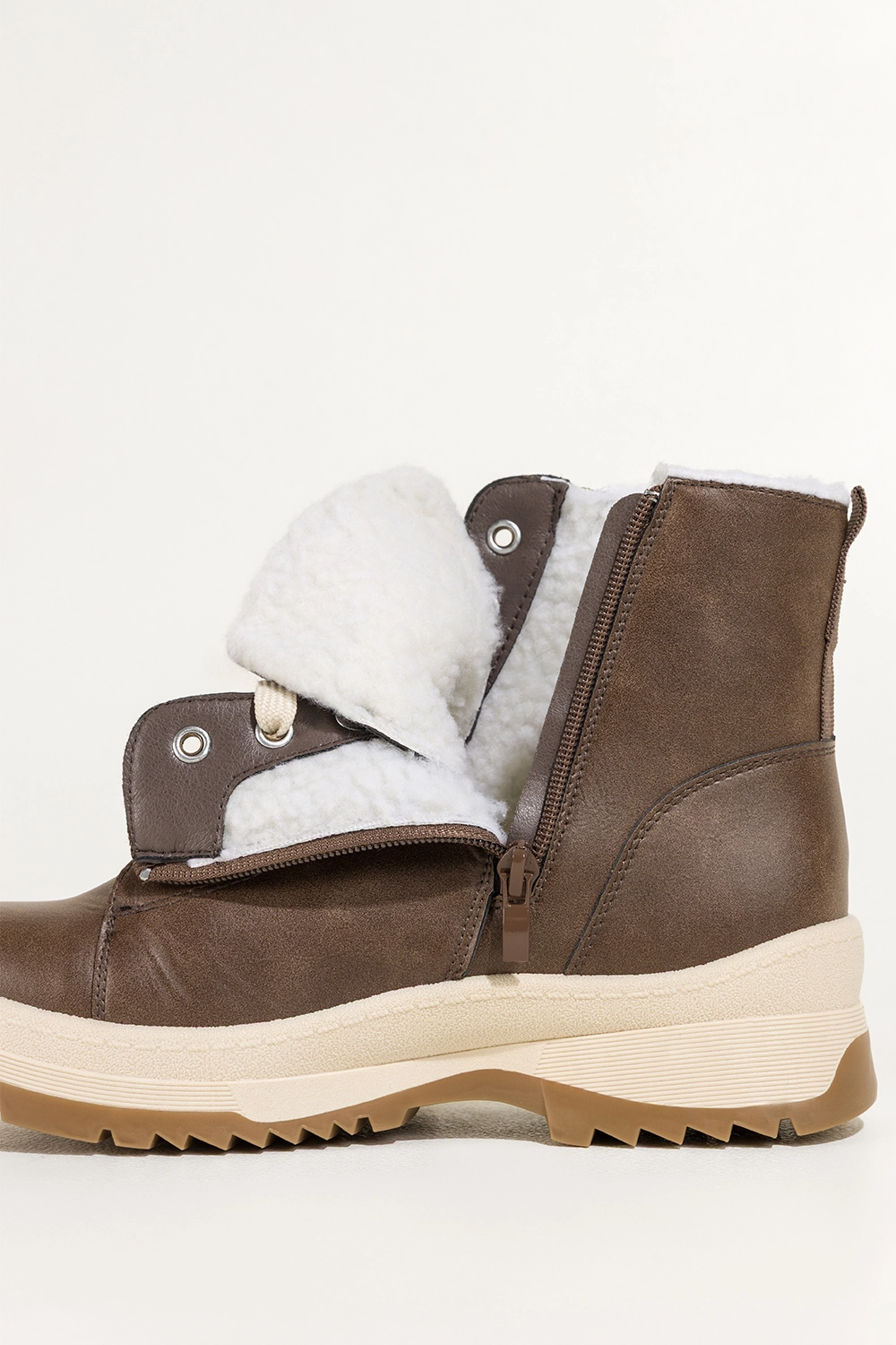Brązowe botki damskie na bieżnikowanej elastycznej platformie ozdobny zamek na cholewce sznurowane Casu model 1912-6. Wykonane z wysokogatunkowej skóry ekologicznej, zachwycają trwałością i odpornością na zmienne warunki pogodowe. Ich wnętrze zostało ocieplone miękkim, przyjemnym w dotyku kożuszkiem, który gwarantuje ciepło nawet w najchłodniejsze dni. Dzięki zaokrąglonemu noskowi oraz elastycznej platformie z bieżnikiem, model zapewnia wygodę i stabilność przy każdym kroku.