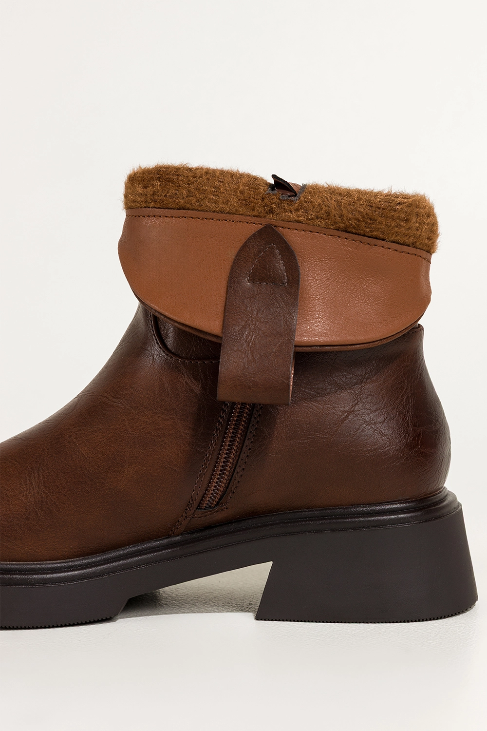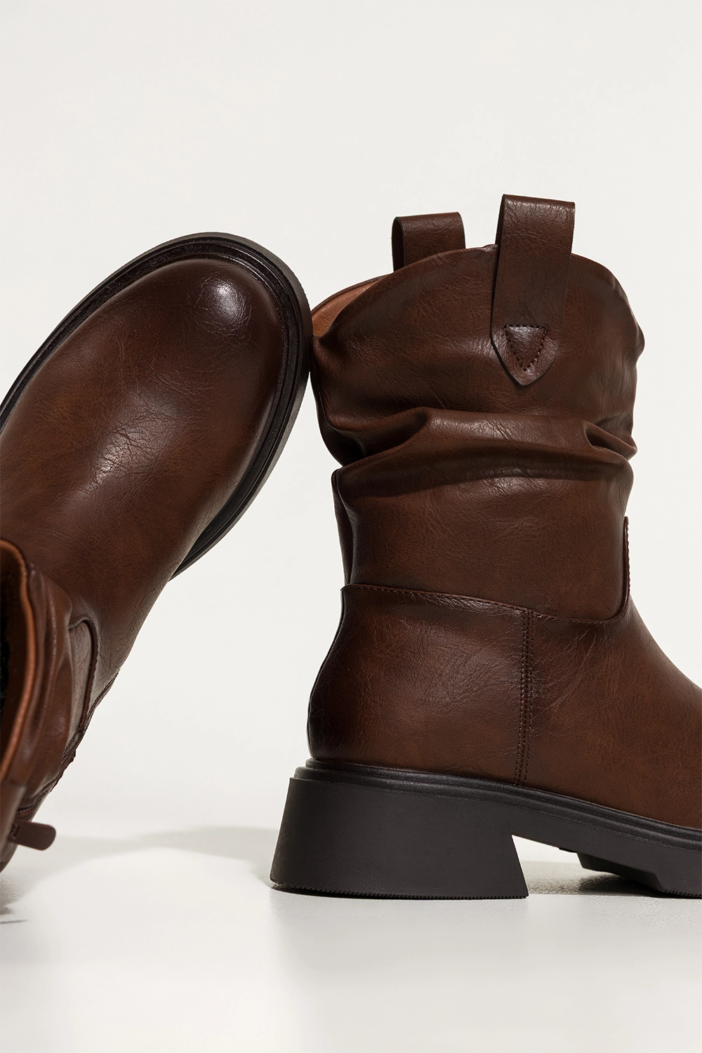 Brązowe botki damskie na niskim klocku marszczona cholewka z wycięciami Casu model 1851. Wykonane z wysokogatunkowej skóry ekologicznej, zapewniają trwałość i estetykę. Ocieplone miękkim futerkiem. Zaokrąglony nosek oraz ergonomiczna konstrukcja sprawiają, że buty idealnie dopasowują się do stopy, zapewniając wygodę przez cały dzień.