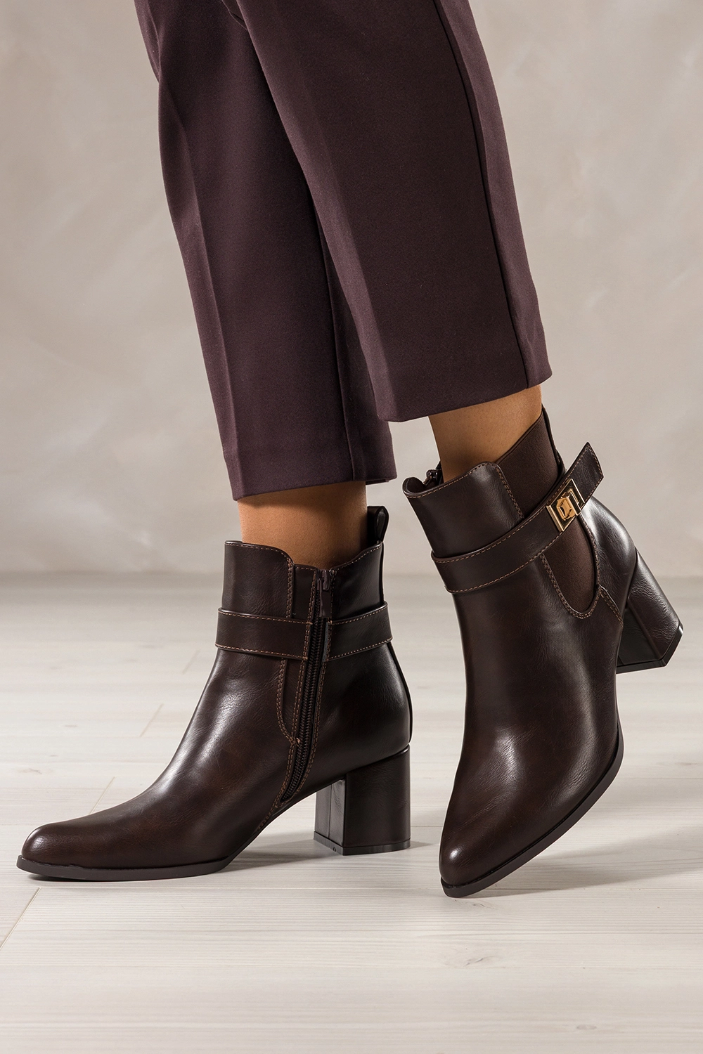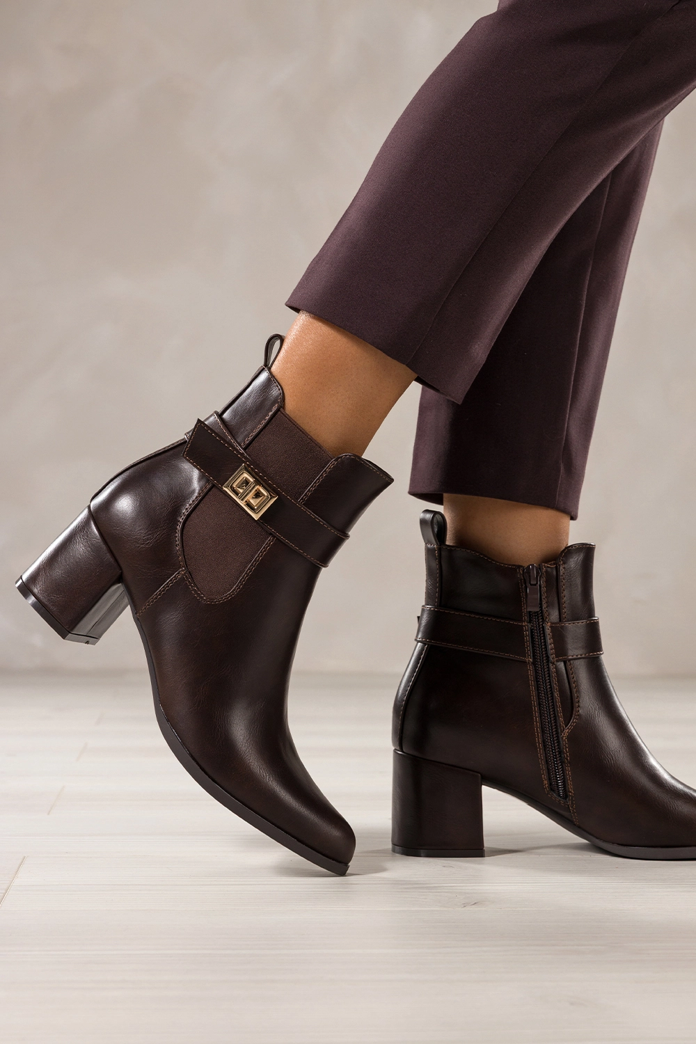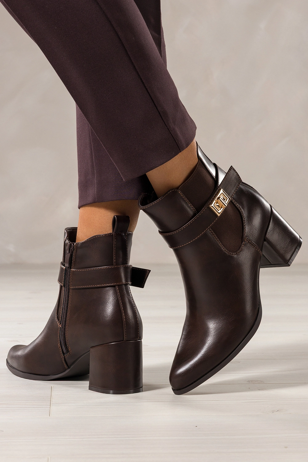 Brązowe botki damskie na szerokim słupku guma w cholewce pasek ze złotą ozdobą Carla model 4160 to nie tylko modowy akcent, ale przede wszystkim synonim komfortu i funkcjonalności na co dzień. Wykonane z wysokogatunkowej skóry ekologicznej, łączą w sobie wyjątkową estetykę z troską o detale i wygodę użytkowania. Te botki to idealna propozycja dla kobiet, które cenią sobie szykowny wygląd bez kompromisów w kwestii komfortu. Ocieplenie w postaci miękkiego futerka oraz staranne wykończenie sprawiają, że sprawdzą się doskonale w sezonie jesienno-zimowym, zapewniając ciepło i styl niezależnie od pogody. Stabilny, szeroki słupek pokryty skórą ekologiczną to gwarancja wygodnego chodzenia przez wiele godzin, bez obawy o zmęczenie stóp. Dodatkowym atutem jest funkcjonalny zamek po wewnętrznej stronie cholewki, który ułatwia zakładanie obuwia, a elastyczna brązowa guma zapewnia lepsze dopasowanie do łydki.