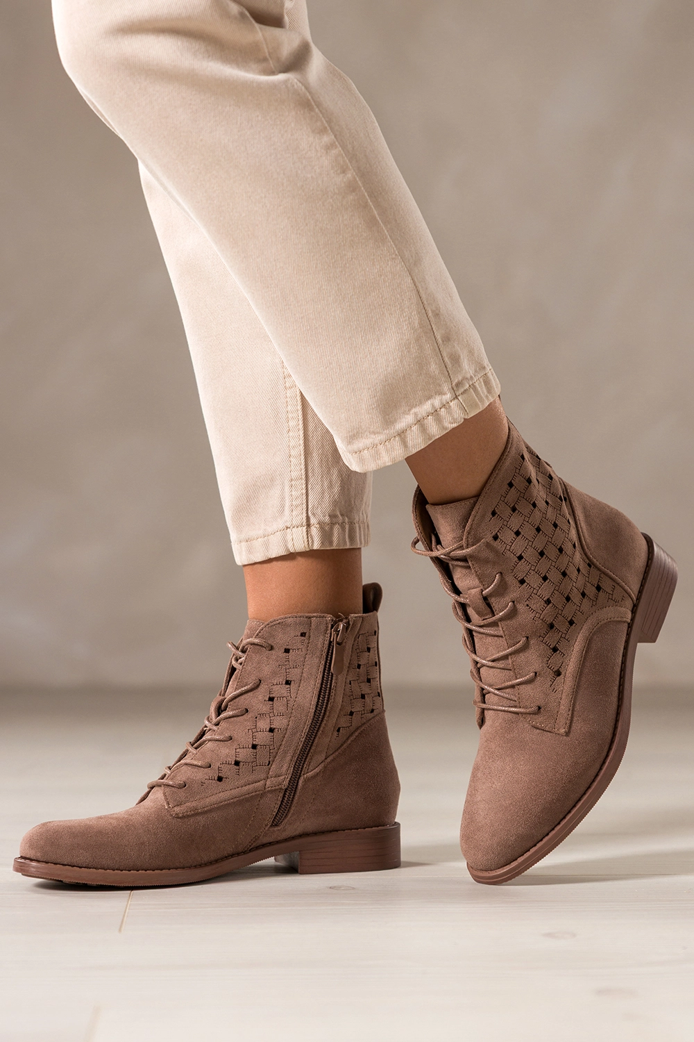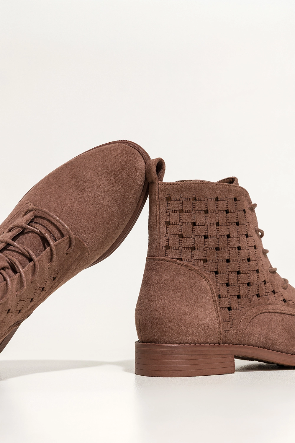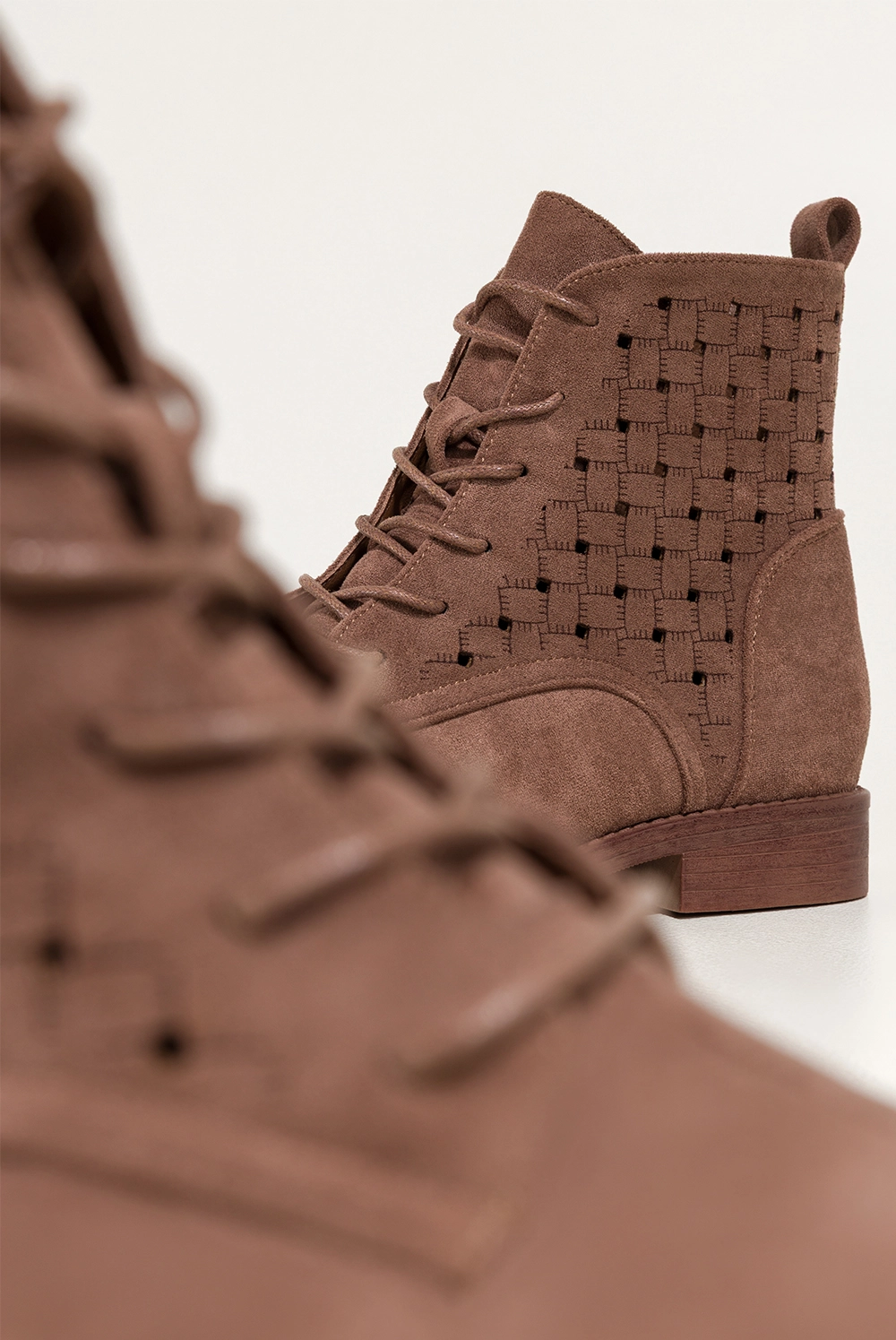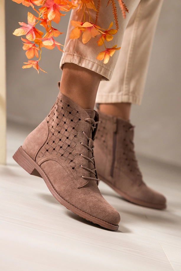 Brązowe botki damskie płaskie ażurowa cholewka sznurowane Carla S7474-6 to model, który został dopracowany w każdym detalu. Głęboki, szlachetny odcień brązu pięknie współgra z delikatną fakturą zamszu ekologicznego, a ażurowa cholewka dodaje całości lekkości i nowoczesnego charakteru. Smukła linia buta, zaokrąglony nosek oraz subtelne sznurowanie na przodzie tworzą spójną, kobiecą formę, która przyciąga spojrzenia i doskonale wpisuje się w sezon przejściowy.