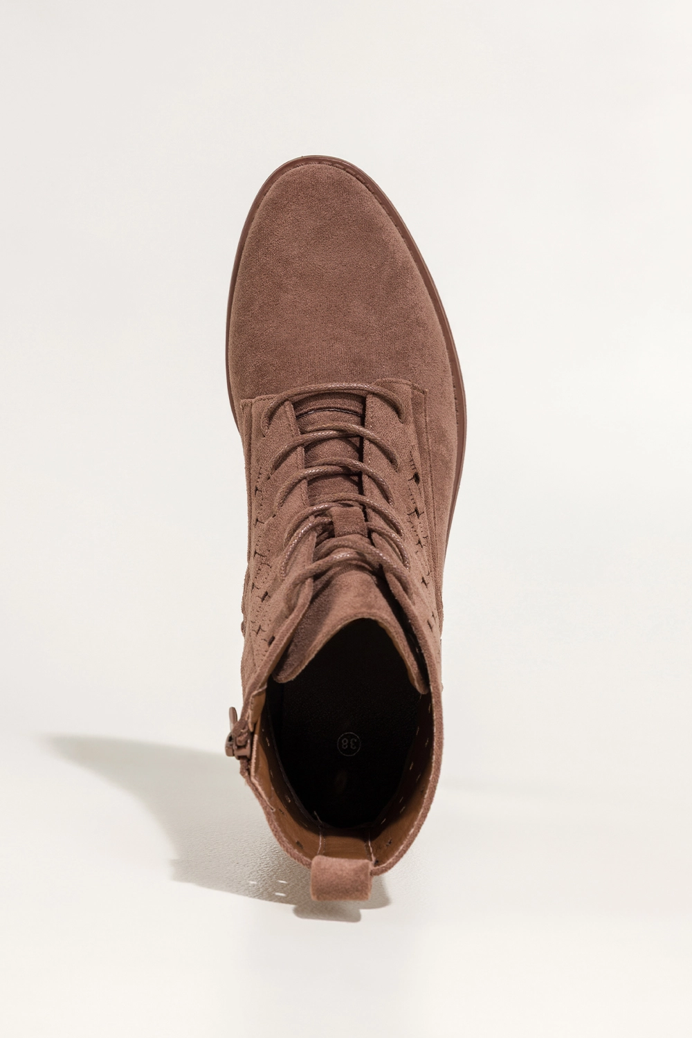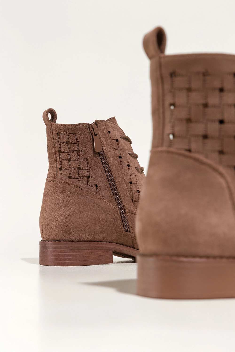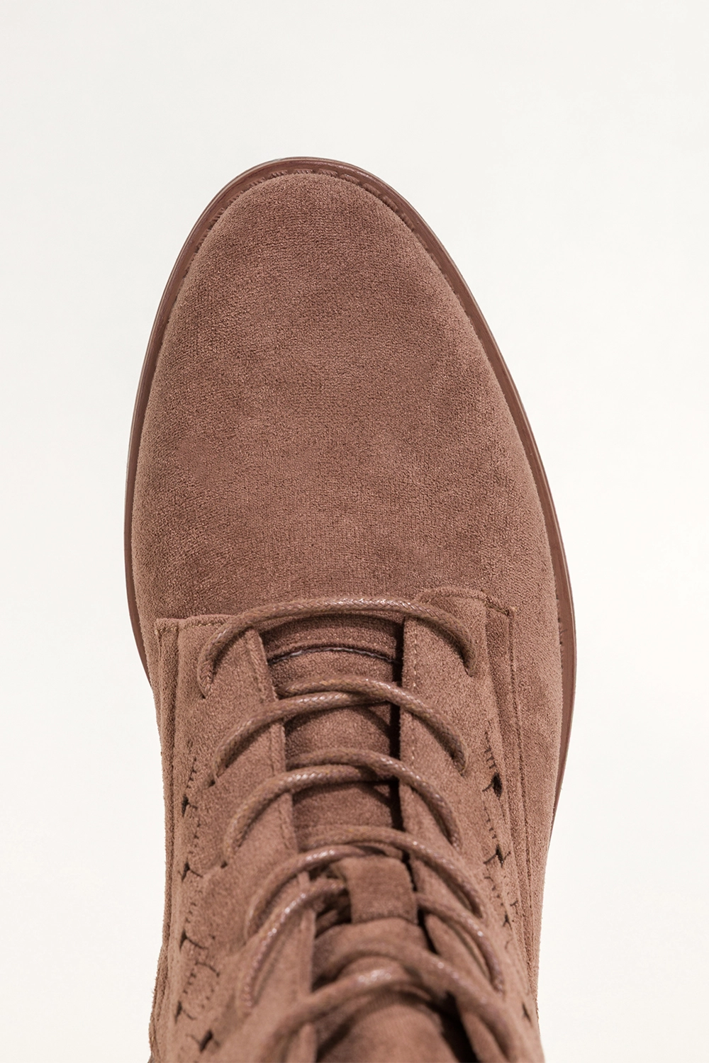Brązowe botki damskie płaskie ażurowa cholewka sznurowane Carla S7474-6 to model, który został dopracowany w każdym detalu. Głęboki, szlachetny odcień brązu pięknie współgra z delikatną fakturą zamszu ekologicznego, a ażurowa cholewka dodaje całości lekkości i nowoczesnego charakteru. Smukła linia buta, zaokrąglony nosek oraz subtelne sznurowanie na przodzie tworzą spójną, kobiecą formę, która przyciąga spojrzenia i doskonale wpisuje się w sezon przejściowy.