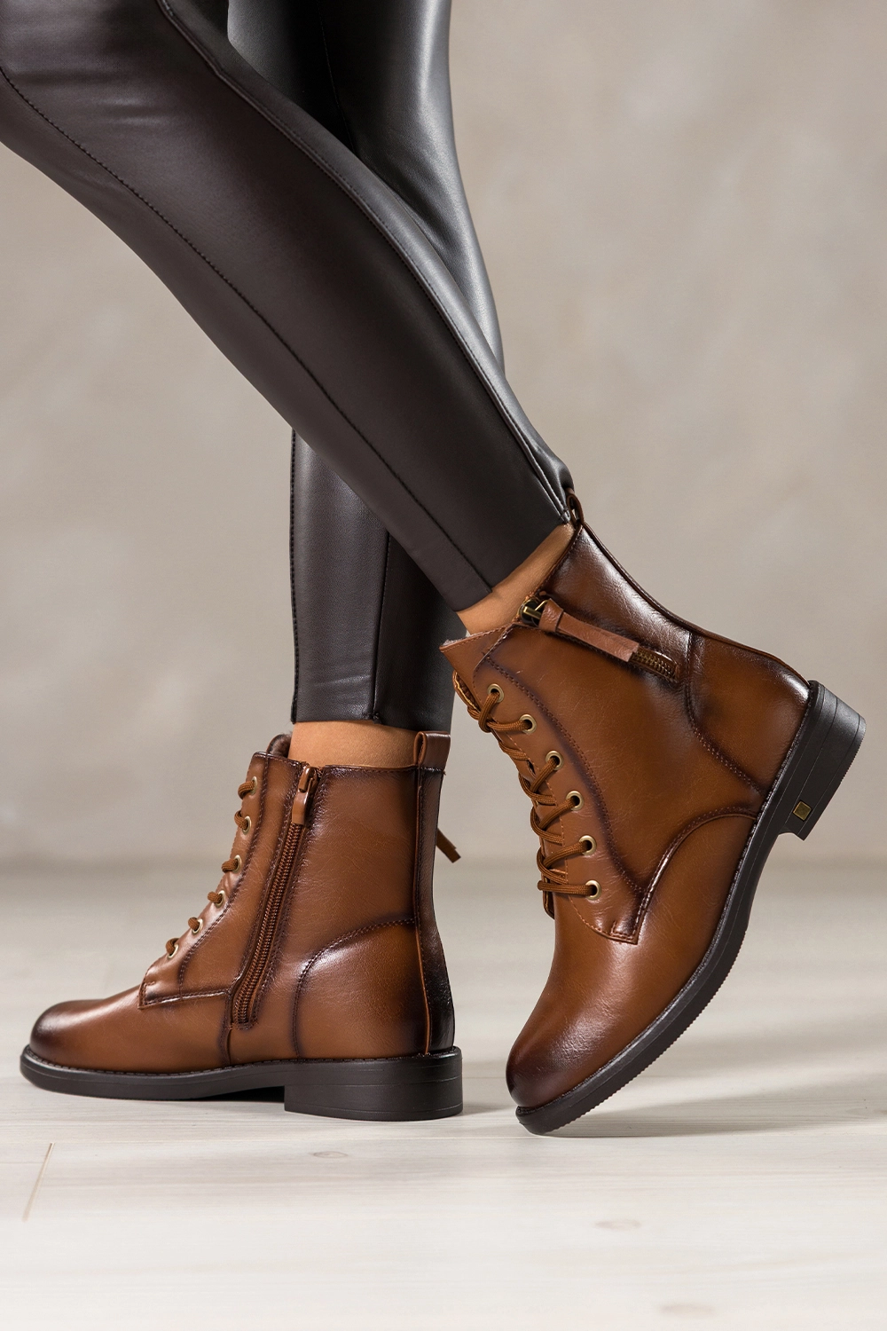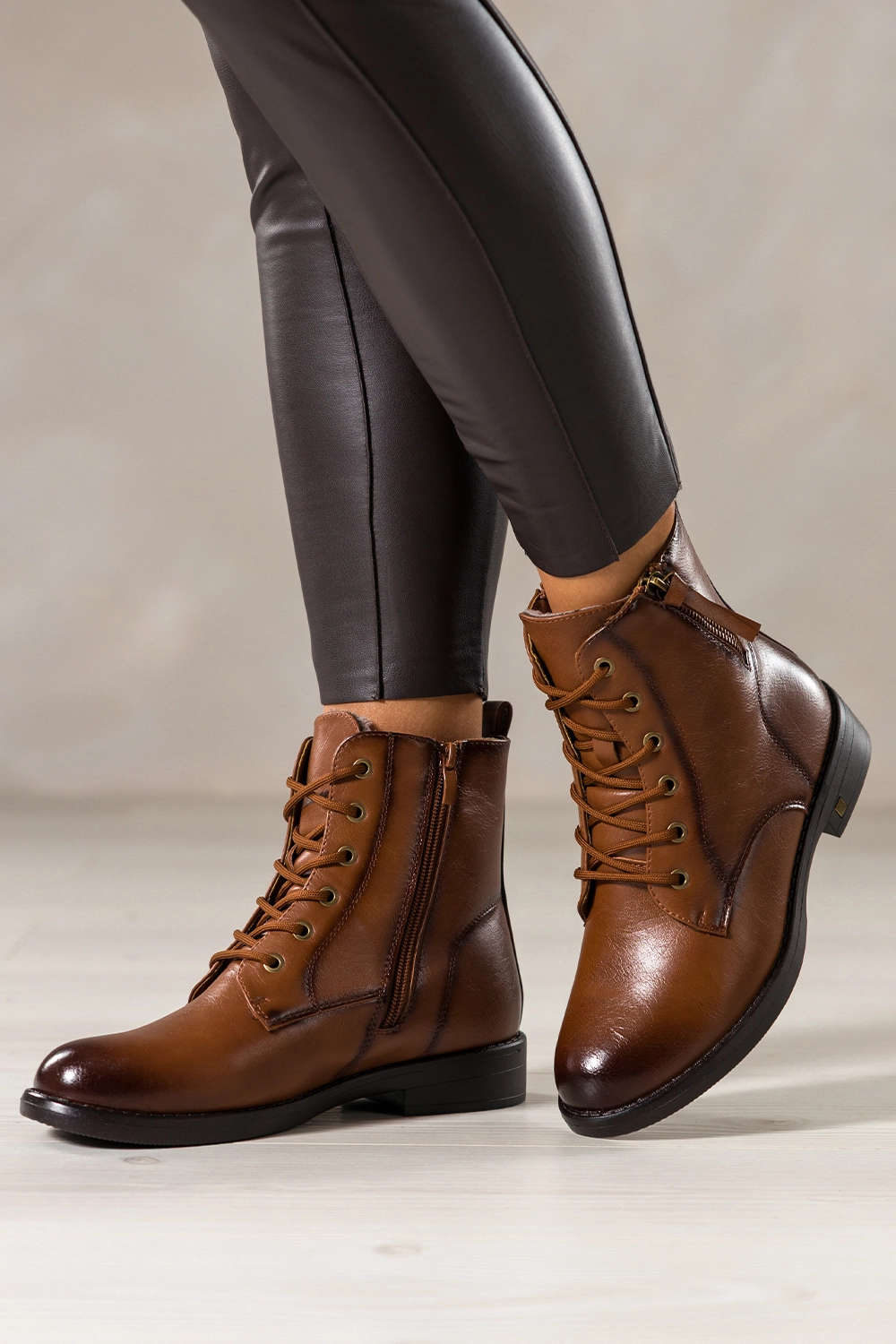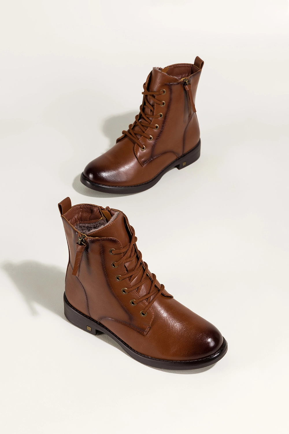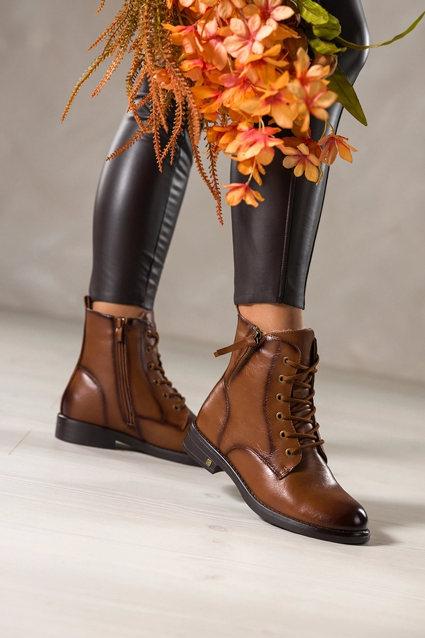 Brązowe botki damskie płaskie na cholewce ozdobny zamek sznurowane Casu model 7080-6. Wykonane z wysokogatunkowej skóry ekologicznej, zachwycają nie tylko trwałością, ale też eleganckim wykończeniem, które świetnie komponuje się z jesienno-zimowymi stylizacjami. Wnętrze ocieplone przyjemnym w dotyku futerkiem zapewnia ciepło nawet w najchłodniejsze dni, gwarantując komfort codziennego użytkowania. To idealny wybór dla kobiet ceniących praktyczne i estetyczne rozwiązania w codziennej garderobie.