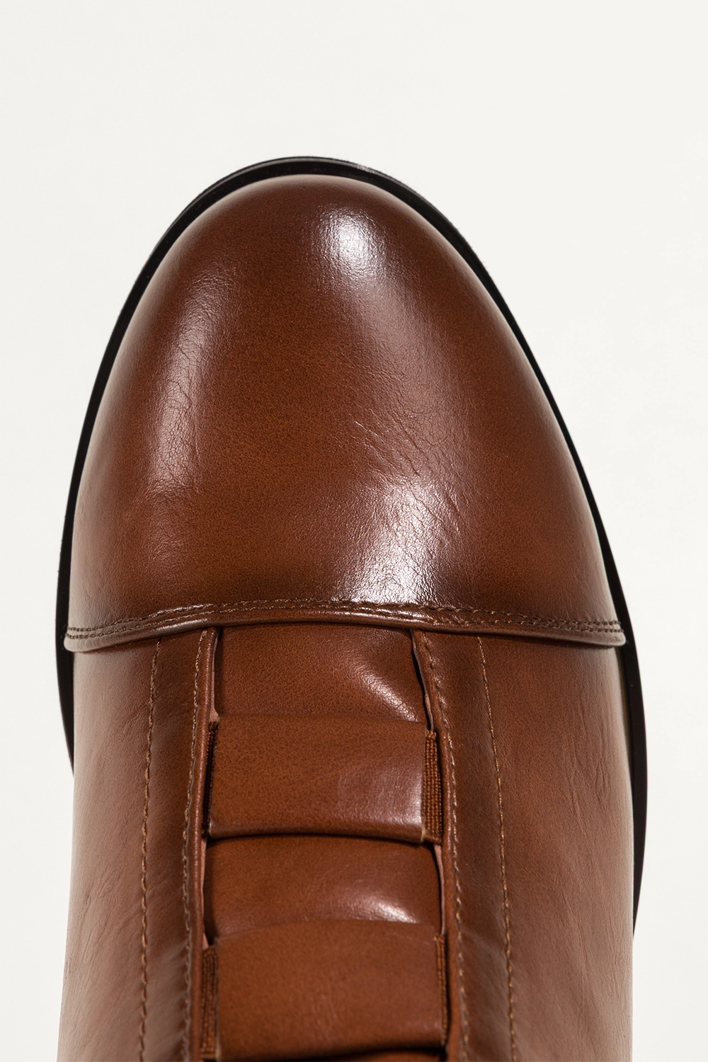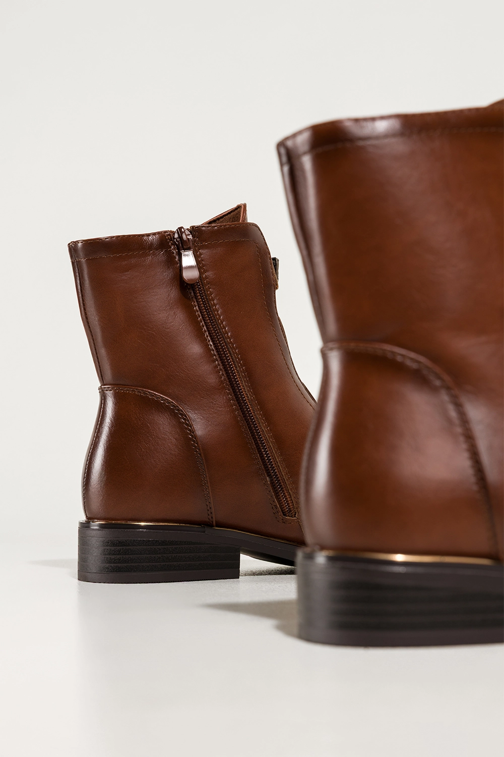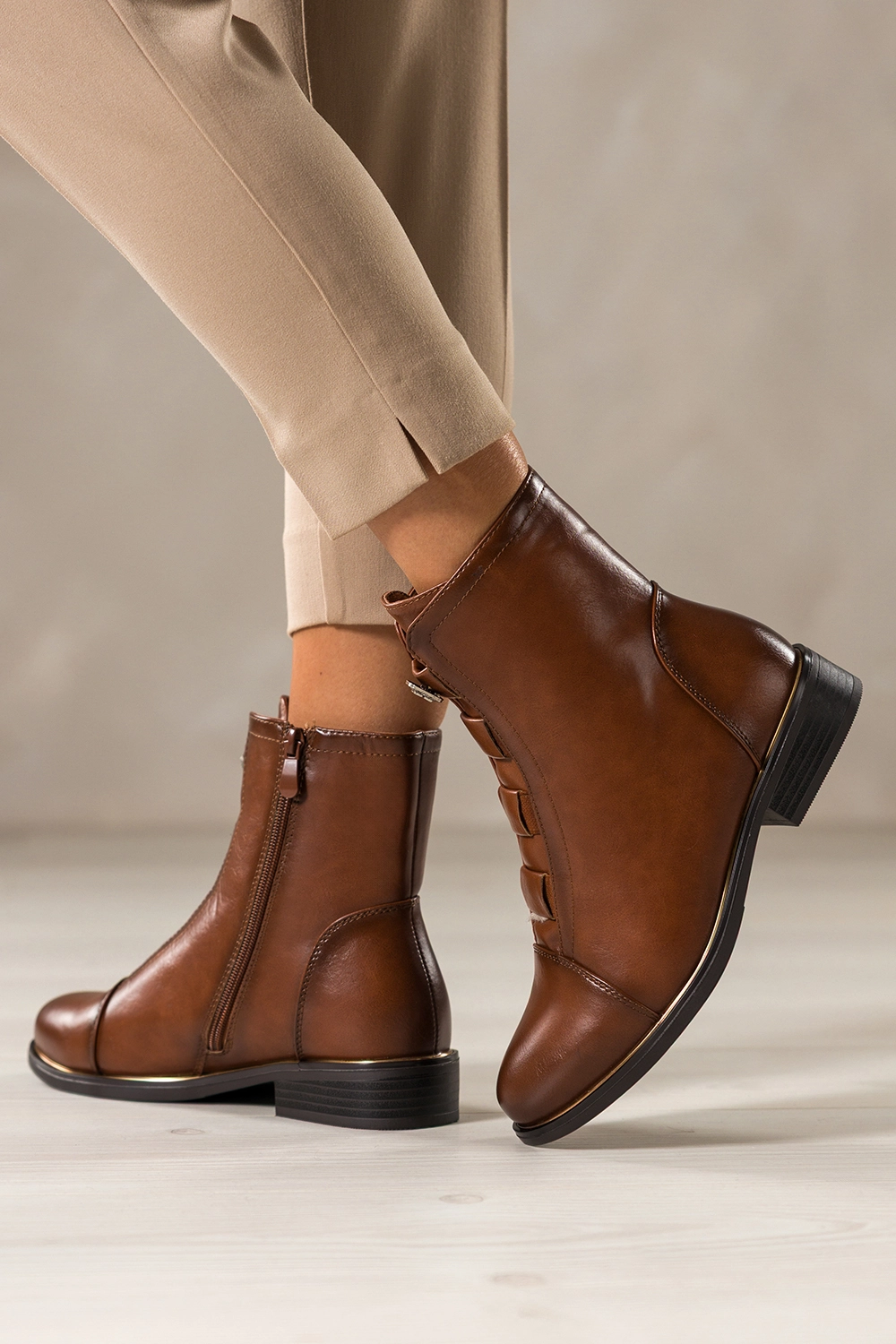 Płaska podeszwa ze złotym otokiem oraz niski obcas w formie wygodnego klocka gwarantują stabilność i swobodę ruchu, a zaokrąglony nosek dodaje kobiecego uroku. Zapięcie na zamek i elastyczne gumy umieszczone na przodzie ułatwiają zakładanie i dopasowanie botków do stopy, a srebrna ozdoba w subtelny sposób przełamuje klasykę, dodając nowoczesnego sznytu. Świetnie komponują się zarówno z casualowymi jeansami, jak i bardziej eleganckimi stylizacjami z sukienką czy spódnicą.