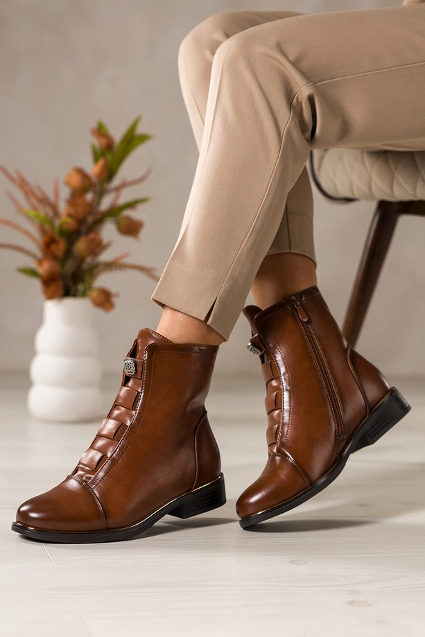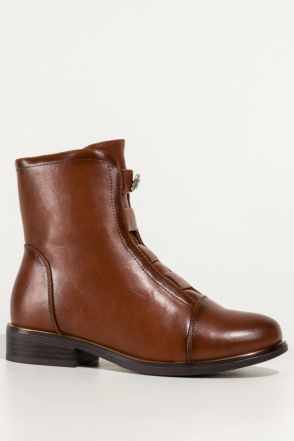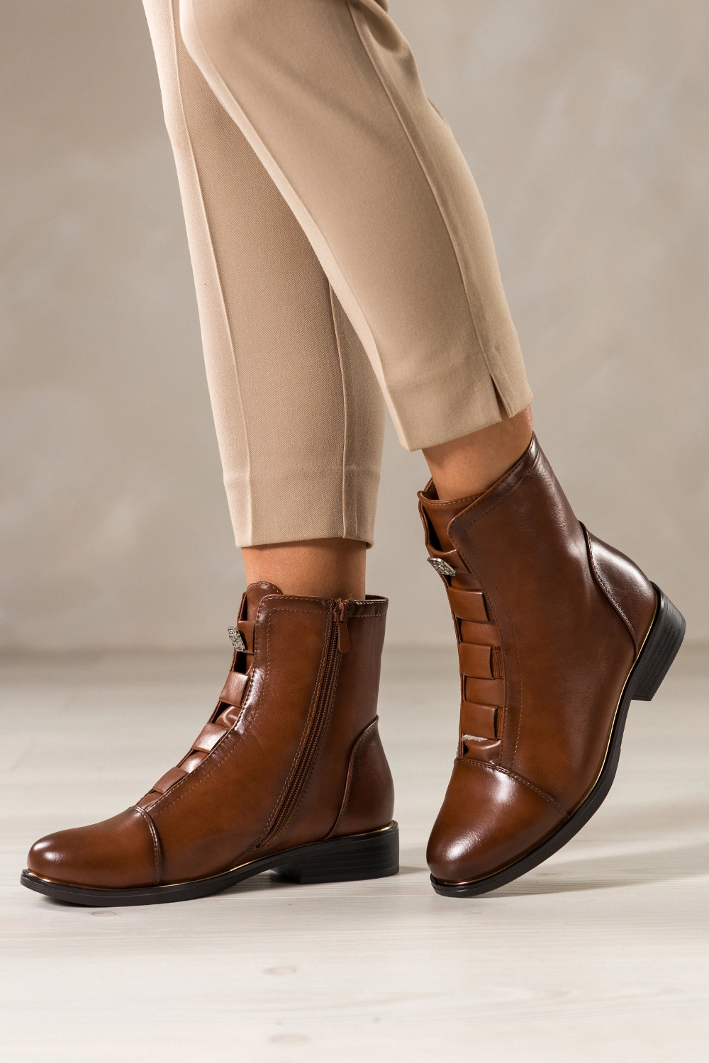 Brązowe botki damskie płaskie srebrna ozdoba elastyczne gumy na przodzie Casu model HT-062-7. Wykonane z miękkiej, wysokogatunkowej skóry ekologicznej, zapewniają wygodę noszenia przez cały dzień, a jednocześnie dbają o środowisko. Wnętrze zostało starannie ocieplone delikatnym futerkiem, które otula stopy ciepłem nawet w chłodniejsze dni.