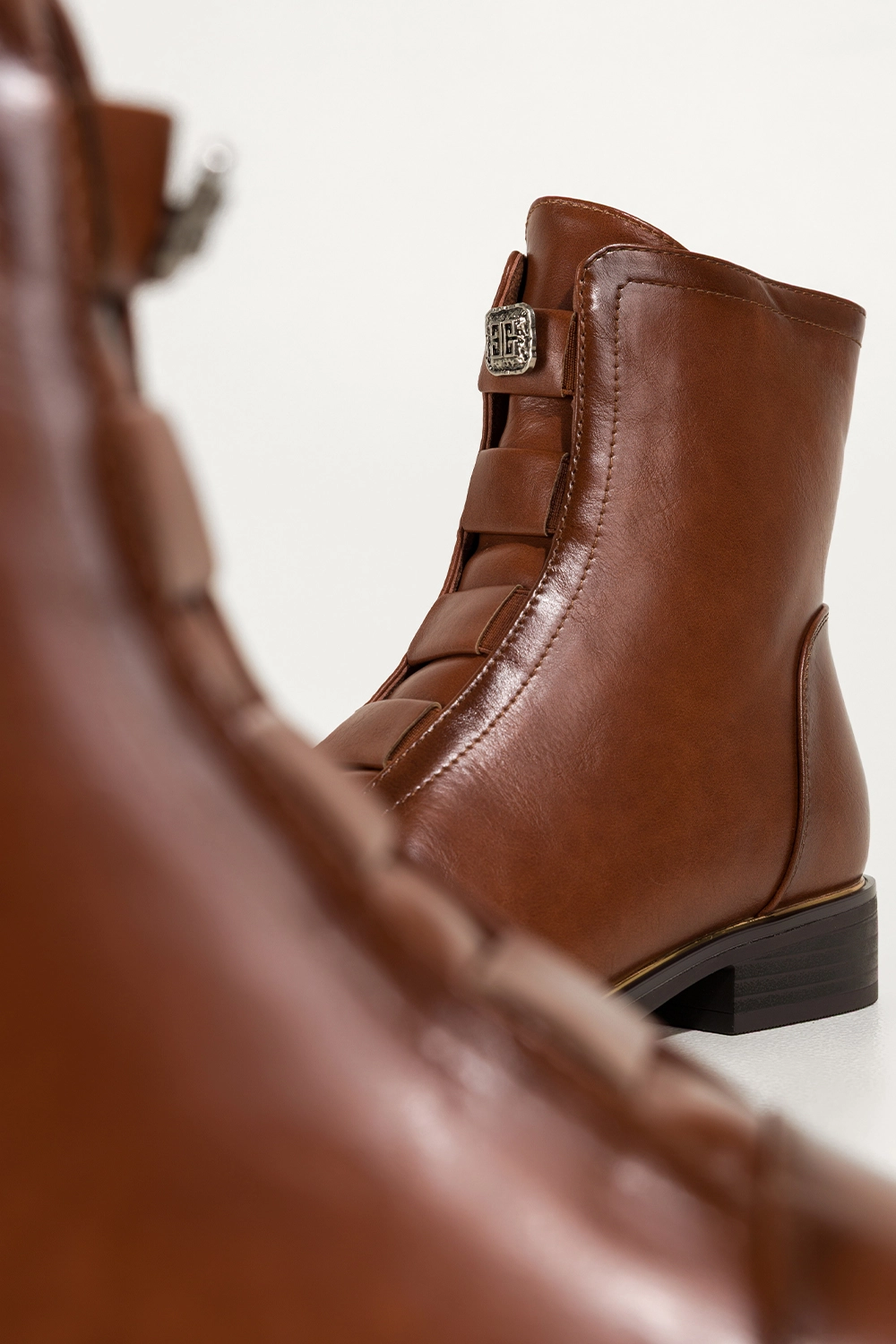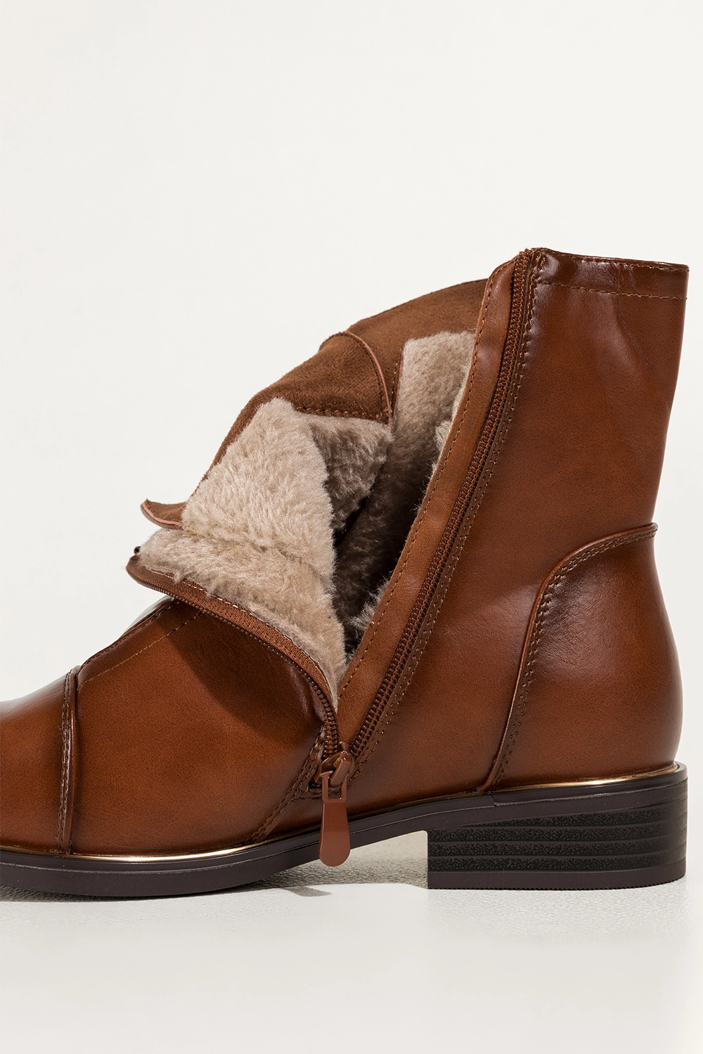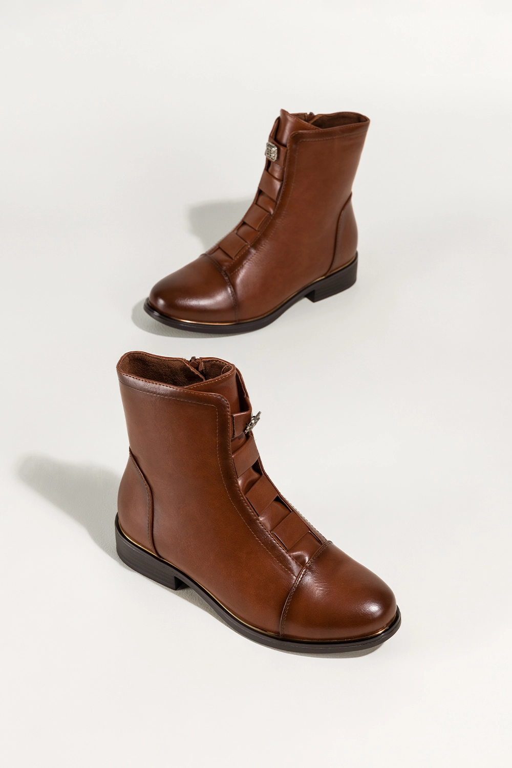 Brązowe botki damskie płaskie srebrna ozdoba elastyczne gumy na przodzie Casu model HT-062-7. Wykonane z miękkiej, wysokogatunkowej skóry ekologicznej, zapewniają wygodę noszenia przez cały dzień, a jednocześnie dbają o środowisko. Wnętrze zostało starannie ocieplone delikatnym futerkiem, które otula stopy ciepłem nawet w chłodniejsze dni.