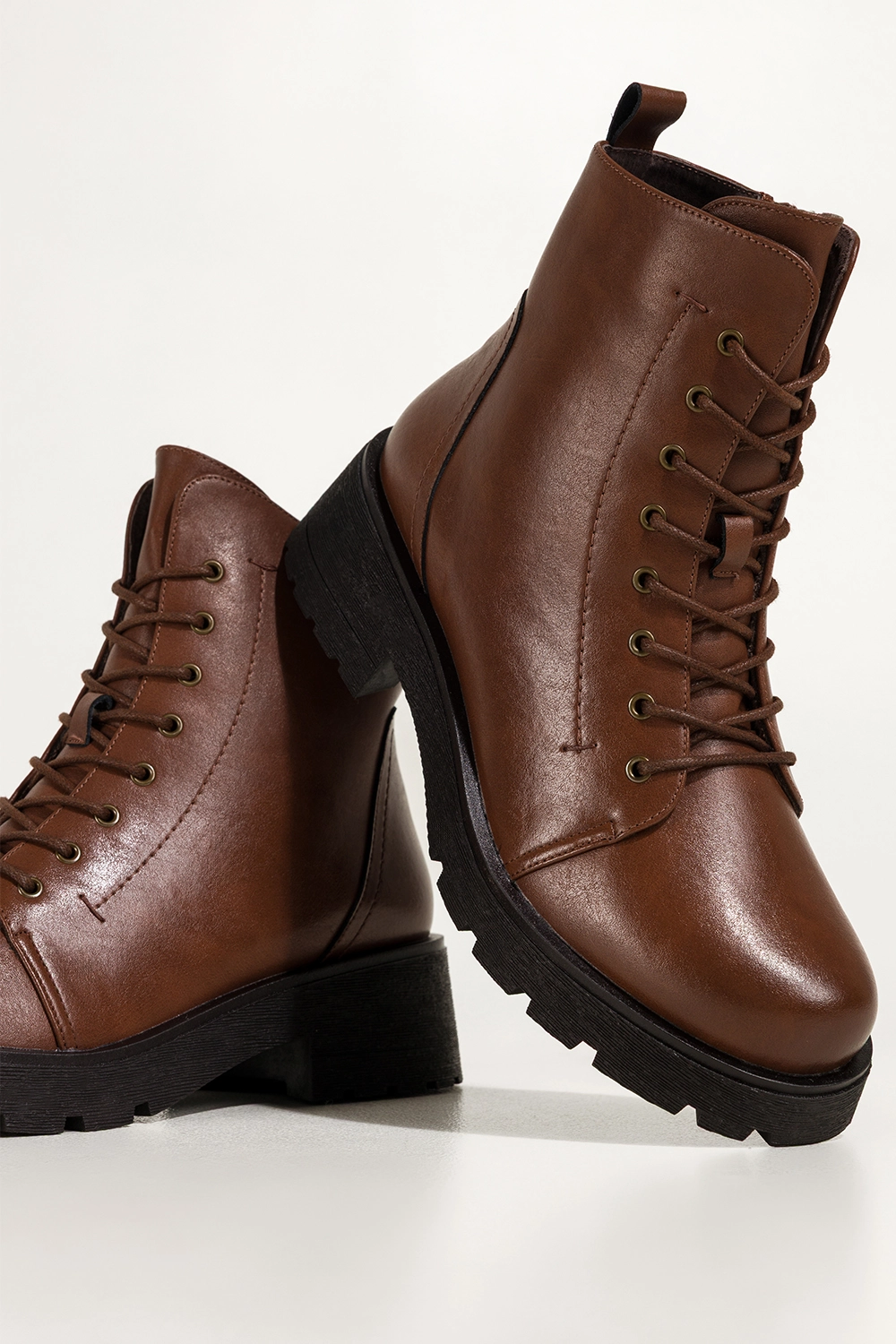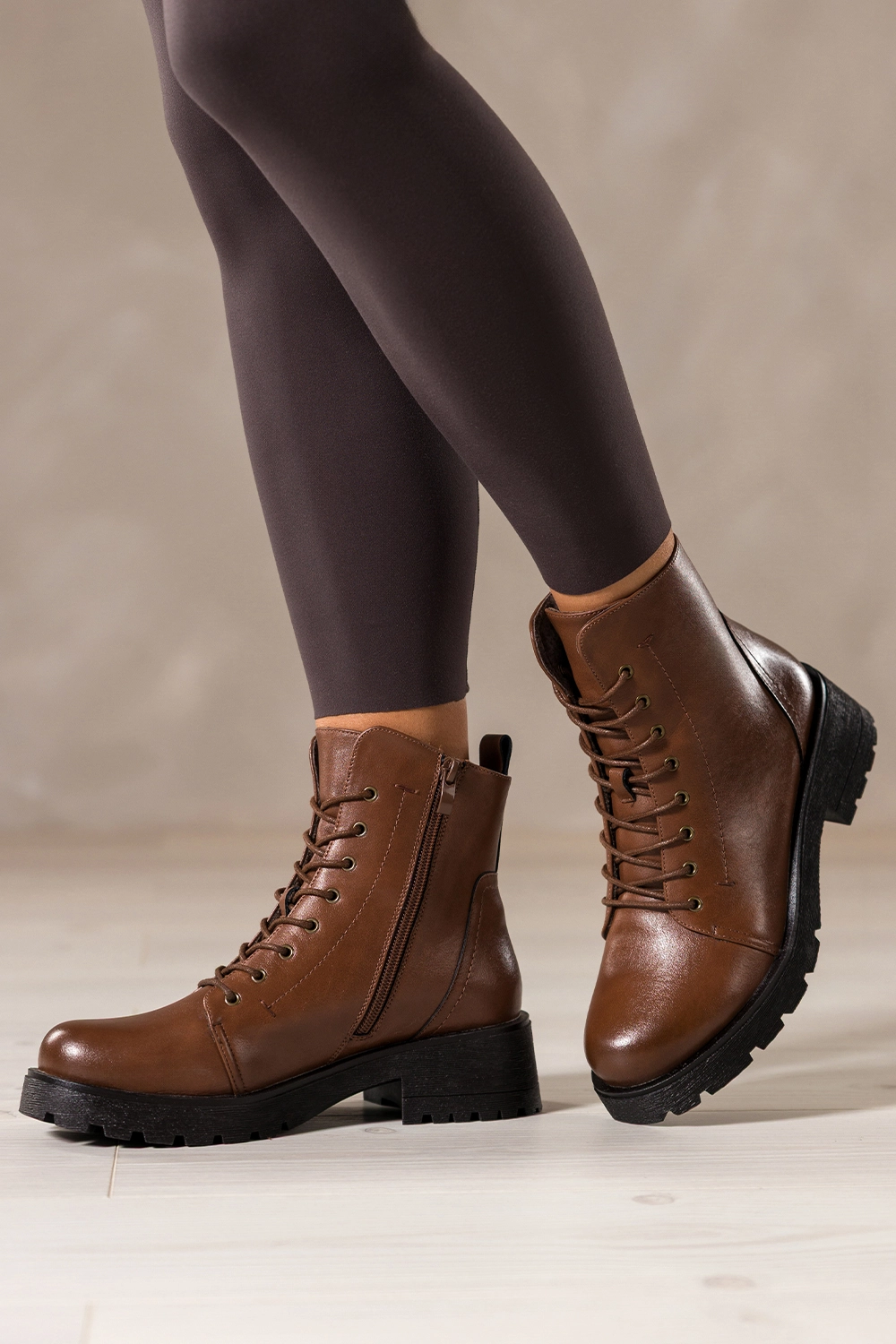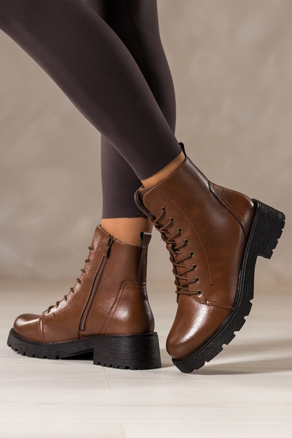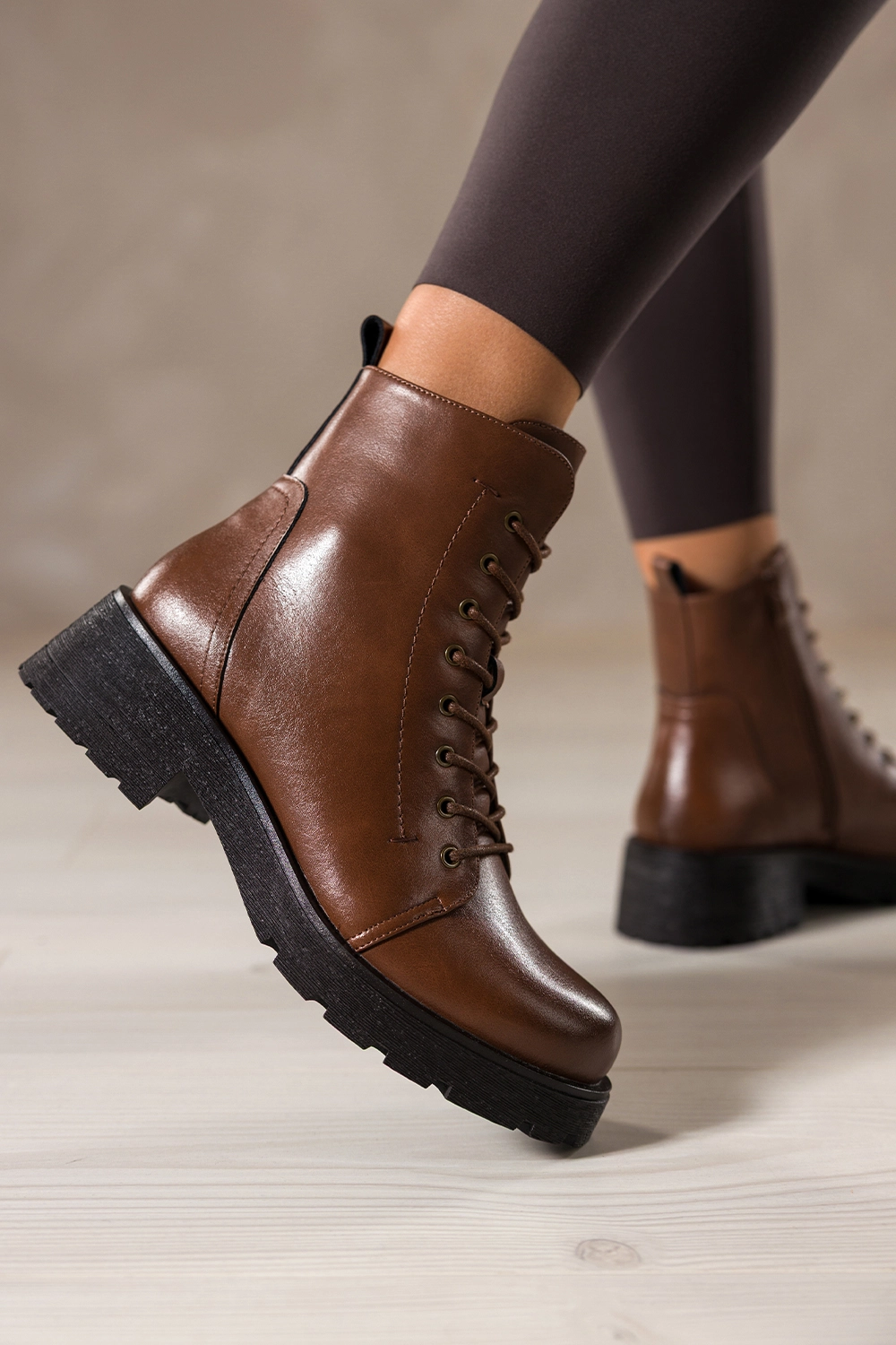 Brązowe botki skórzane damskie Sergio Leone na bieżnikowanej platformie ozdobne przeszycia na cholewce sznurowane model GI295-H. Wykonane z wysokogatunkowej, naturalnej skóry, zachwycają nie tylko stylowym wyglądem, ale i trwałością. Ich wnętrze zostało ocieplone miękkim futerkiem, które gwarantuje komfort i ciepło nawet w najchłodniejsze dni. Zaokrąglony nosek i perfekcyjnie wyprofilowana cholewka zapewniają wygodę noszenia przez cały dzień.