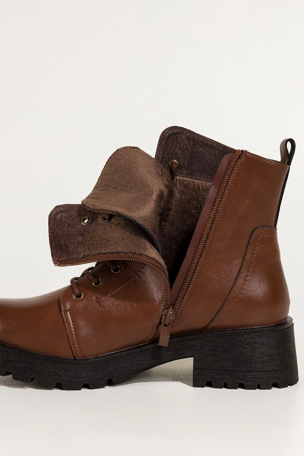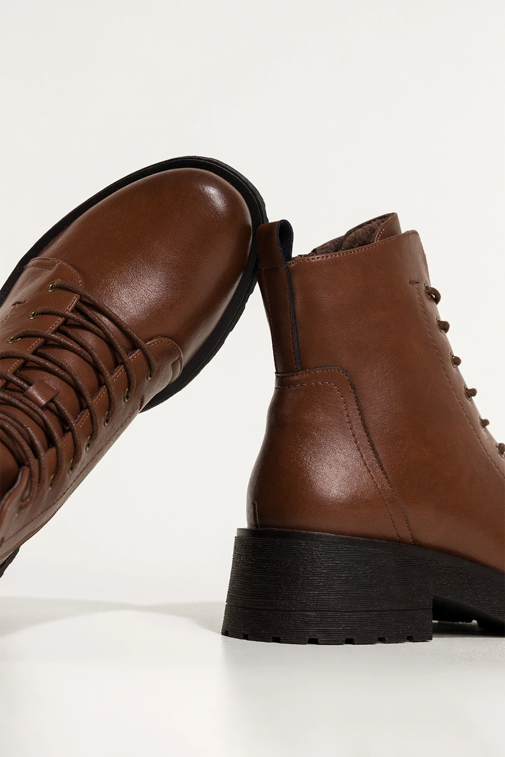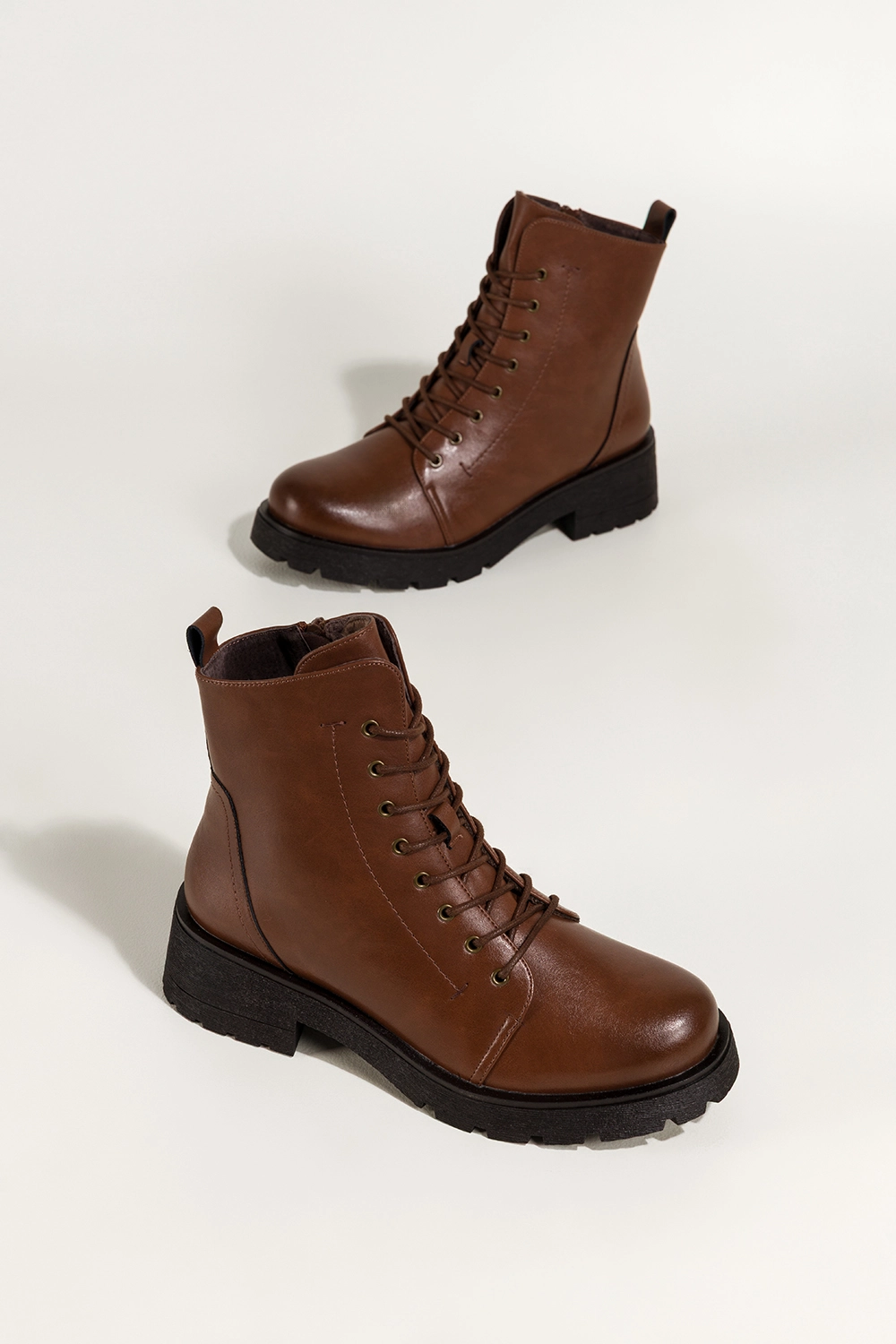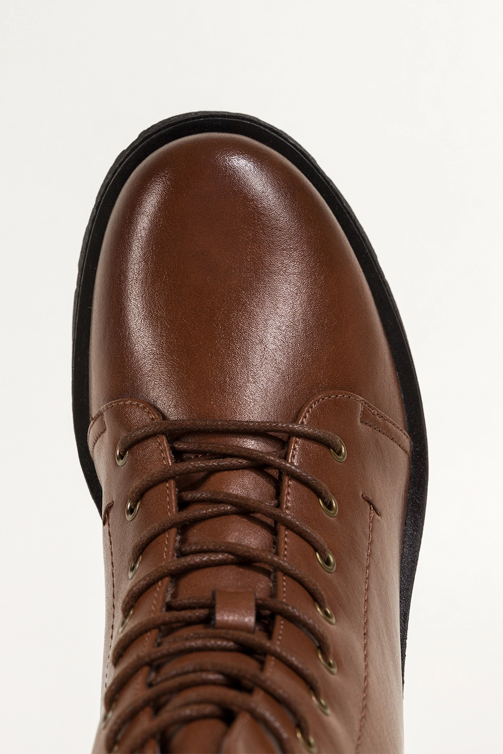 Brązowe botki skórzane damskie Sergio Leone na bieżnikowanej platformie ozdobne przeszycia na cholewce sznurowane model GI295-H. Wykonane z wysokogatunkowej, naturalnej skóry, zachwycają nie tylko stylowym wyglądem, ale i trwałością. Ich wnętrze zostało ocieplone miękkim futerkiem, które gwarantuje komfort i ciepło nawet w najchłodniejsze dni. Zaokrąglony nosek i perfekcyjnie wyprofilowana cholewka zapewniają wygodę noszenia przez cały dzień.