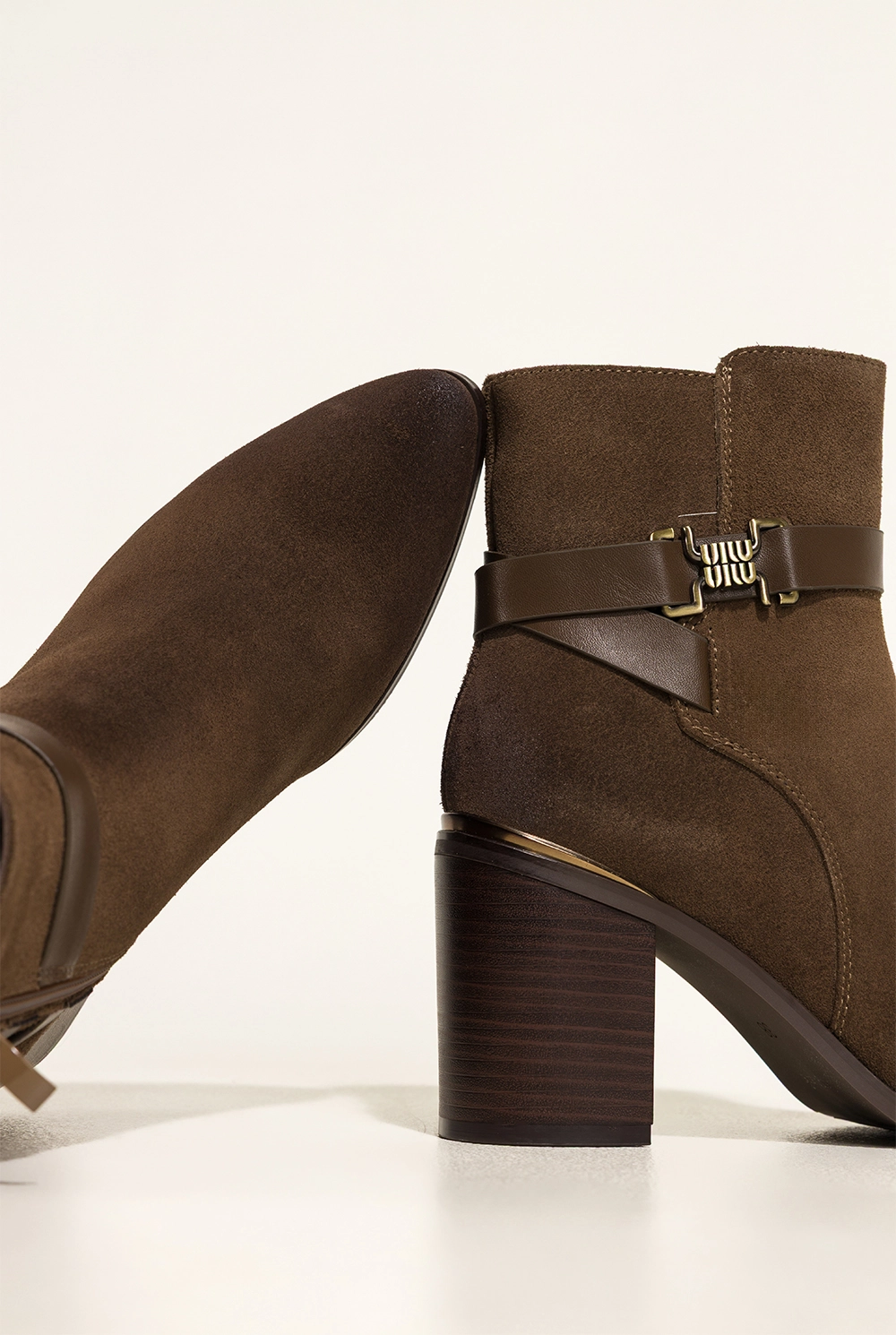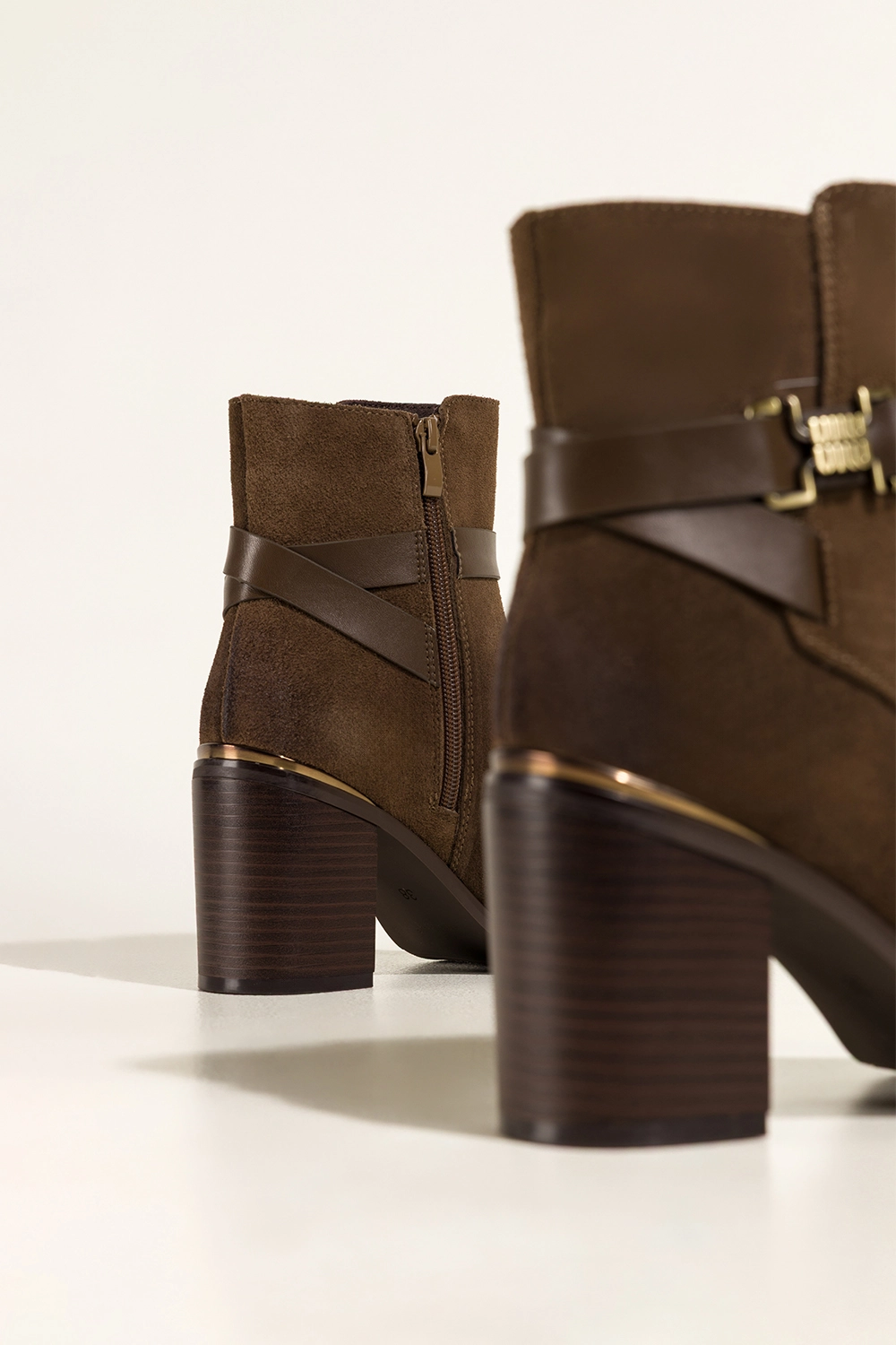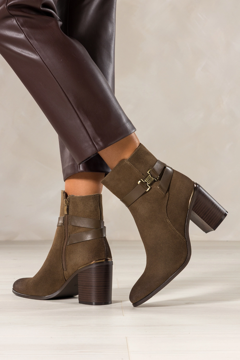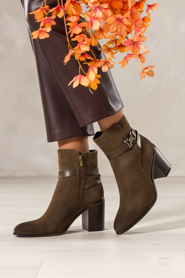 Złota ozdoba na pasku oplatającym cholewkę to wyrafinowany detal, który czyni ten model wyjątkowym. Te botki z łatwością wpiszą się zarówno w eleganckie, jak i codzienne stylizacje, od wełnianych płaszczy po oversize'owe swetry. Kolor khaki z nutą brązu świetnie komponuje się z neutralnymi i ziemistymi barwami, a uniwersalny design sprawia, że założysz je zarówno do pracy, jak i na wieczorne wyjście.