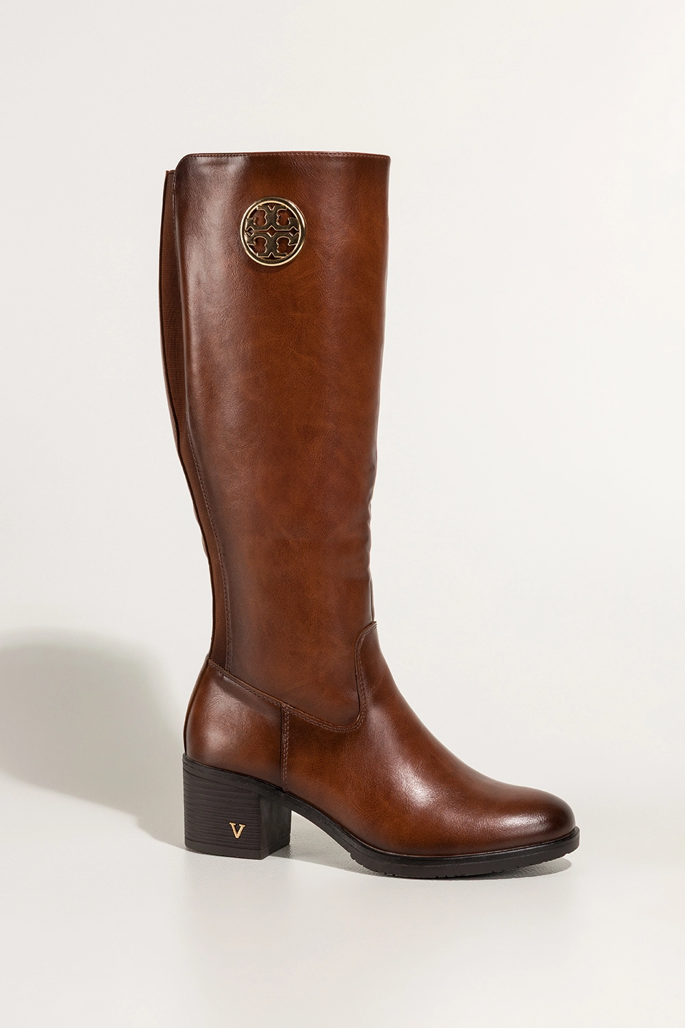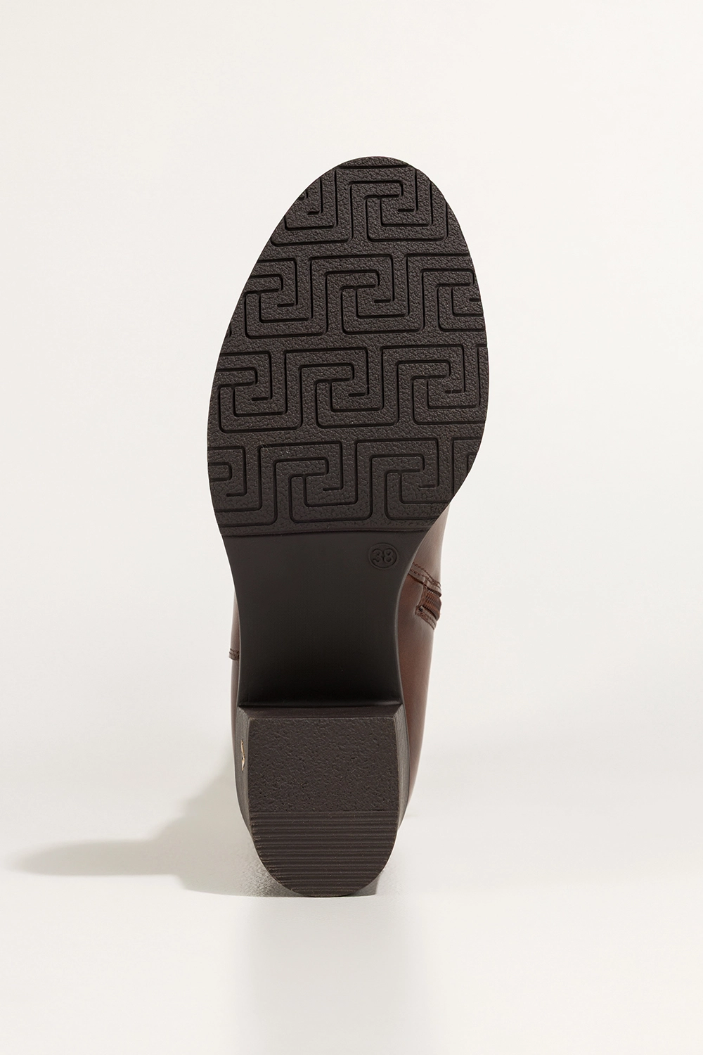 Brązowe kozaki damskie przed kolano na szerokim słupku z ozdobą elastyczna guma w cholewce złota ozdoba Casu model CB342-7 to esencja jesienno-zimowej elegancji, która łączy w sobie wysoką jakość wykonania, wyrafinowany styl oraz komfort noszenia. To nie tylko klasyczne obuwie, ale również wyraz indywidualnego stylu każdej kobiety, która ceni sobie niebanalne detale i funkcjonalne rozwiązania. Model to połączenie ponadczasowej formy z nowoczesnymi elementami – idealny wybór dla kobiet, które nie chcą iść na kompromisy między wyglądem a wygodą. Wykonane z wysokogatunkowej skóry ekologicznej i ocieplone miękkim futerkiem, kozaki zapewniają ciepło i trwałość w chłodniejsze dni. Dzięki doskonałemu wyprofilowaniu i stabilnemu obcasowi typu słupek, model ten sprawdzi się zarówno podczas codziennych aktywności, jak i w bardziej eleganckich sytuacjach.