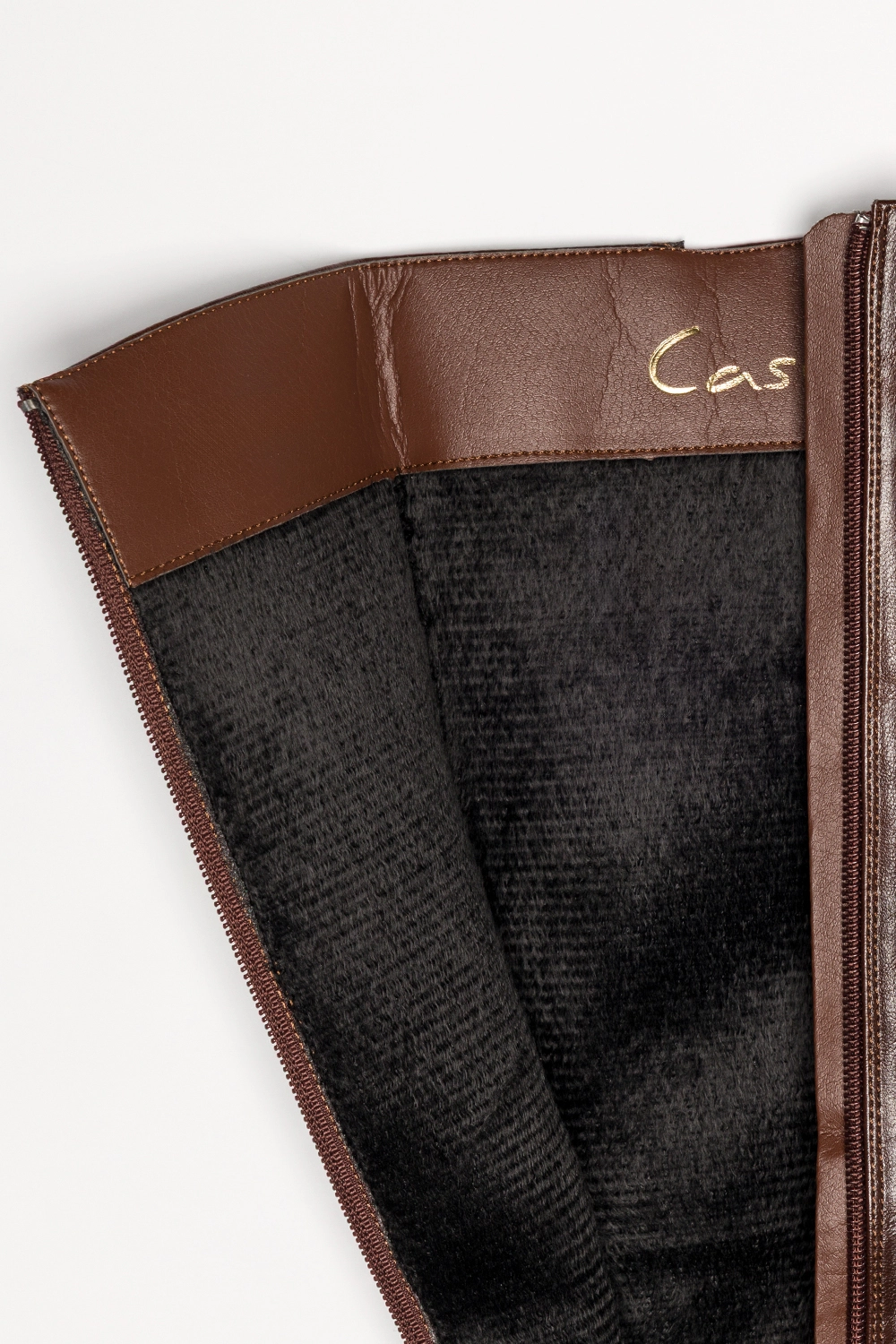 Brązowe kozaki damskie przed kolano na szerokim słupku złota ozdoba guma w cholewce Casu model D19X14-BR, to kwintesencja elegancji i wygody na chłodniejsze dni. Wykonane z wysokogatunkowej skóry ekologicznej i ocieplone delikatnym futerkiem, gwarantują ciepło i komfort nawet podczas długiego spaceru. Stabilny, szeroki obcas typu słupek, pokryty skórą ekologiczną, zapewnia doskonałą równowagę między stylem a praktycznością, nie obciążając nóg.
