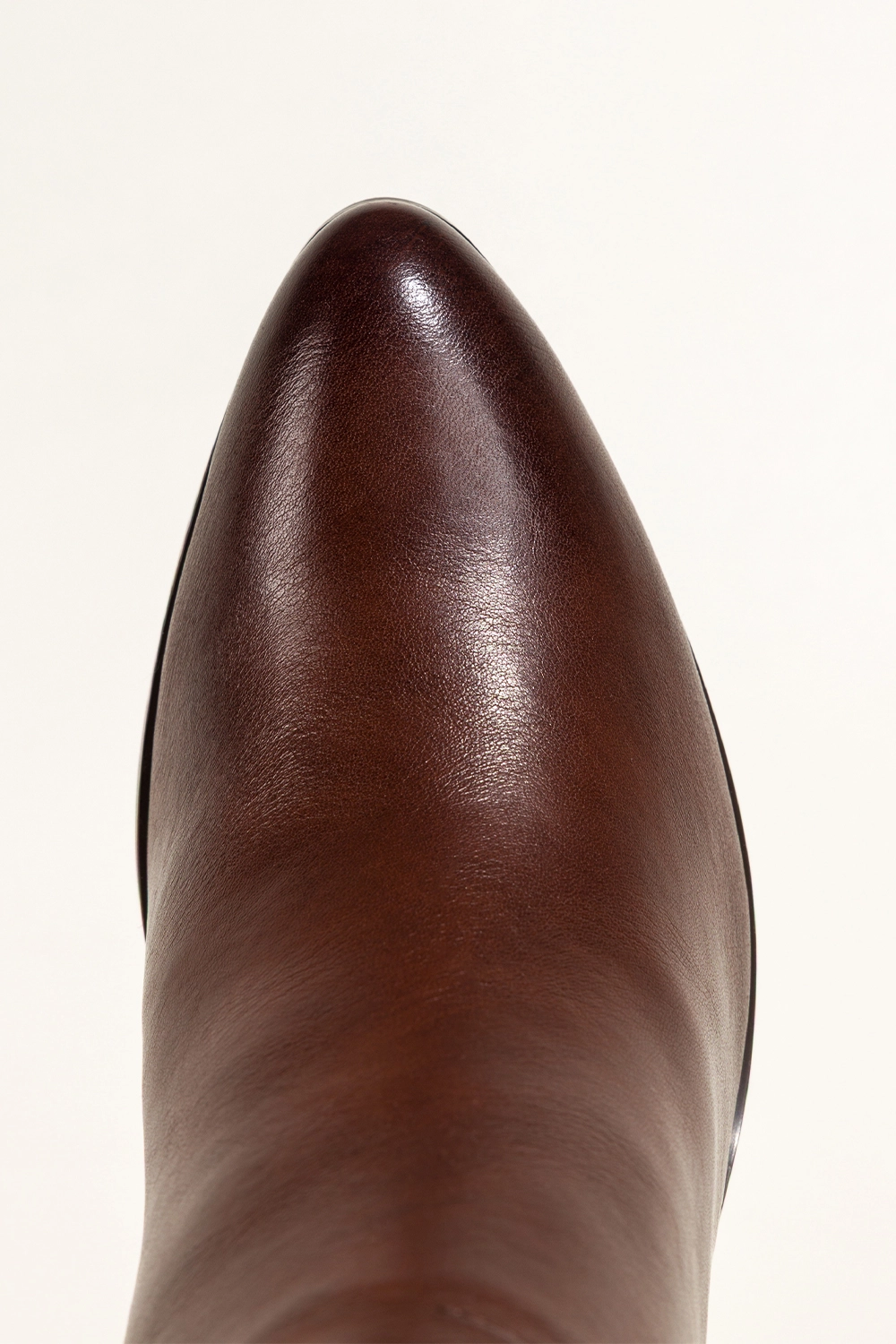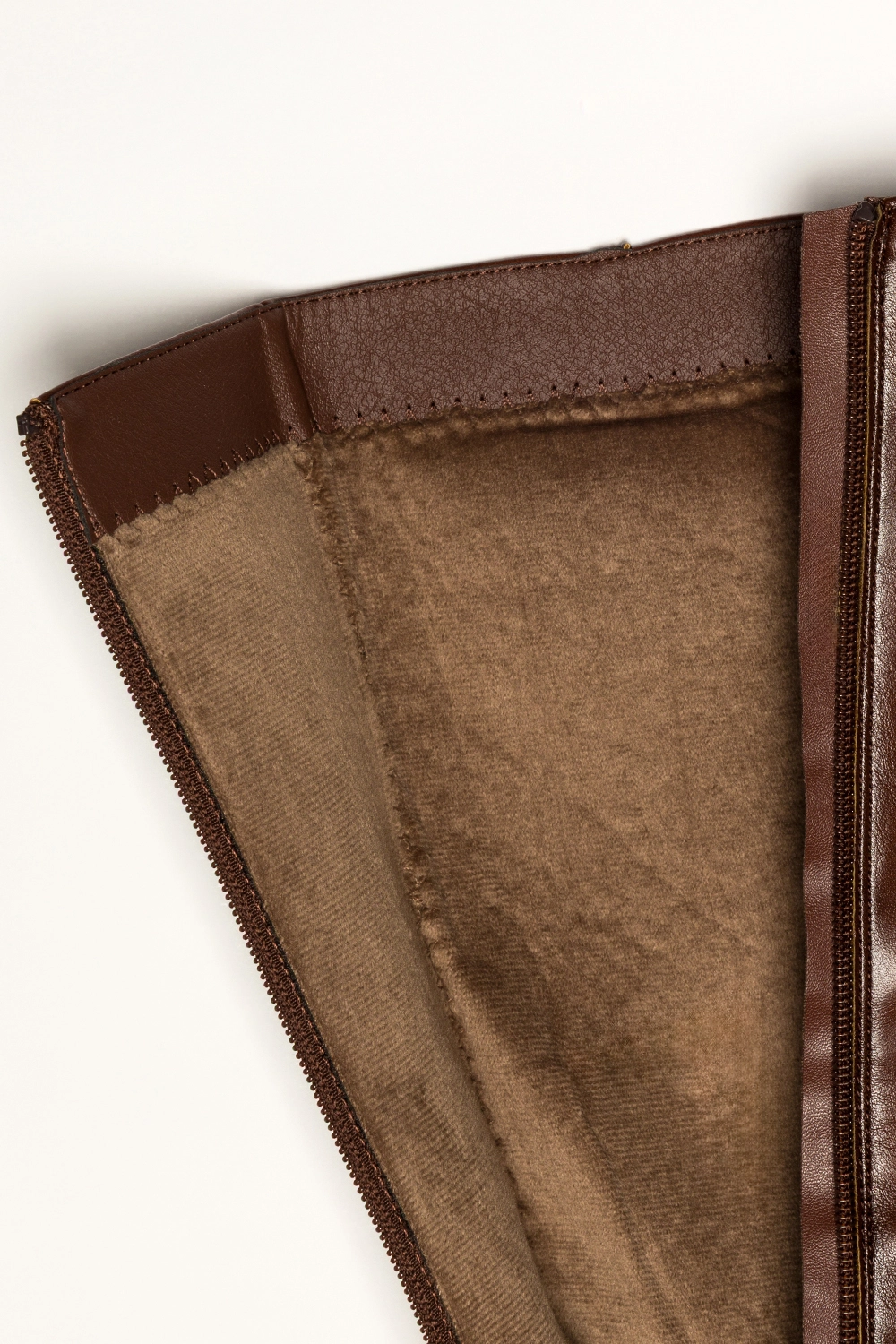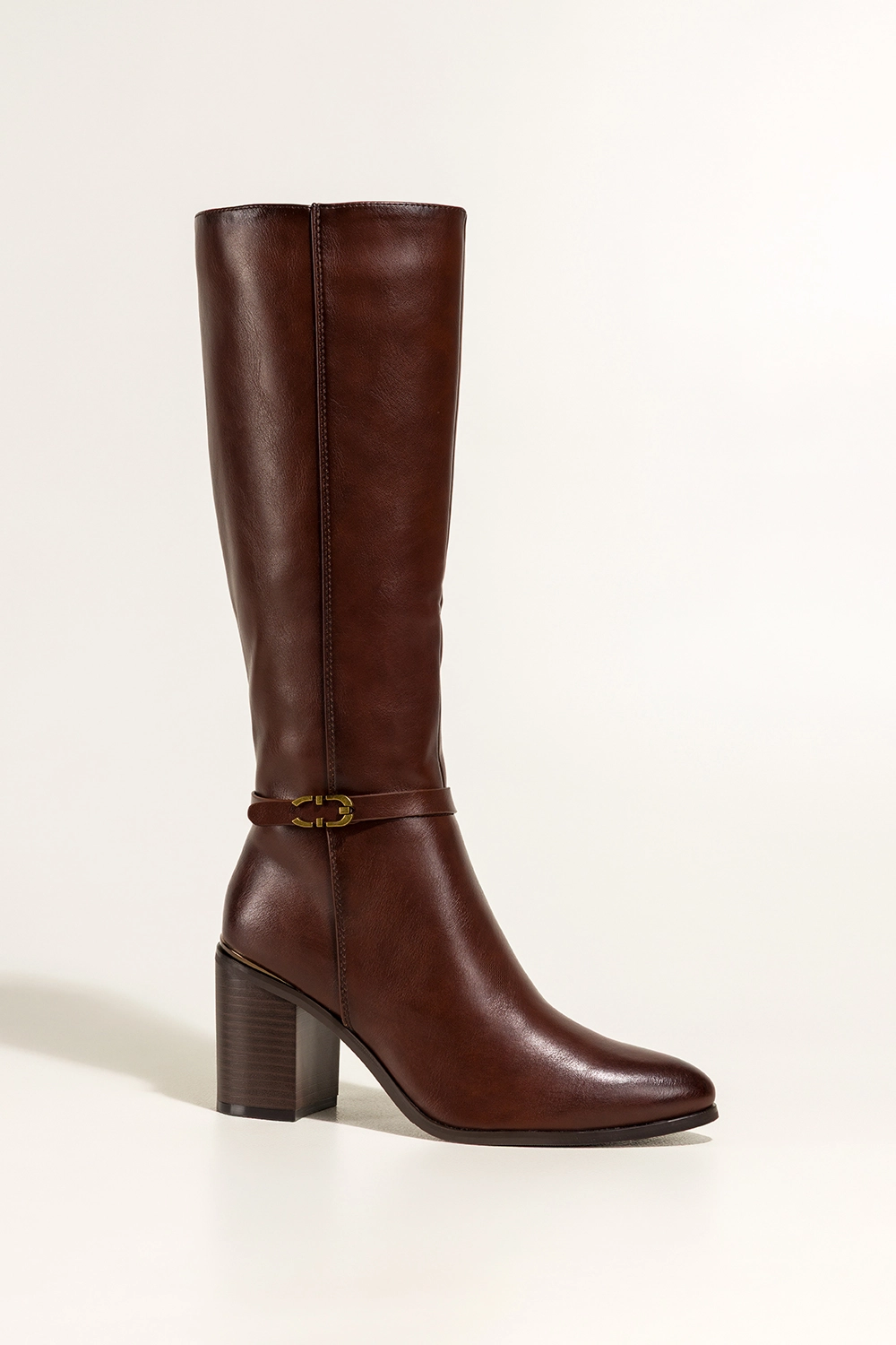 Te stylowe kozaki przed kolano doskonale wpisują się w aktualne trendy modowe. Uniwersalny odcień głębokiego brązu pasuje zarówno do codziennych stylizacji z jeansami, jak i bardziej eleganckich zestawów z sukienkami. Subtelny pasek ze złotą ozdobą przy kostce oraz elastyczna guma ukryta w cholewce podkreślają niebanalny design i zapewniają idealne dopasowanie do nogi. Zamek boczny umożliwia szybkie zakładanie, co czyni je niezwykle praktycznymi w codziennym użytkowaniu.