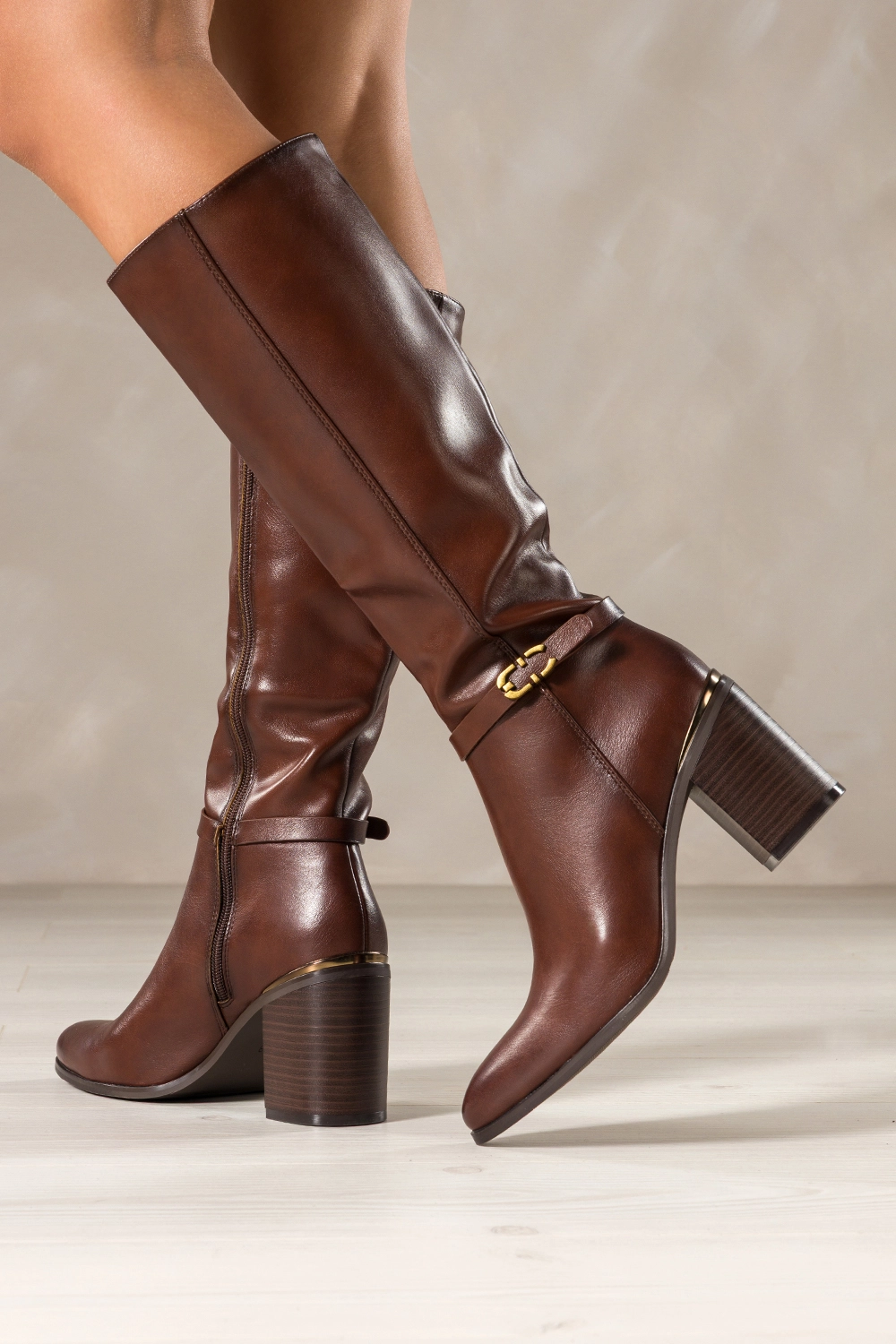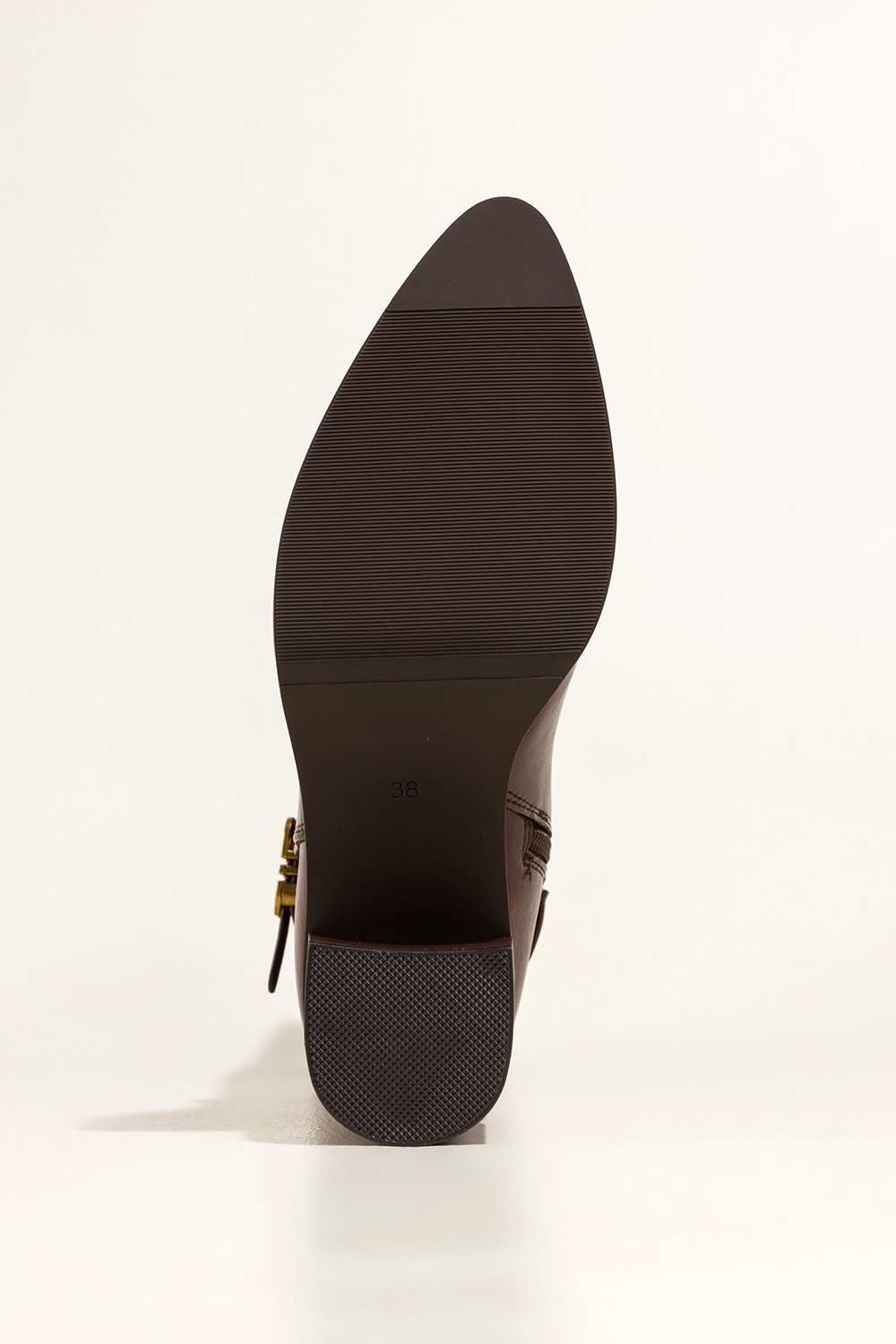 Brązowe kozaki damskie Sergio Leone obcas słupek na cholewce pasek ze złotą ozdobą model PA74261, elegancja i komfort w jesienno-zimowej odsłonie. Wykonane z wysokogatunkowej skóry ekologicznej, gwarantują trwałość oraz odporność na zmienne warunki pogodowe. Miękkie, przyjemne w dotyku wnętrze z koca obuwniczego zapewnia ciepło i wygodę przez cały dzień. Starannie wyprofilowany zaokrąglony nosek oraz stabilny, szeroki obcas typu słupek dodają sylwetce lekkości i kobiecego wdzięku, jednocześnie nie obciążając stóp.