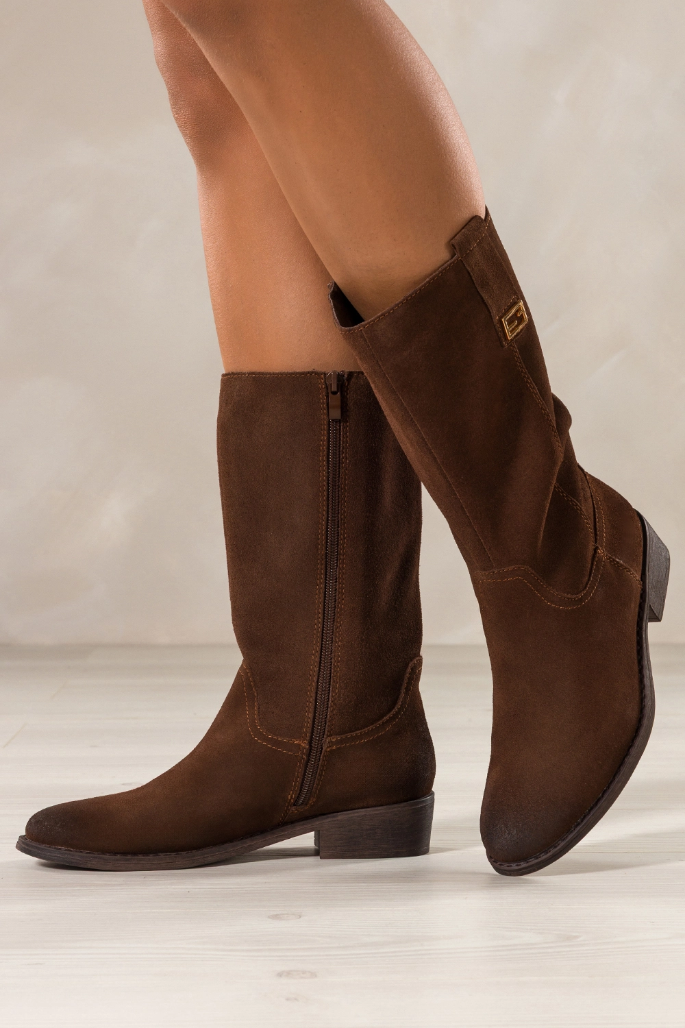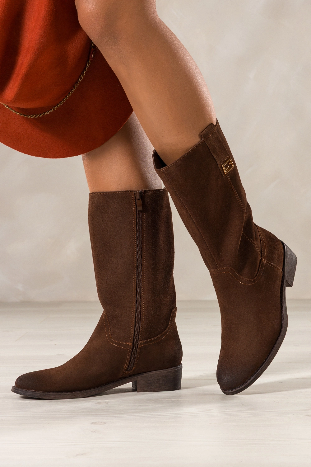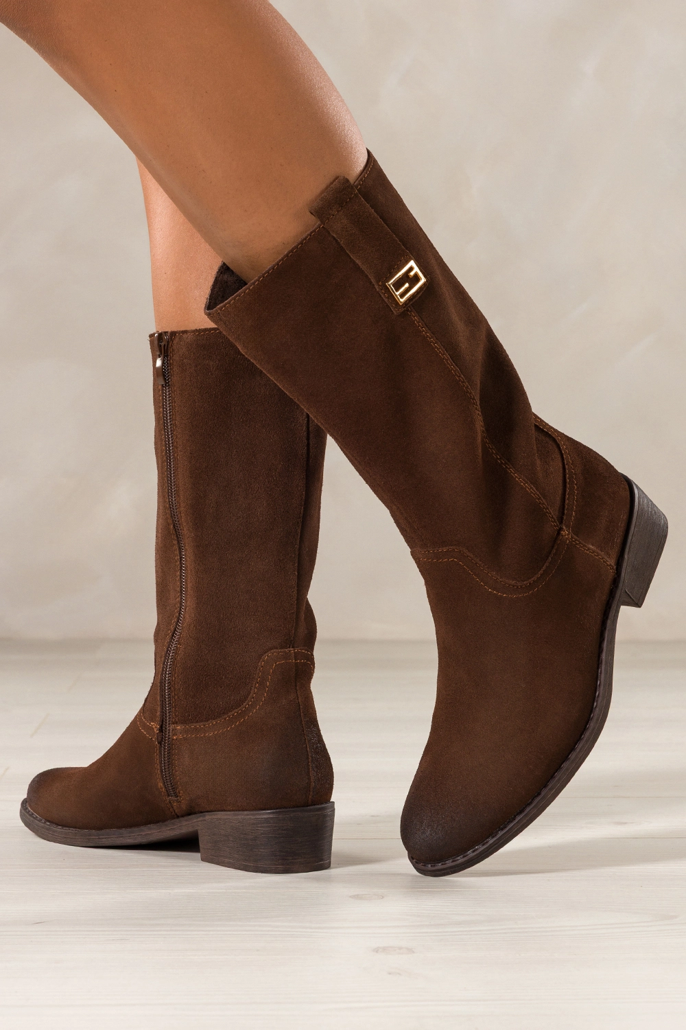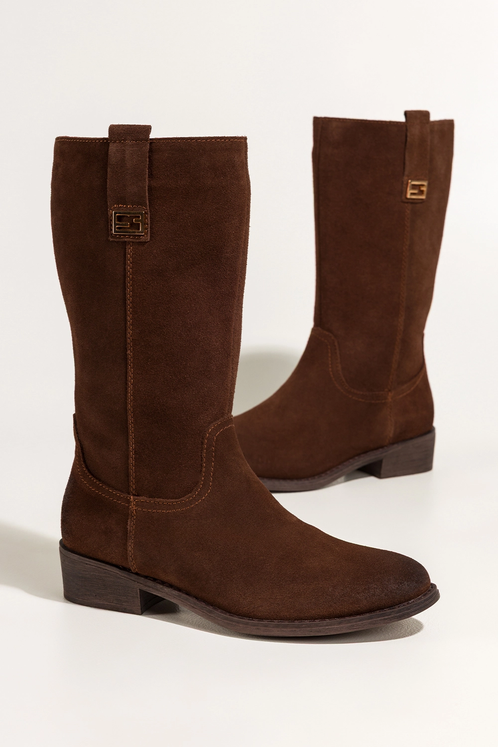Ich klasyczny, brązowy odcień i subtelna złota ozdoba na cholewce sprawiają, że kozaki doskonale wpisują się zarówno w casualowe, jak i bardziej eleganckie zestawienia. Zaokrąglony nosek oraz niski obcas typu klocek dodają butom kobiecej lekkości, a jednocześnie zapewniają stabilność i wygodę podczas chodzenia. Model ten świetnie komponuje się z płaszczami, swetrami czy sukienkami, stając się nieodłącznym elementem jesienno-zimowej garderoby.