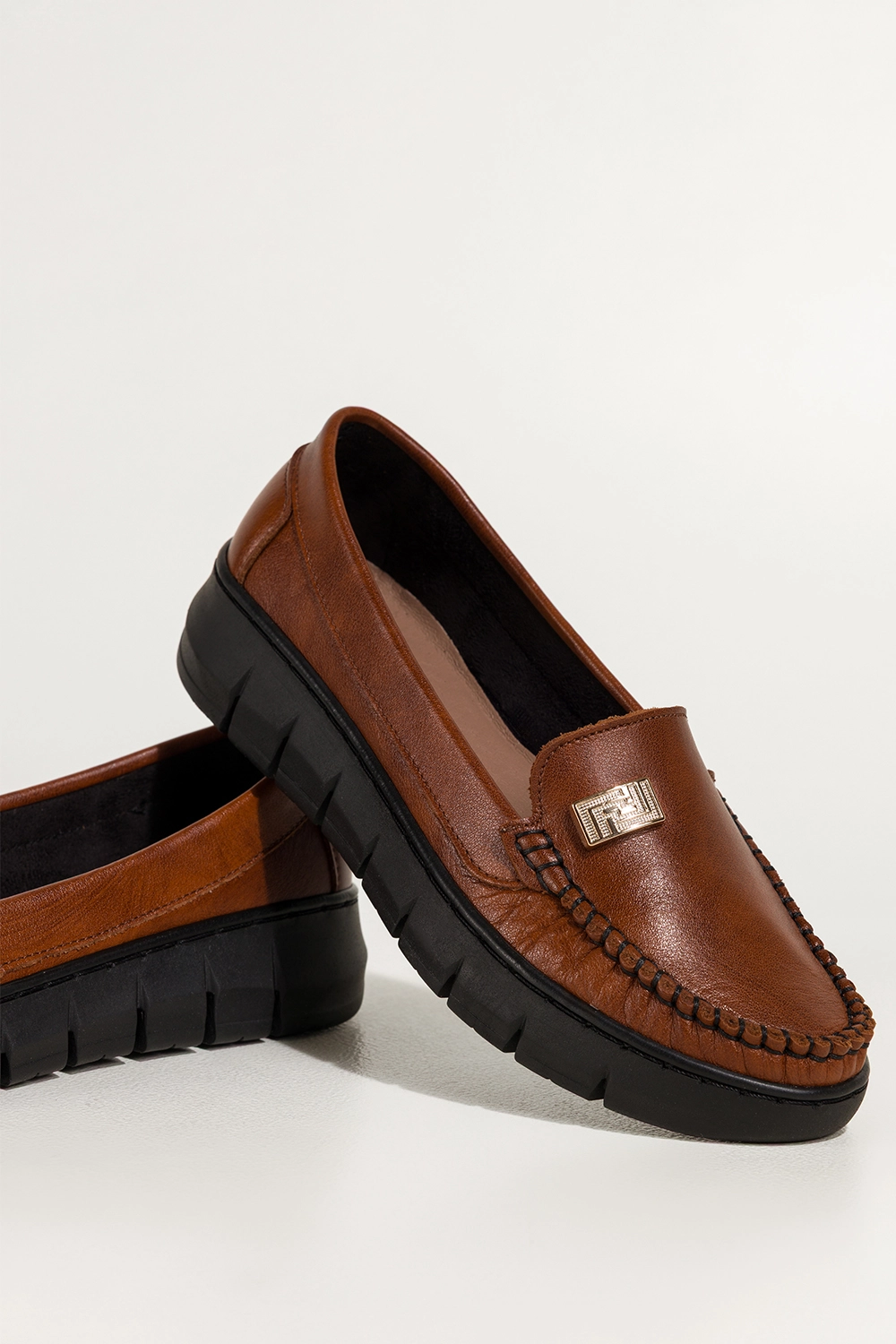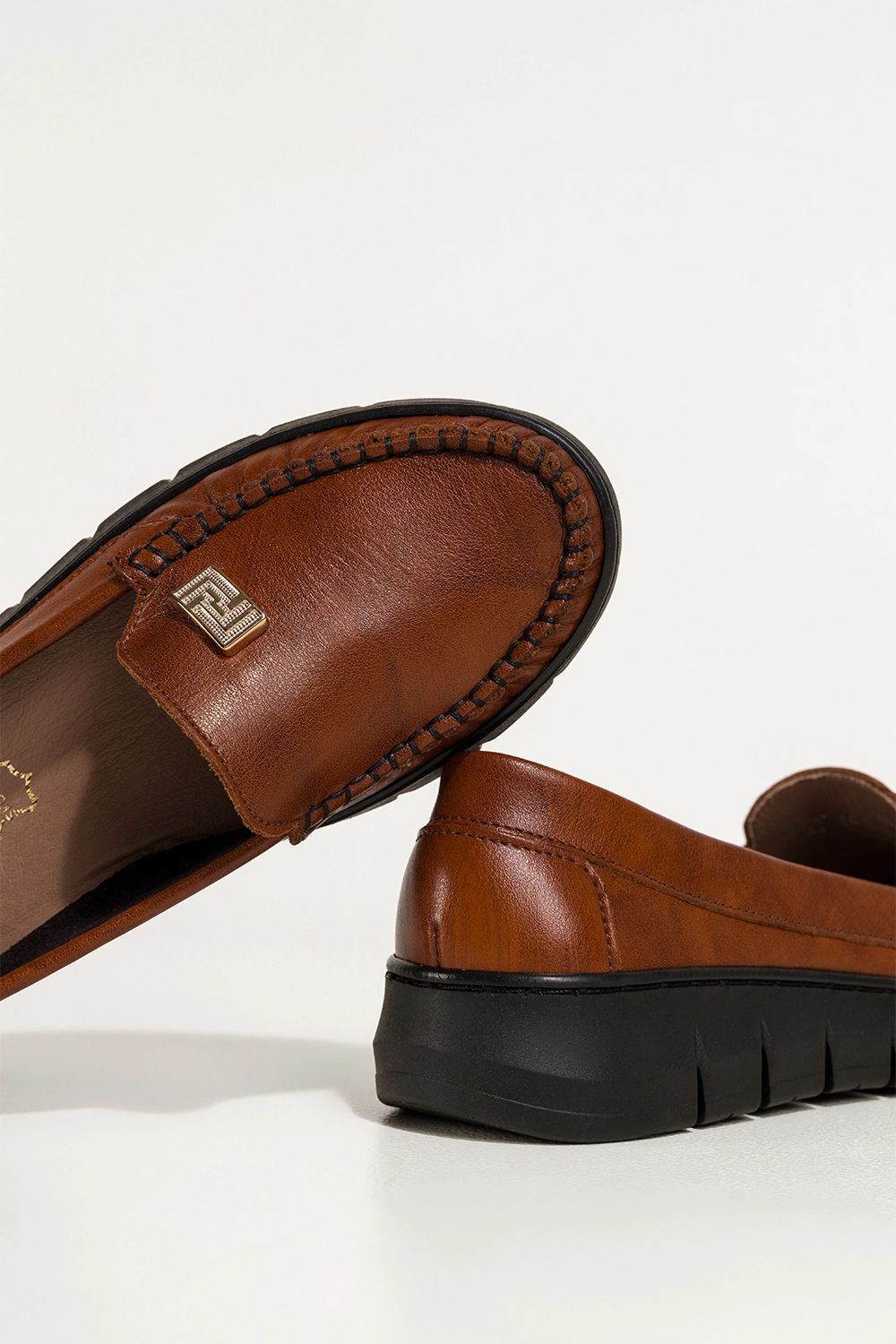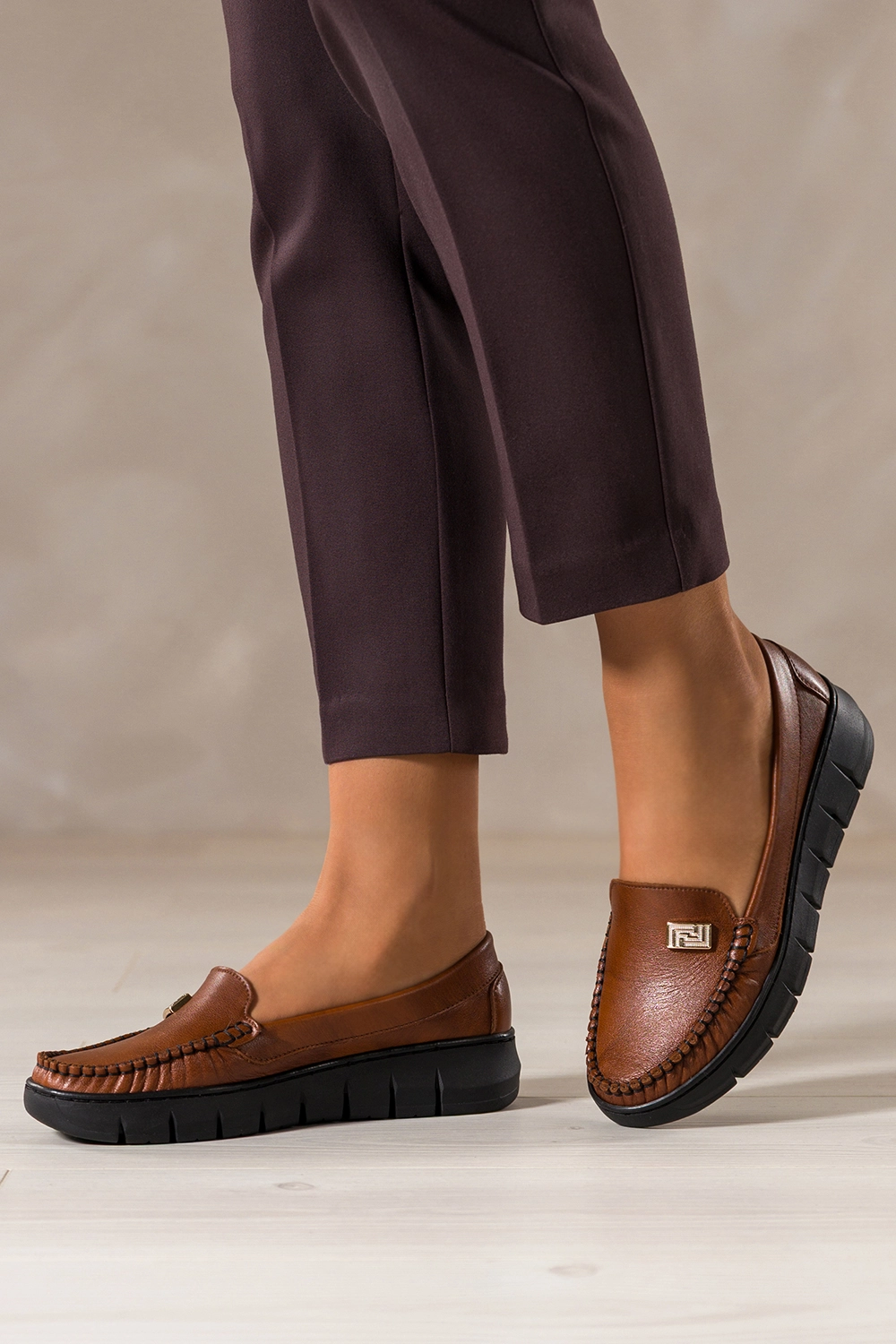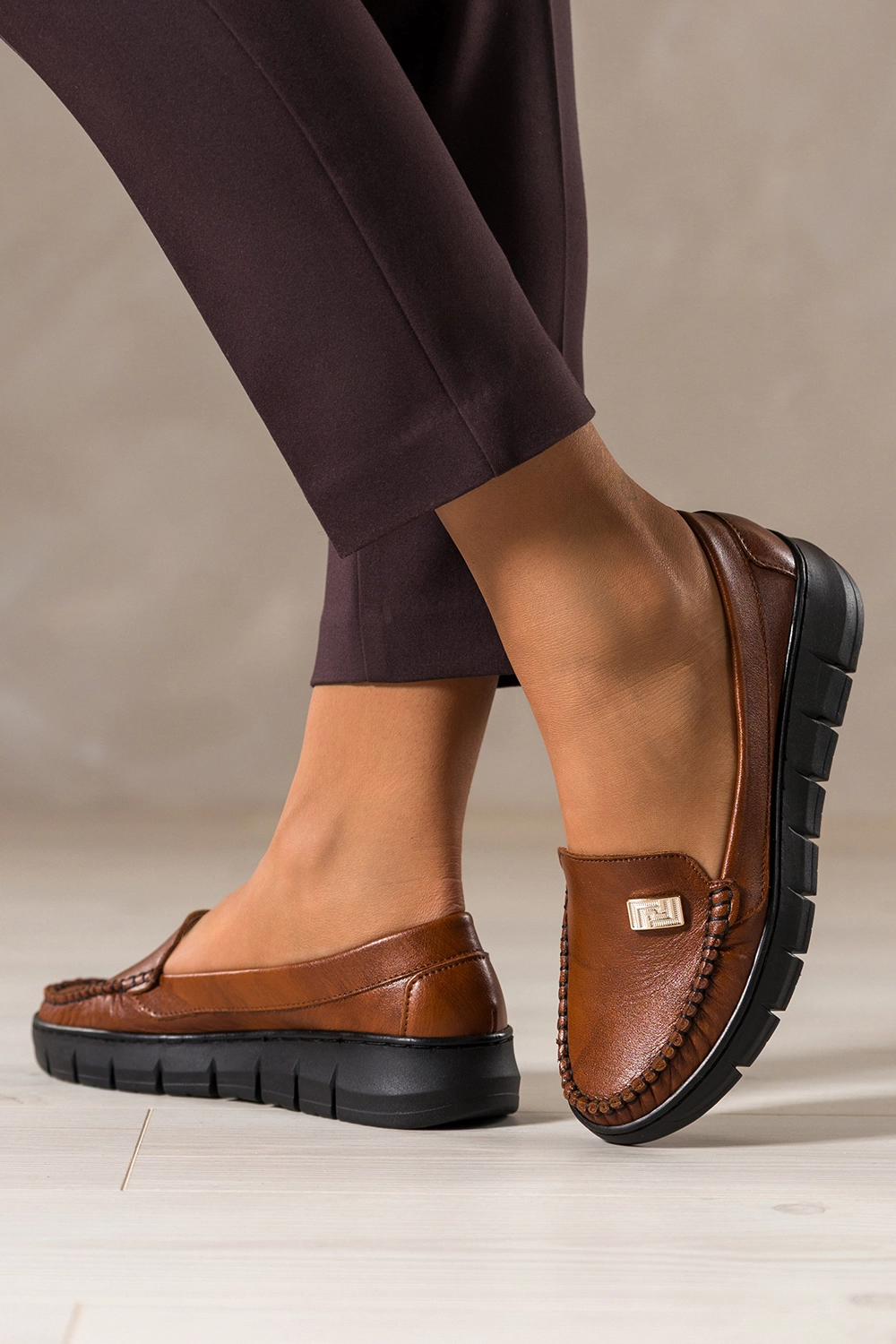 Dzięki złotej ozdobie umieszczonej na przodzie mokasyny nabierają luksusowego charakteru, który perfekcyjnie dopełni zarówno codzienne, jak i bardziej eleganckie stylizacje. Elastyczna, czarna platforma z bieżnikiem nie tylko dodaje im nowoczesnego sznytu, ale również zwiększa przyczepność i stabilność. Ciepły, brązowy odcień skóry świetnie komponuje się z jesiennymi i wiosennymi outfitami, a minimalistyczny design pozwala łączyć je z różnymi elementami garderoby, od spodni po sukienki.