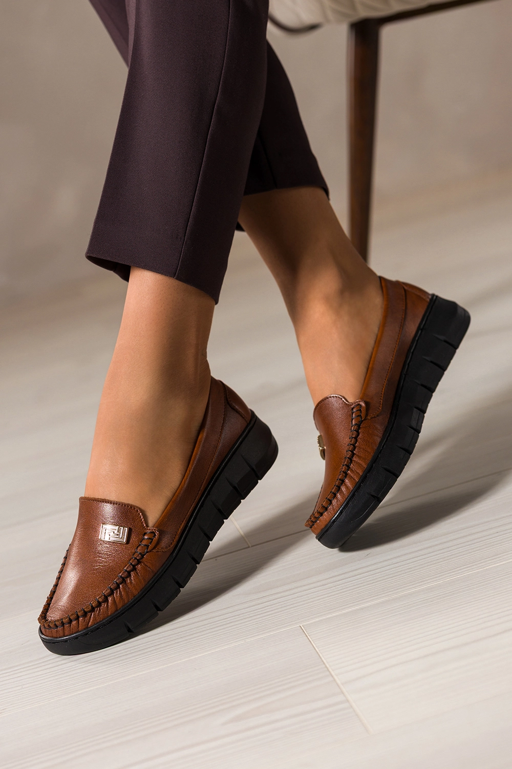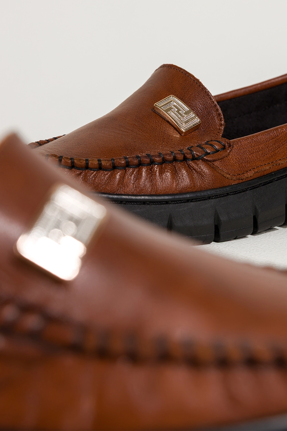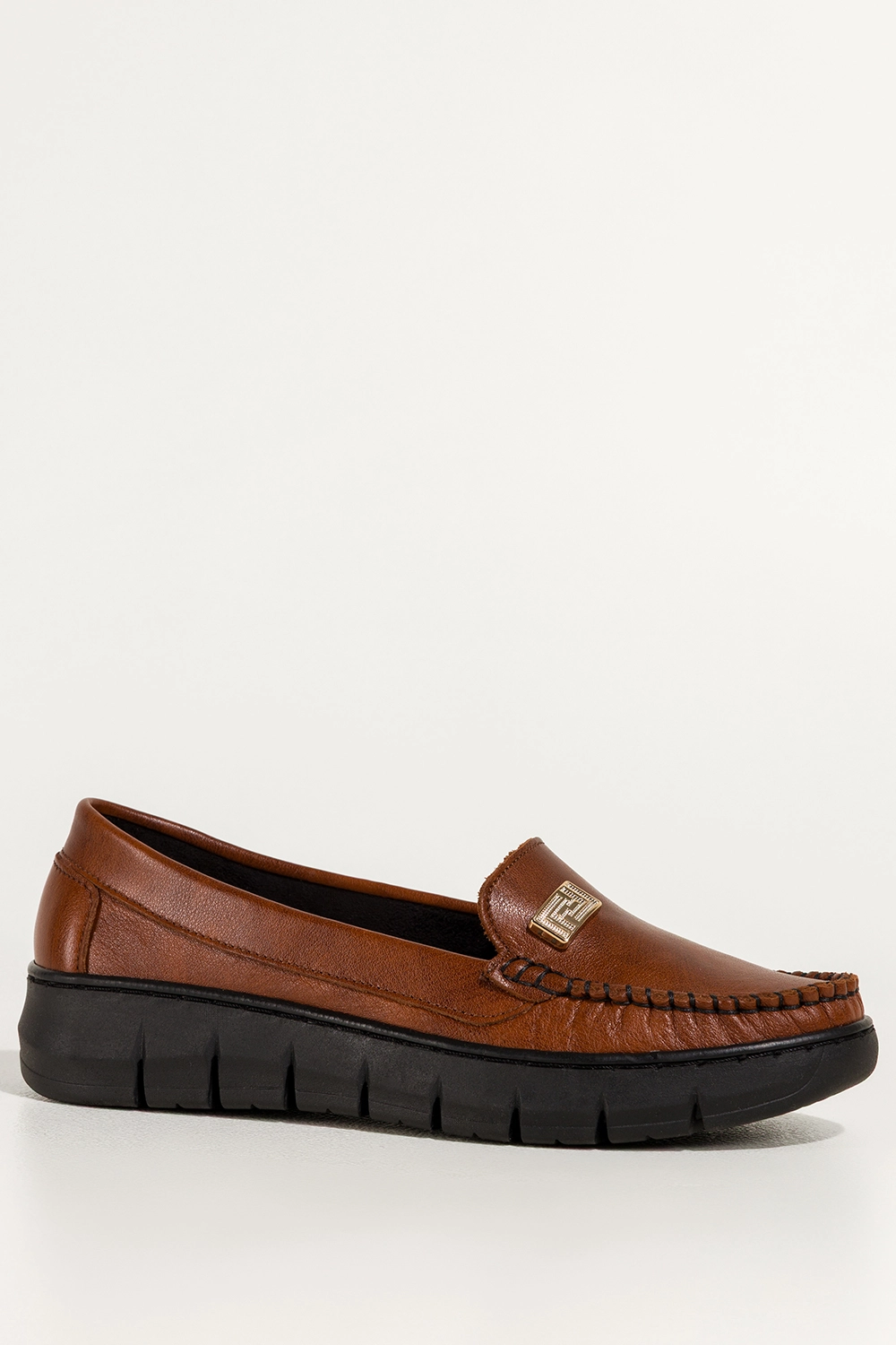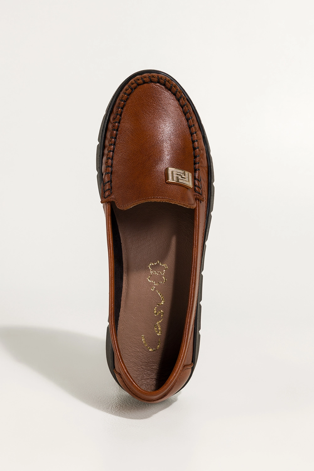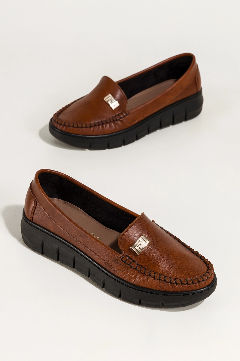 Dzięki złotej ozdobie umieszczonej na przodzie mokasyny nabierają luksusowego charakteru, który perfekcyjnie dopełni zarówno codzienne, jak i bardziej eleganckie stylizacje. Elastyczna, czarna platforma z bieżnikiem nie tylko dodaje im nowoczesnego sznytu, ale również zwiększa przyczepność i stabilność. Ciepły, brązowy odcień skóry świetnie komponuje się z jesiennymi i wiosennymi outfitami, a minimalistyczny design pozwala łączyć je z różnymi elementami garderoby, od spodni po sukienki.