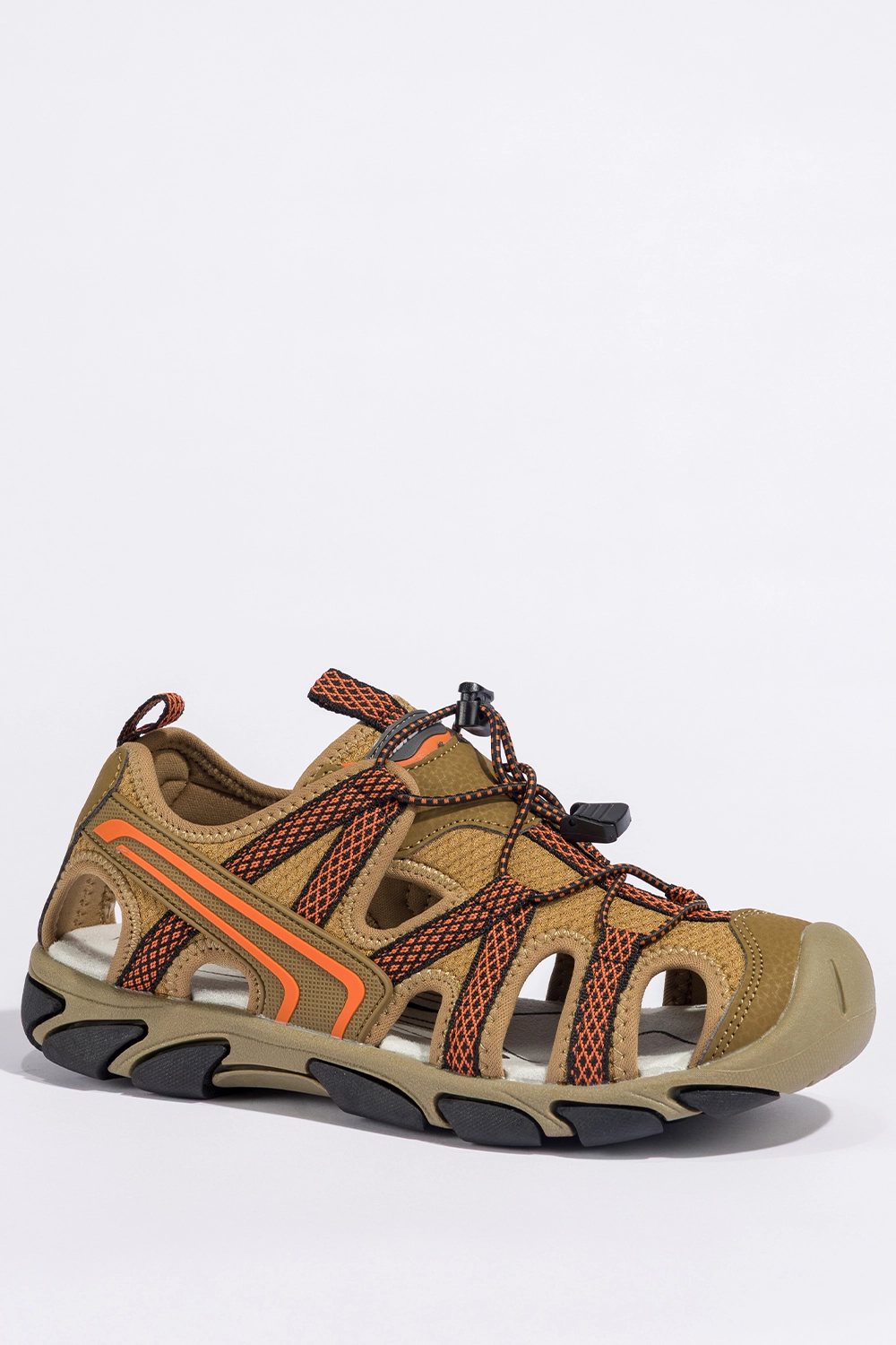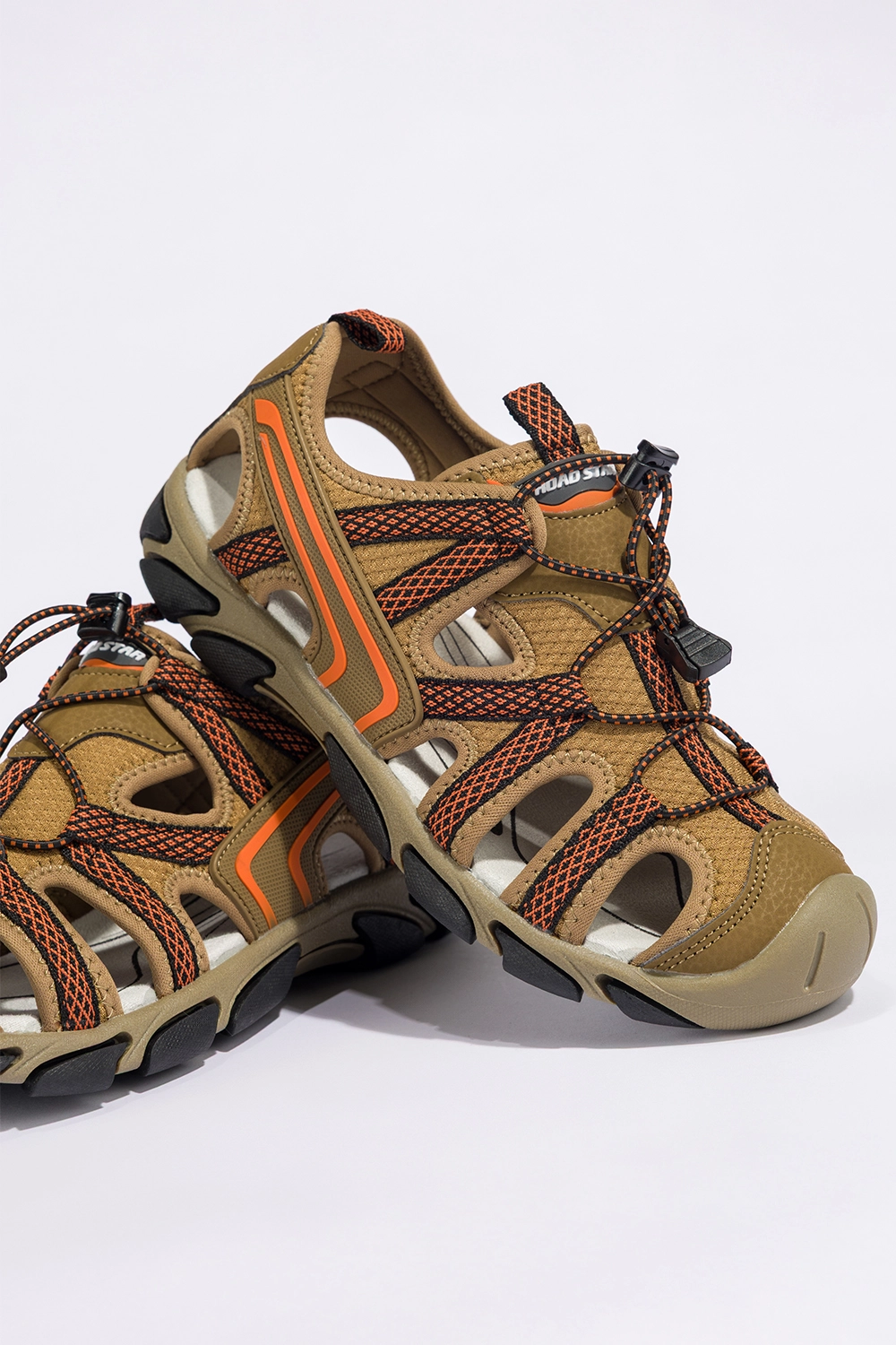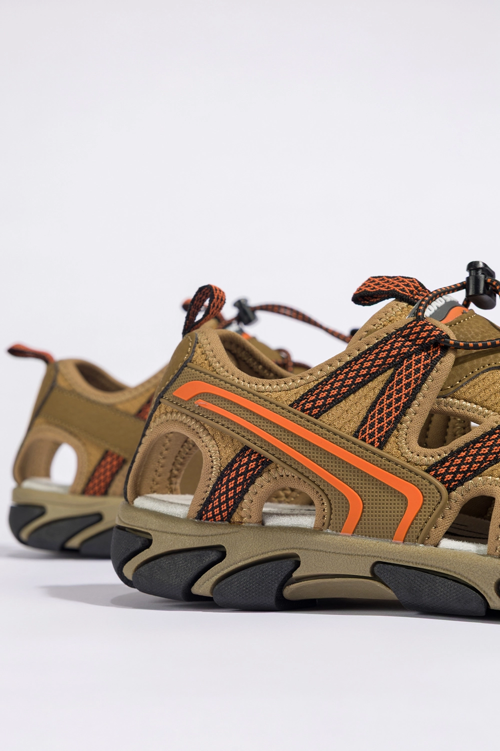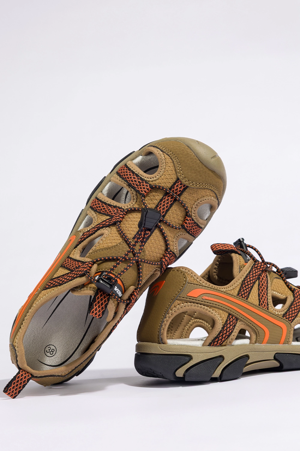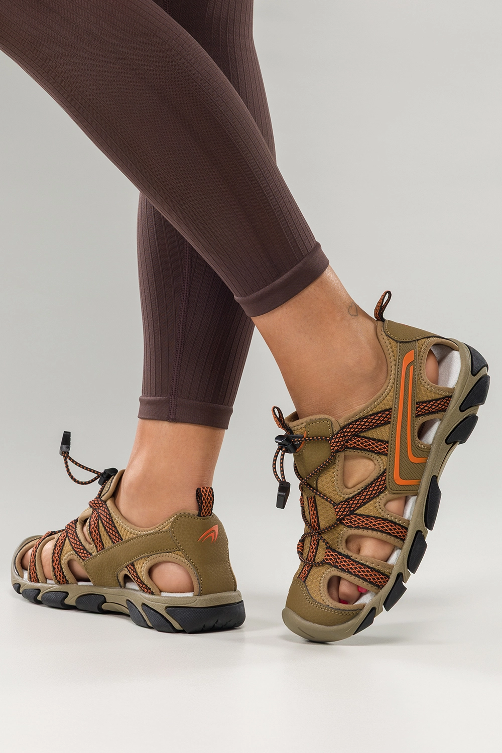 Stylowe detale i nowoczesna kolorystyka nadają tym sandałom trekkingowym unikalnego charakteru. Ich brązowa kolorystyka przełamana została żywymi pomarańczowymi wstawkami, które dodają energii i świeżości każdej stylizacji. Pomarańczowe elastyczne sznurówki z czarnymi akcentami nie tylko stanowią wyrazisty element wizualny, ale również umożliwiają idealne dopasowanie obuwia do stopy. Sandały prezentują się świetnie zarówno z szortami i sportową bluzą na górskim szlaku, jak i z letnią sukienką podczas spaceru po miejskim parku. To obuwie, które łączy w sobie funkcję sportową z codziennym stylem — zawsze wygląda modnie, niezależnie od okoliczności.