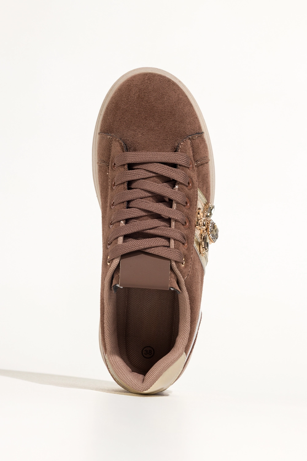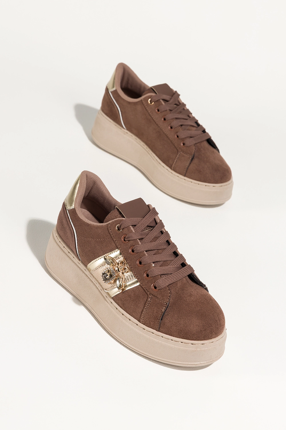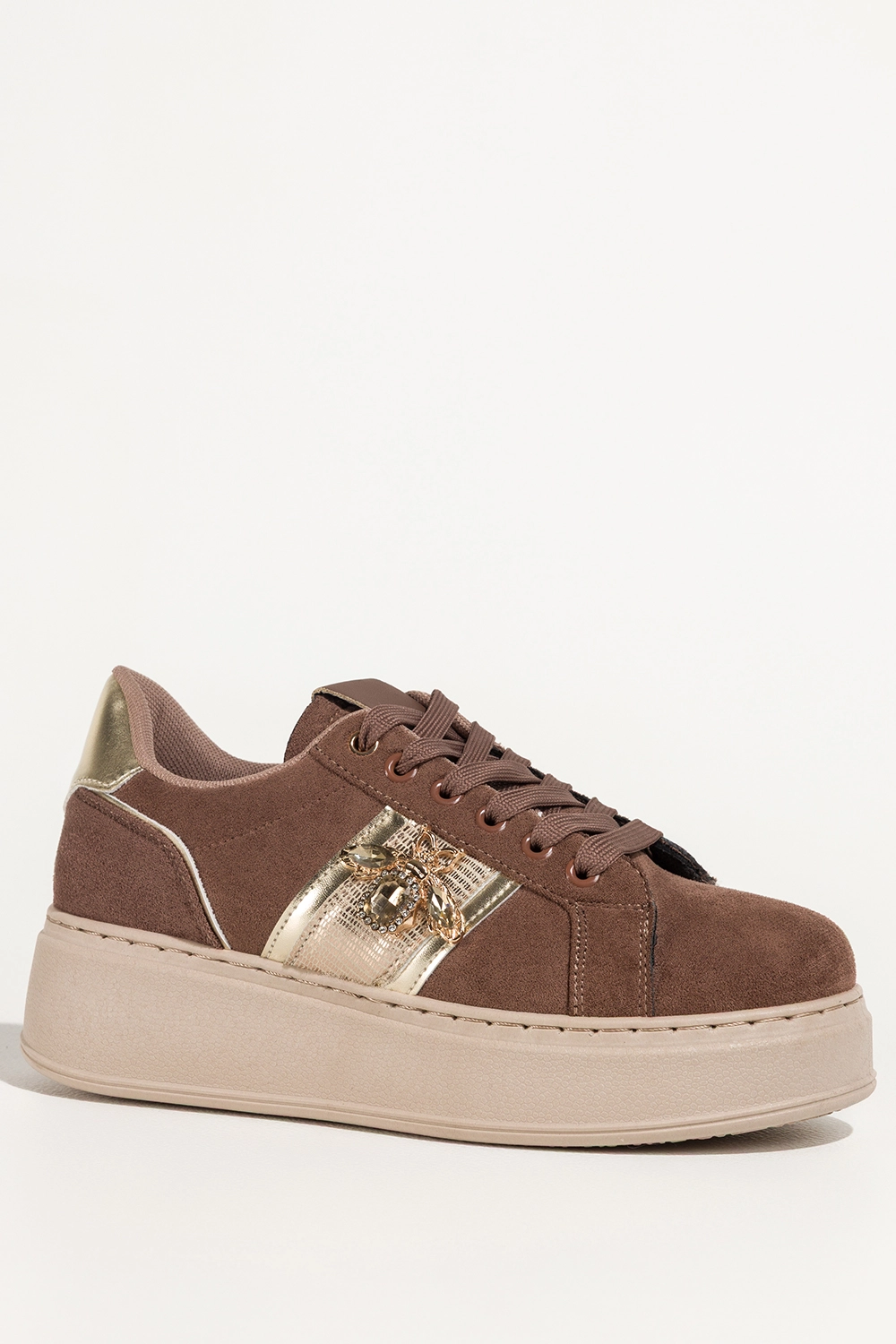 Brązowe sneakersy damskie buty sportowe na beżowej platformie złote dodatki owad z kryształkami sznurowane Carla X6067