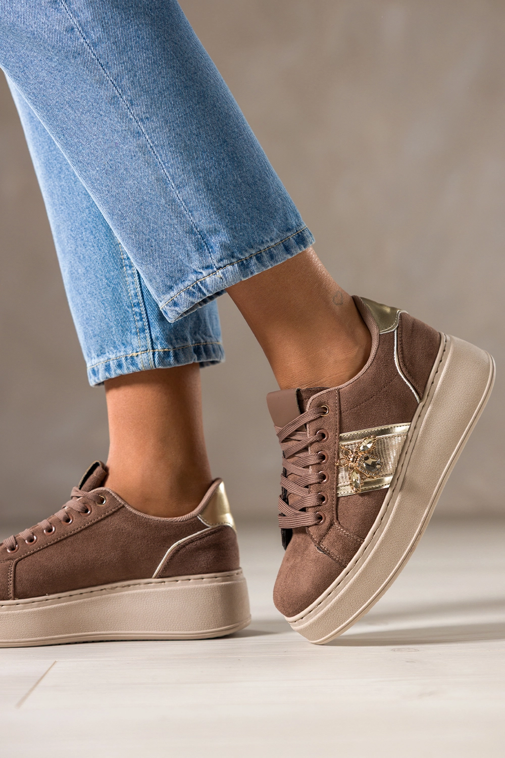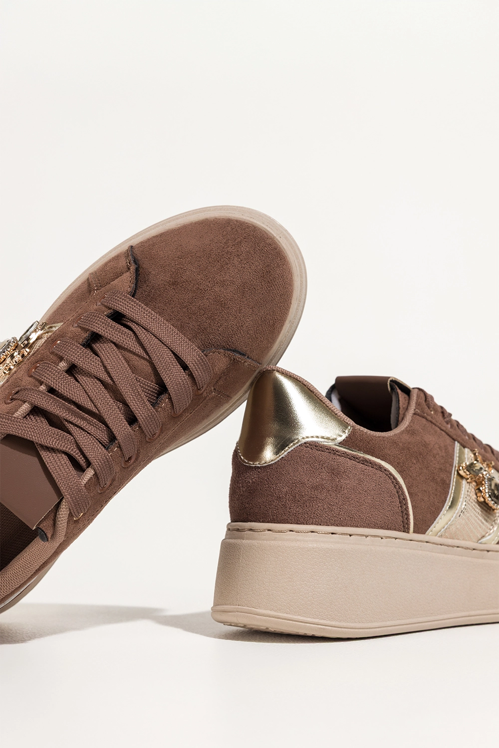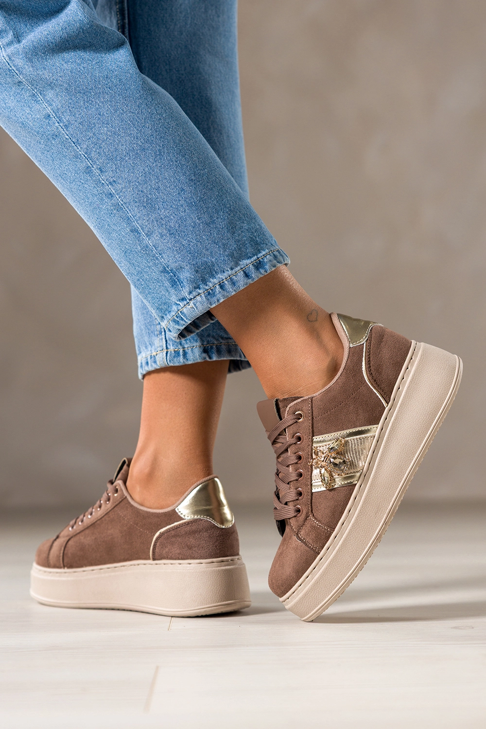 Brązowe sneakersy damskie buty sportowe na beżowej platformie złote dodatki owad z kryształkami sznurowane Carla X6067