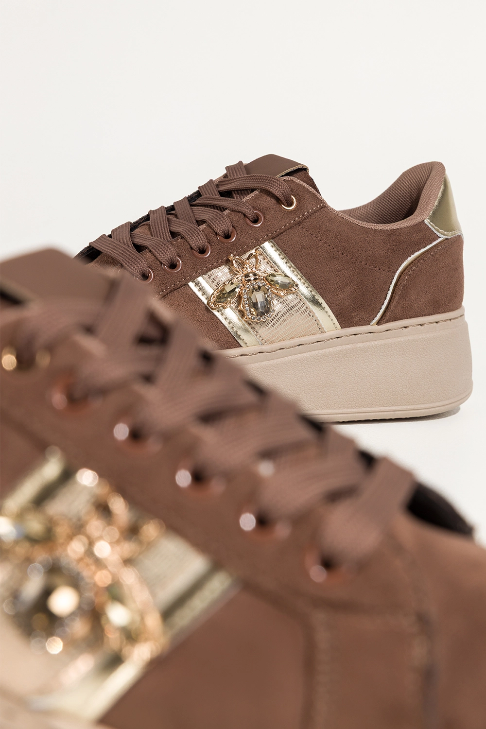 Brązowe sneakersy damskie buty sportowe na beżowej platformie złote dodatki owad z kryształkami sznurowane Carla X6067 model dla kobiet, które cenią modny wygląd i wyraziste detale. Głęboki brązowy kolor w połączeniu z miękką fakturą zamszu ekologicznego tworzy elegancką bazę, którą przełamuje ozdobny owad z kryształków oraz złote dodatki. Beżowa platforma dodaje sylwetce lekkości, a całość przyciąga uwagę dopracowanym designem.