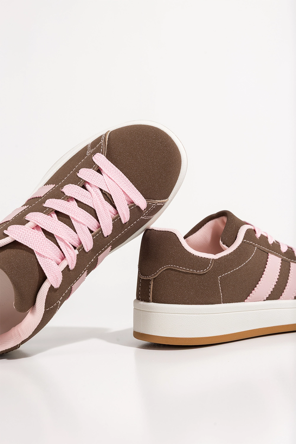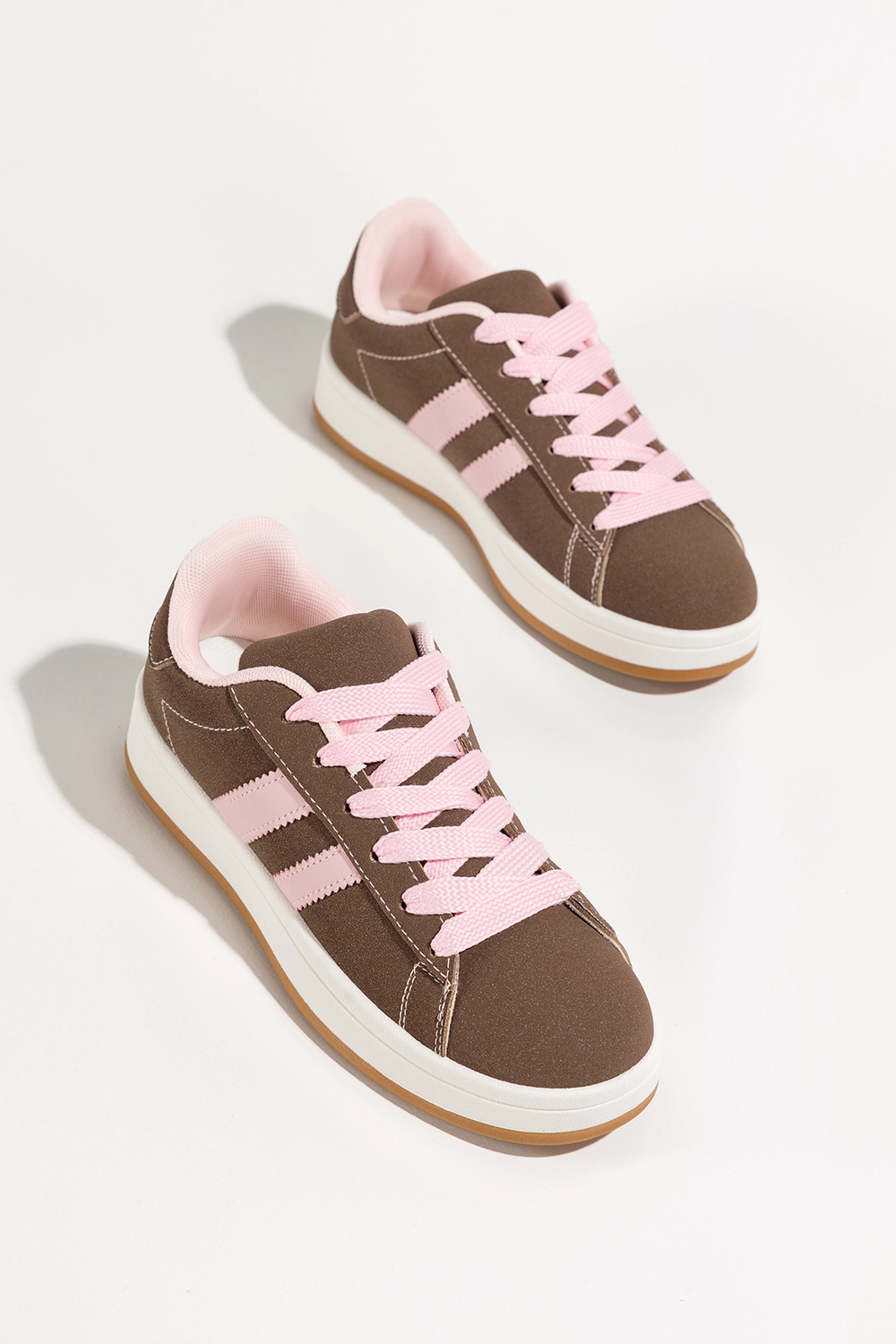 Uniwersalność stylizacji i nowoczesny design czynią ten model obowiązkową pozycją w garderobie każdej kobiety. Brązowa cholewka stanowi doskonałą bazę kolorystyczną, którą z łatwością można połączyć z dżinsami, legginsami, sukienkami czy spódnicami. Różowe sznurówki i subtelne wstawki kolorystyczne na cholewce przełamują klasyczną formę sneakersów, nadając im unikalnego, dziewczęcego charakteru. To idealna propozycja dla kobiet, które lubią wyróżniać się z tłumu, nie rezygnując z komfortu. Model ten sprawdzi się zarówno w sportowych, jak i casualowych stylizacjach, a dzięki podwyższonej podeszwie – również w bardziej odważnych, streetwearowych outfitach.