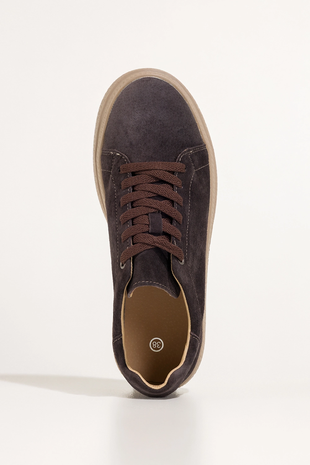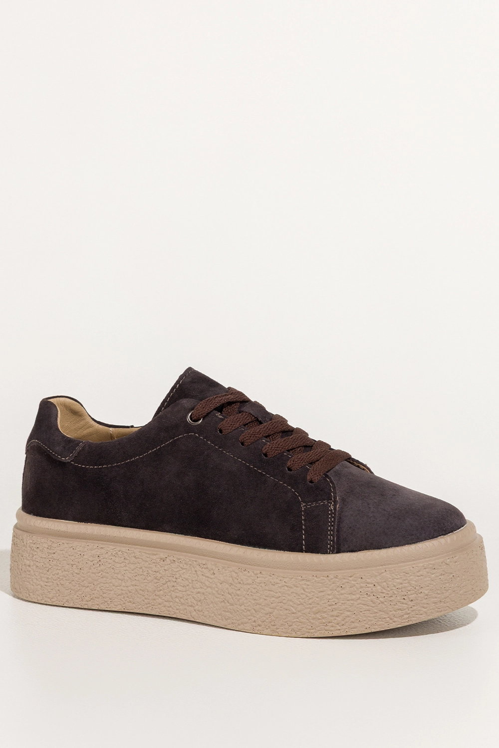 To, co wyróżnia ten model na tle innych sneakersów, to jego subtelne, a zarazem wyraziste detale. Kontrast pomiędzy miękką zamszową cholewką a jasną platformą tworzy efektowny, ale nienachalny look, który przyciąga wzrok. Brązowe sznurówki dodają spójności, a jednocześnie pozwalają na łatwe dopasowanie do garderoby. Sneakersy Carla to także świetna alternatywa dla klasycznych butów sportowych – łączą w sobie miejską wygodę z elegancją, której często brakuje typowym creepersom. Ich konstrukcja optycznie wydłuża nogi i wysmukla sylwetkę, co dodatkowo wzmacnia ich atrakcyjność.