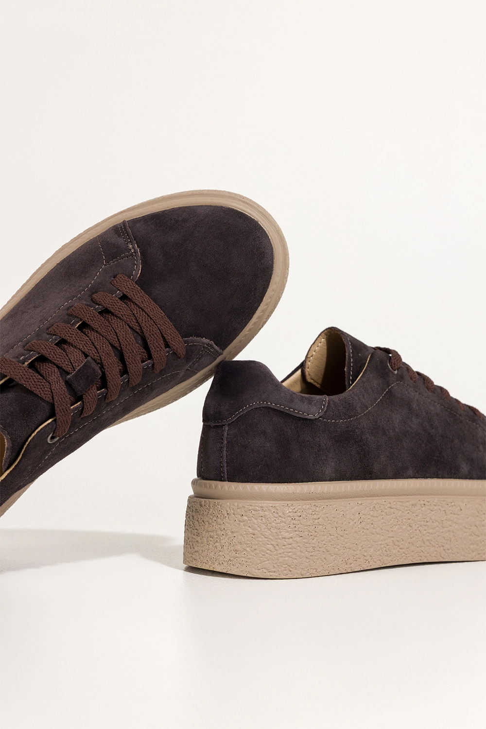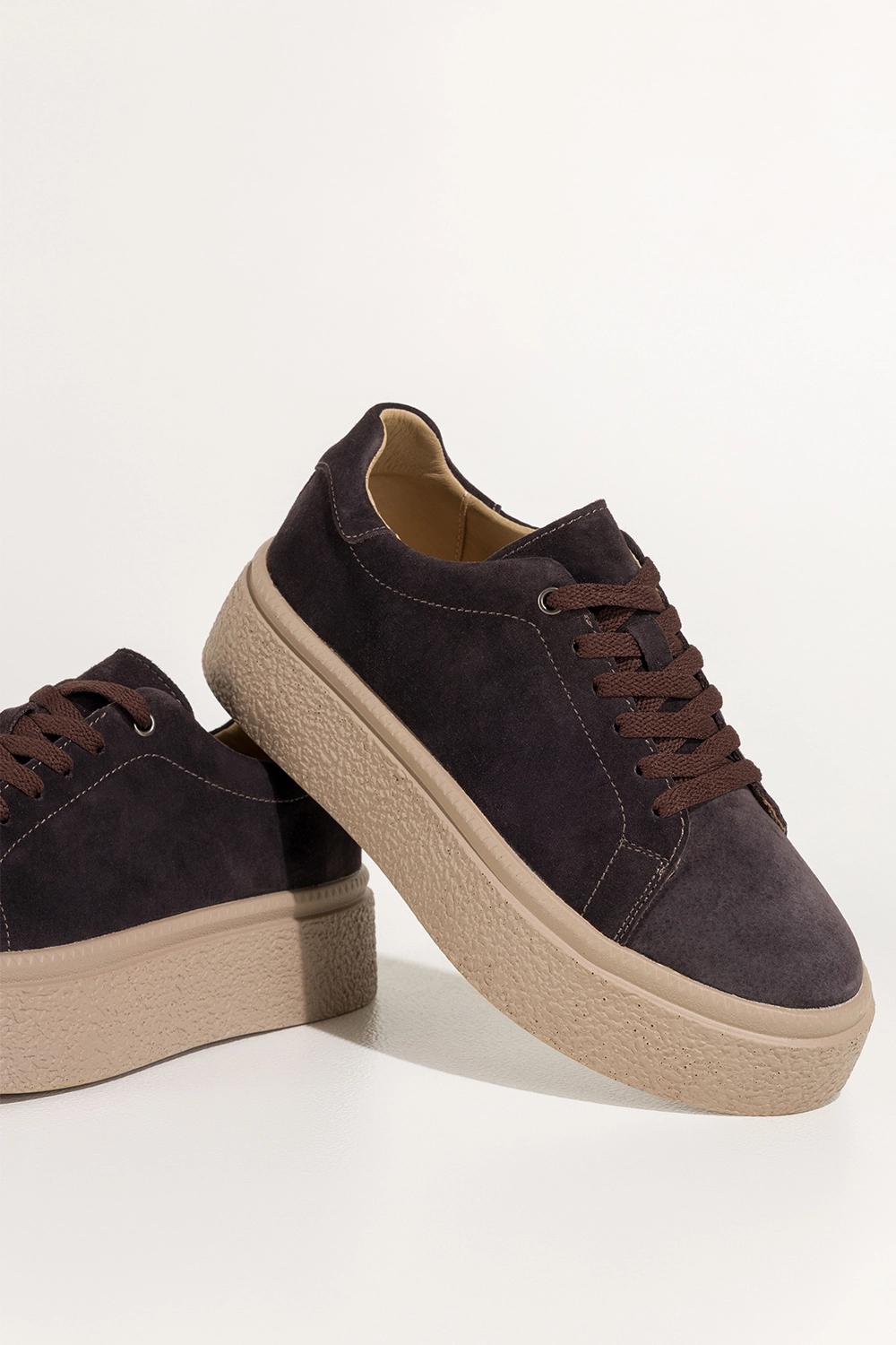 Creepersy zostały wykonane z najwyższej jakości zamszowej skóry, która zapewnia nie tylko estetyczny wygląd, ale również trwałość i odporność na codzienne użytkowanie. Zamsz jest miękki w dotyku, oddychający i perfekcyjnie dopasowuje się do kształtu stopy. Wnętrze buta wyściełane jest naturalną skórą, co znacząco podnosi komfort noszenia – nawet przez cały dzień. Beżowa platforma została wykonana z lekkiego materiału o wysokiej odporności na ścieranie, co czyni te sneakersy niezwykle praktycznymi i solidnymi. Sznurowanie umożliwia idealne dopasowanie do stopy, a zaokrąglony nosek pozwala na swobodny ruch palców, eliminując uczucie ucisku. To obuwie stworzone z dbałością o każdy detal – od precyzyjnych szwów, po wyważoną linię i perfekcyjnie dobrane proporcje.