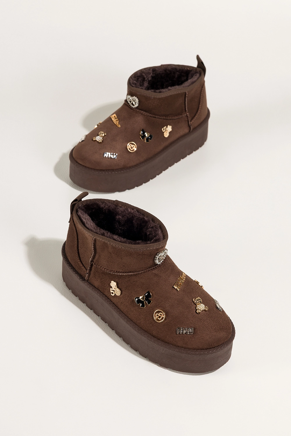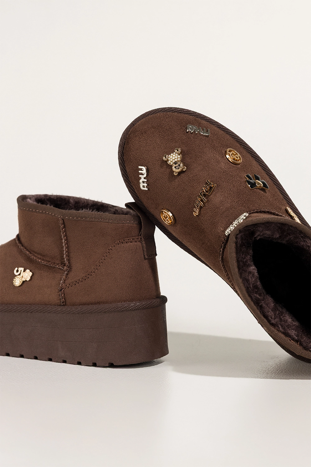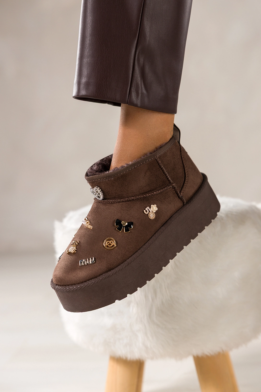 Modne stylizacje i ozdobne akcenty sprawiają, że mukluki to coś więcej niż tylko funkcjonalne śniegowce. Ich ponadczasowy, ciepły brąz w połączeniu z dekoracyjnymi złotymi i srebrnymi ozdobami z cyrkoniami dodaje im niepowtarzalnego blasku. Subtelne detale w górnej części cholewki sprawiają, że te śniegowce z łatwością podkręcą każdą stylizację — od codziennych jeansów i swetra, po bardziej eleganckie zimowe sukienki i płaszcze. Żłobiona platforma nie tylko zwiększa komfort chodzenia, ale również doskonale wpisuje się w aktualne trendy streetwearowe, nadając butom charakteru i lekko sportowego looku. Te mukluki będą doskonałym wyborem zarówno na śnieżne wypady za miasto, jak i na zimowe zakupy w centrum – uniwersalne i zawsze na czasie.