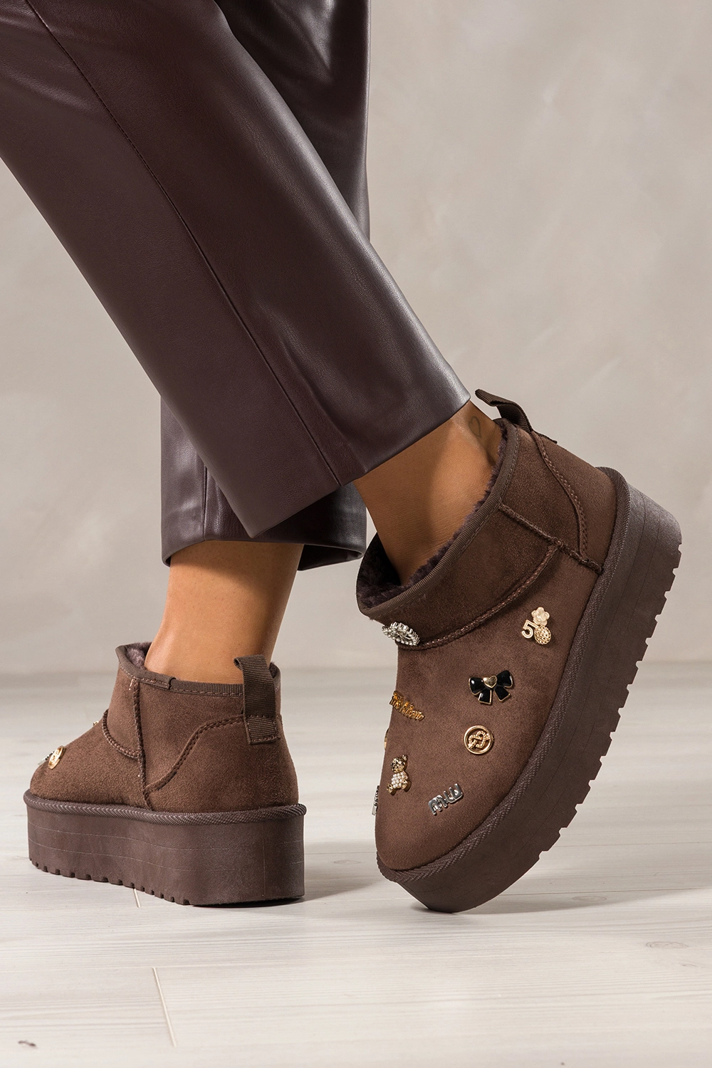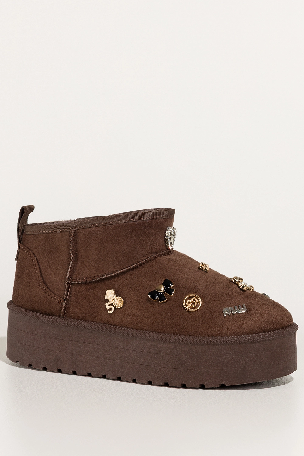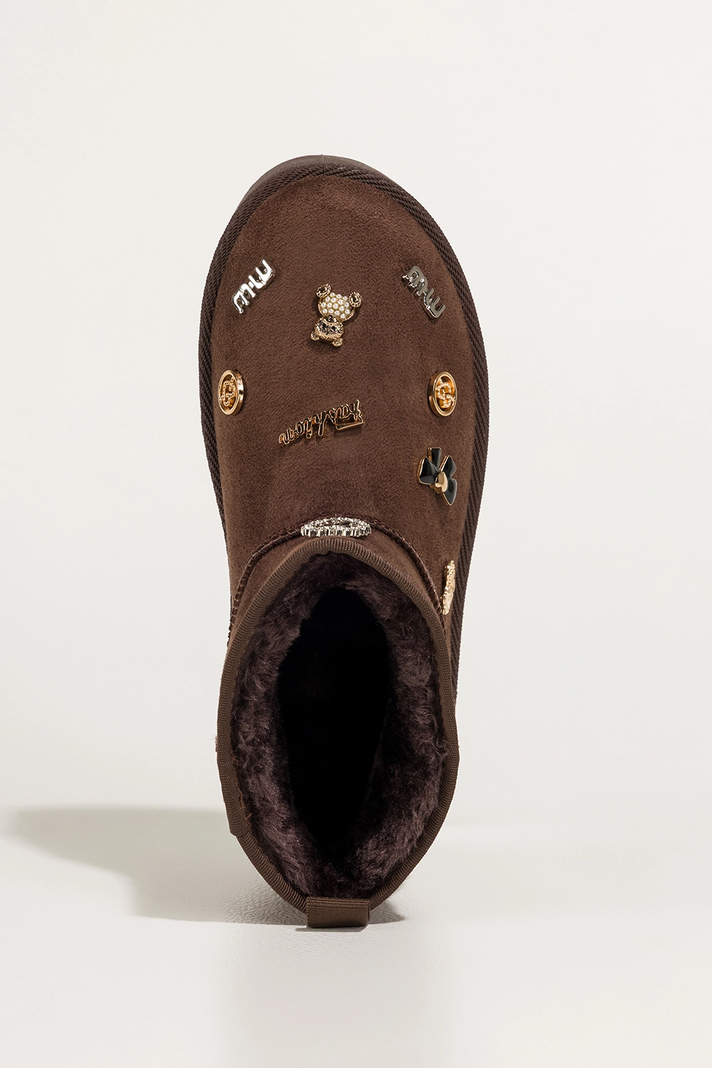 Modne stylizacje i ozdobne akcenty sprawiają, że mukluki to coś więcej niż tylko funkcjonalne śniegowce. Ich ponadczasowy, ciepły brąz w połączeniu z dekoracyjnymi złotymi i srebrnymi ozdobami z cyrkoniami dodaje im niepowtarzalnego blasku. Subtelne detale w górnej części cholewki sprawiają, że te śniegowce z łatwością podkręcą każdą stylizację — od codziennych jeansów i swetra, po bardziej eleganckie zimowe sukienki i płaszcze. Żłobiona platforma nie tylko zwiększa komfort chodzenia, ale również doskonale wpisuje się w aktualne trendy streetwearowe, nadając butom charakteru i lekko sportowego looku. Te mukluki będą doskonałym wyborem zarówno na śnieżne wypady za miasto, jak i na zimowe zakupy w centrum – uniwersalne i zawsze na czasie.