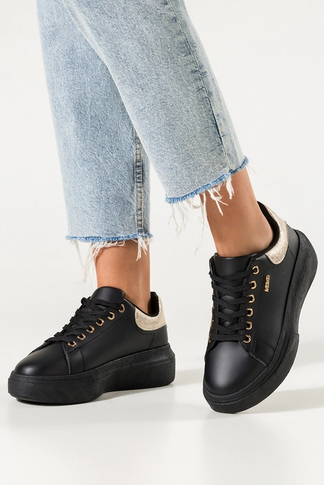 Czarne sneakersy damskie z owadem buty sportowe ze złotymi dodatkami sznurowane Casu 81380-1