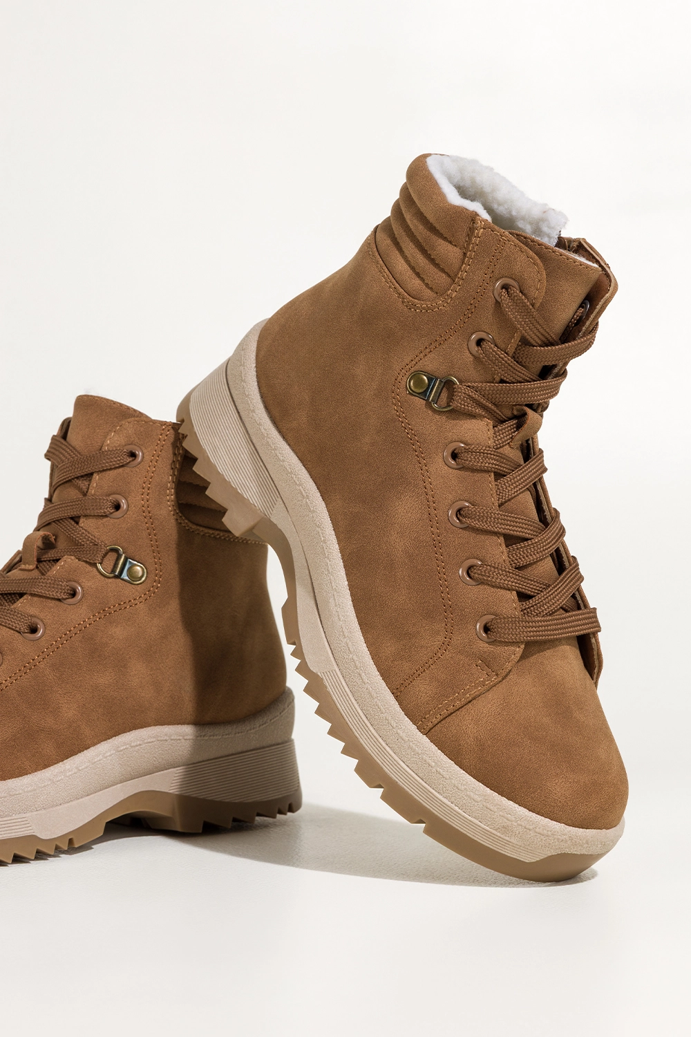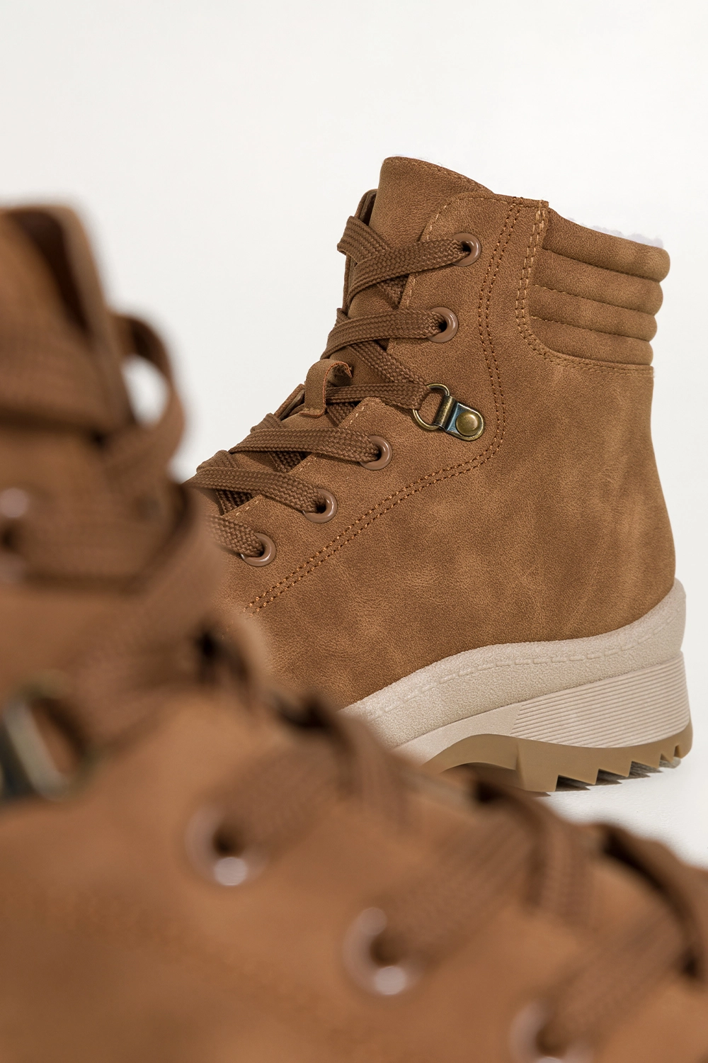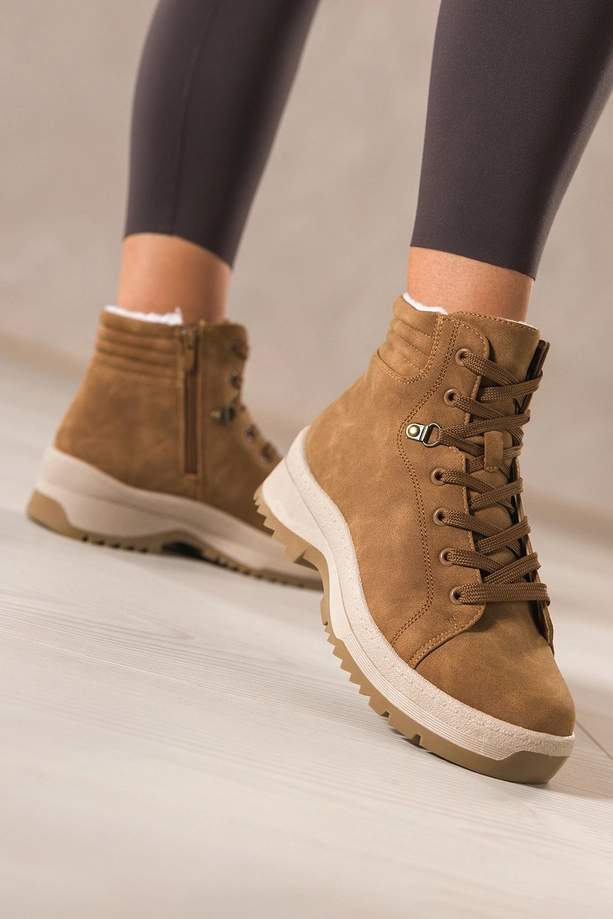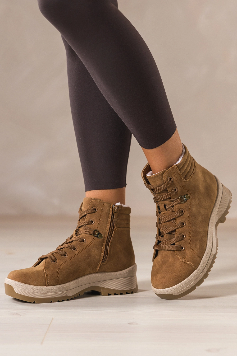 Camelowe botki damskie na bieżnikowanej elastycznej platformie sznurowane Casu model 1911-6. Wykonane z wysokogatunkowej, matowej nubukowej skóry ekologicznej, zapewniają trwałość i elegancki wygląd. Wnętrze ocieplone miękkim kożuszkiem gwarantuje przyjemne ciepło nawet w najchłodniejsze dni. Dzięki solidnej, elastycznej,bieżnikowanej podeszwie, botki doskonale amortyzują każdy krok, zapewniając stabilność i komfort przez cały dzień.