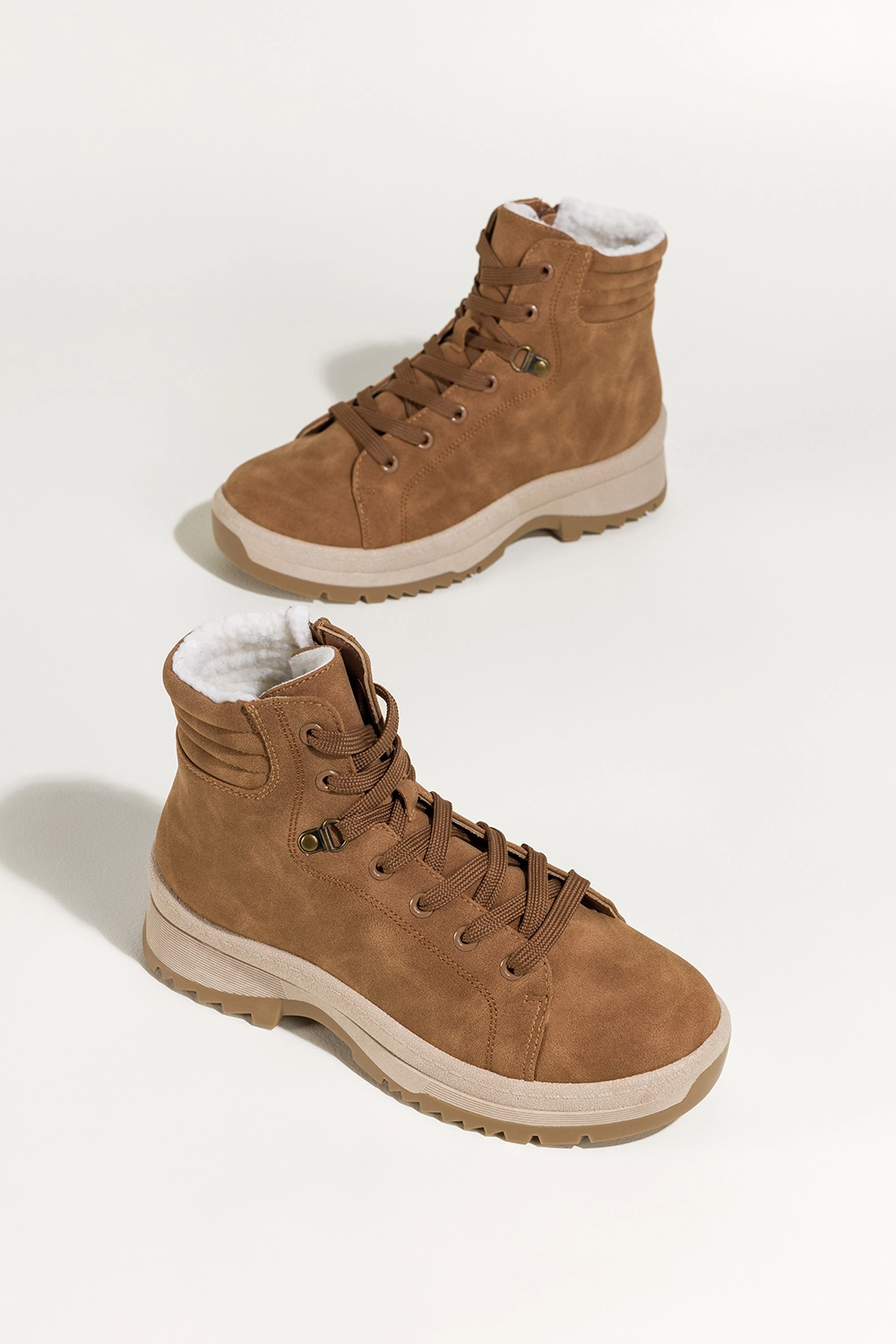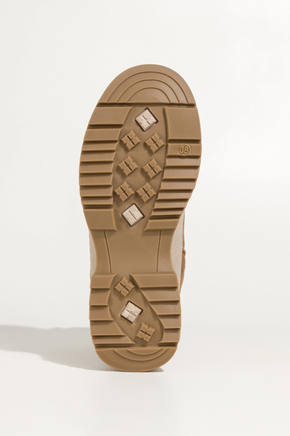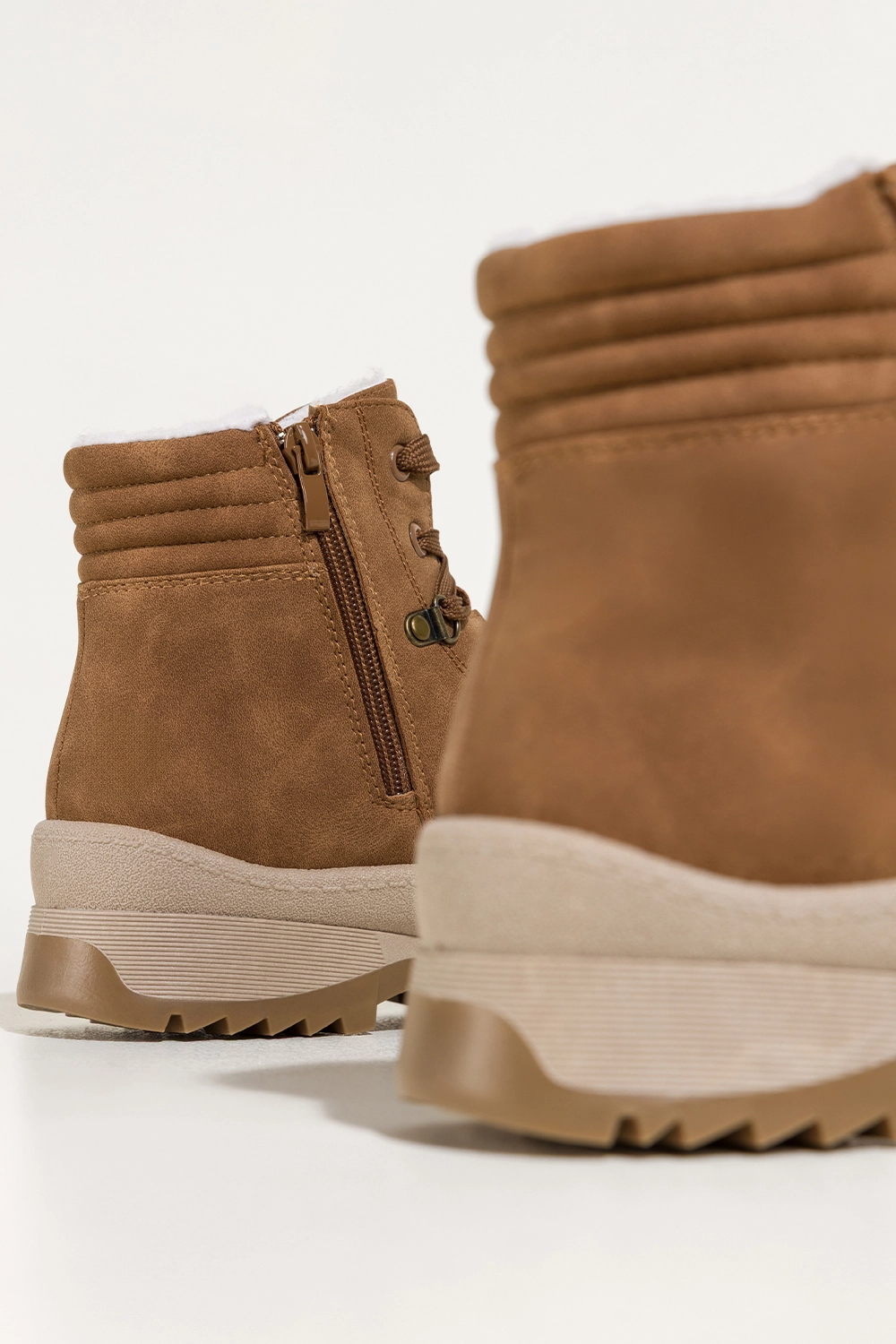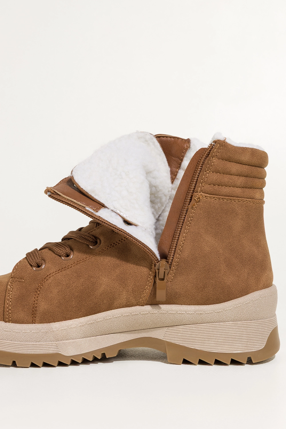 Camelowe botki damskie na bieżnikowanej elastycznej platformie sznurowane Casu model 1911-6. Wykonane z wysokogatunkowej, matowej nubukowej skóry ekologicznej, zapewniają trwałość i elegancki wygląd. Wnętrze ocieplone miękkim kożuszkiem gwarantuje przyjemne ciepło nawet w najchłodniejsze dni. Dzięki solidnej, elastycznej,bieżnikowanej podeszwie, botki doskonale amortyzują każdy krok, zapewniając stabilność i komfort przez cały dzień.