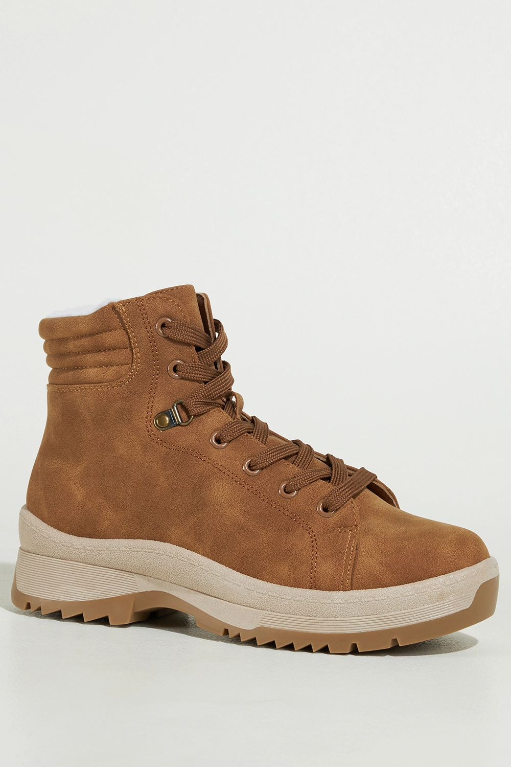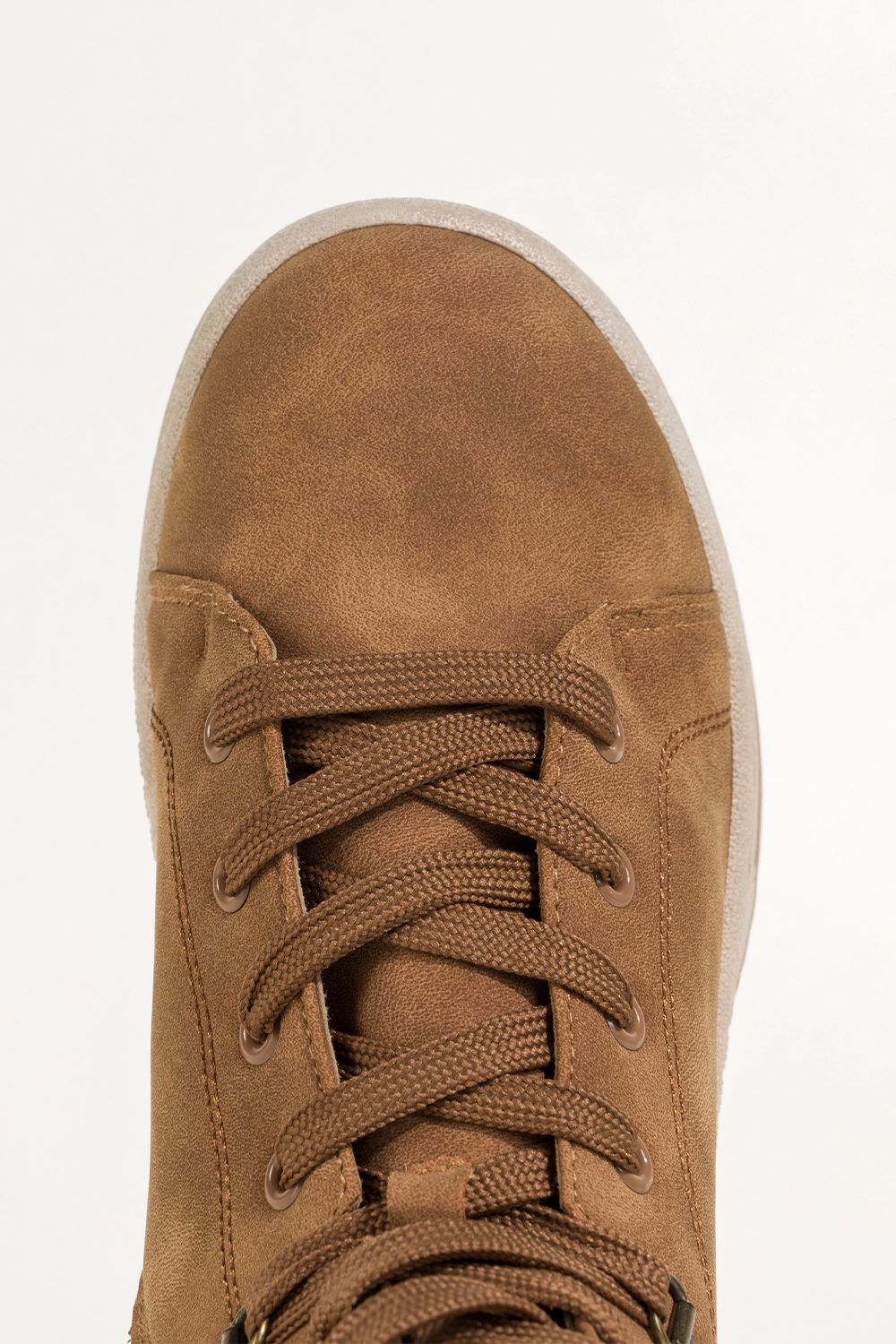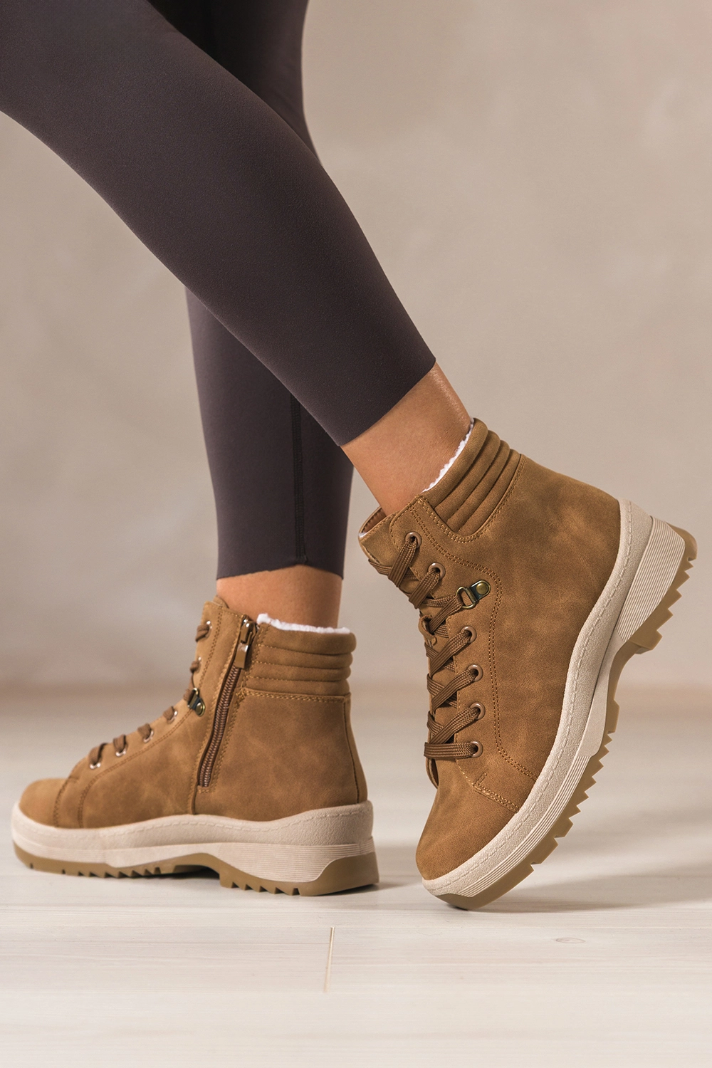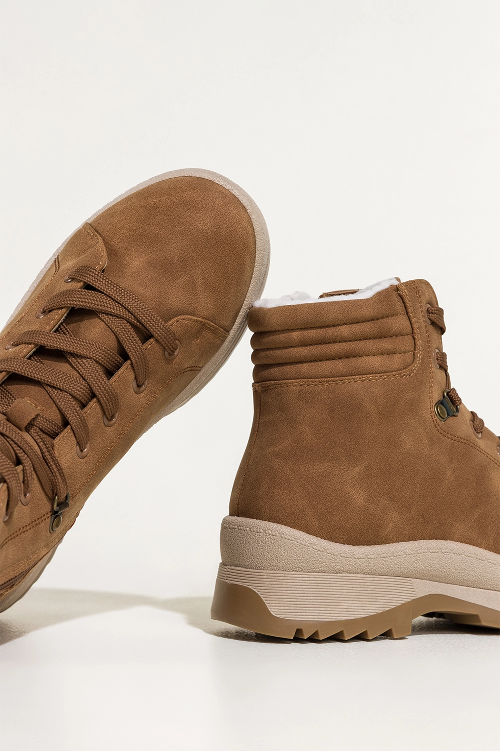 Camelowe botki damskie na bieżnikowanej elastycznej platformie sznurowane Casu model 1911-6. Wykonane z wysokogatunkowej, matowej nubukowej skóry ekologicznej, zapewniają trwałość i elegancki wygląd. Wnętrze ocieplone miękkim kożuszkiem gwarantuje przyjemne ciepło nawet w najchłodniejsze dni. Dzięki solidnej, elastycznej,bieżnikowanej podeszwie, botki doskonale amortyzują każdy krok, zapewniając stabilność i komfort przez cały dzień.