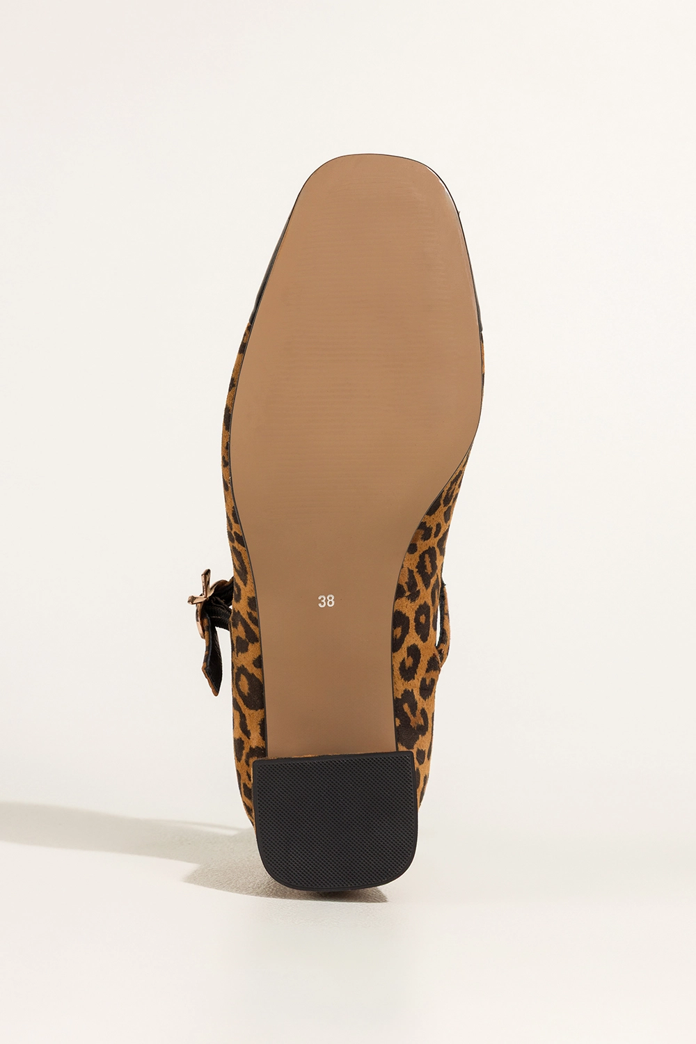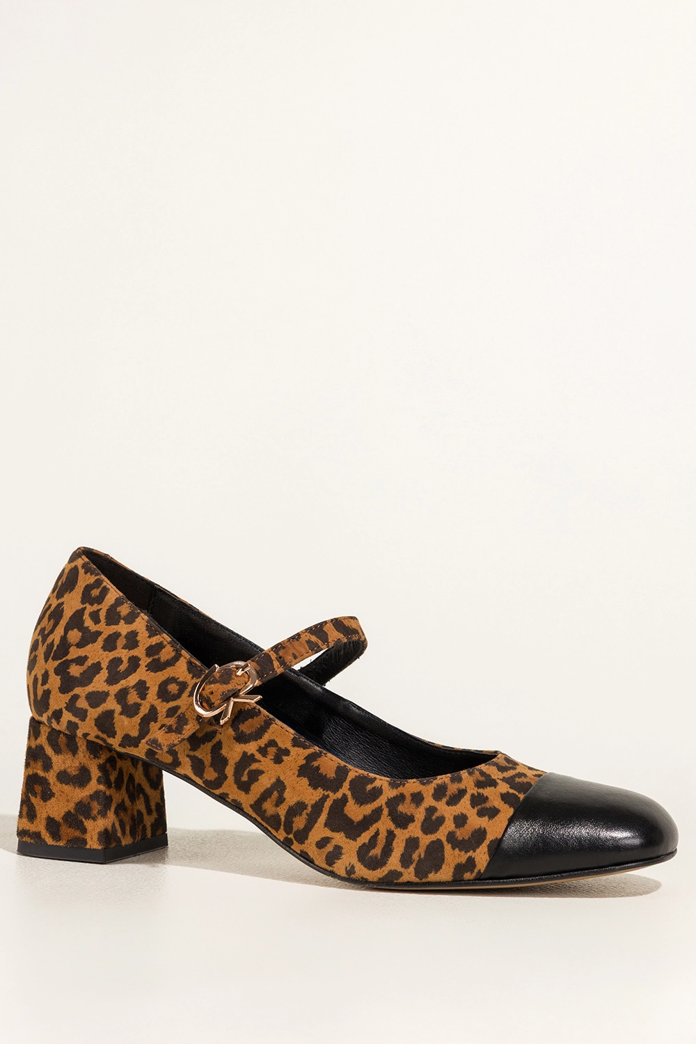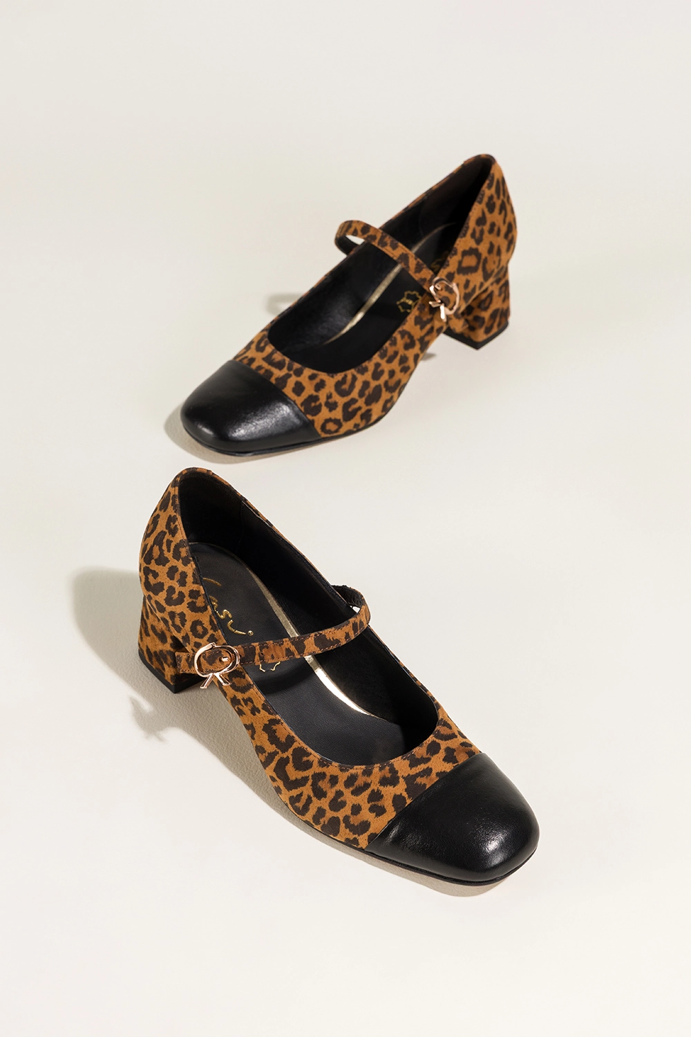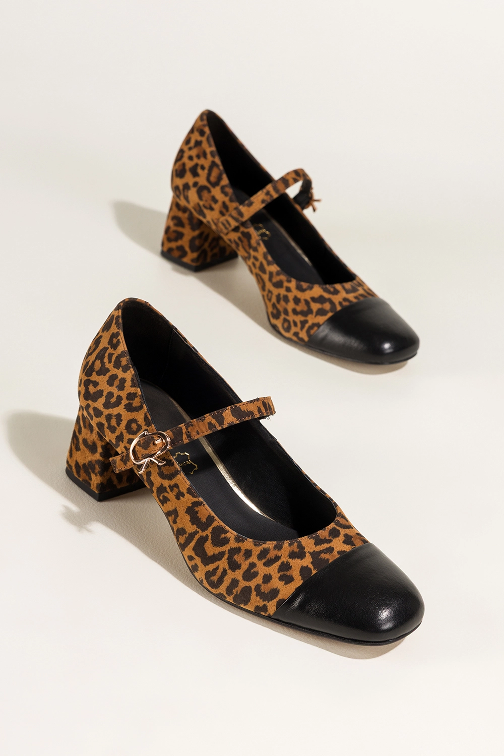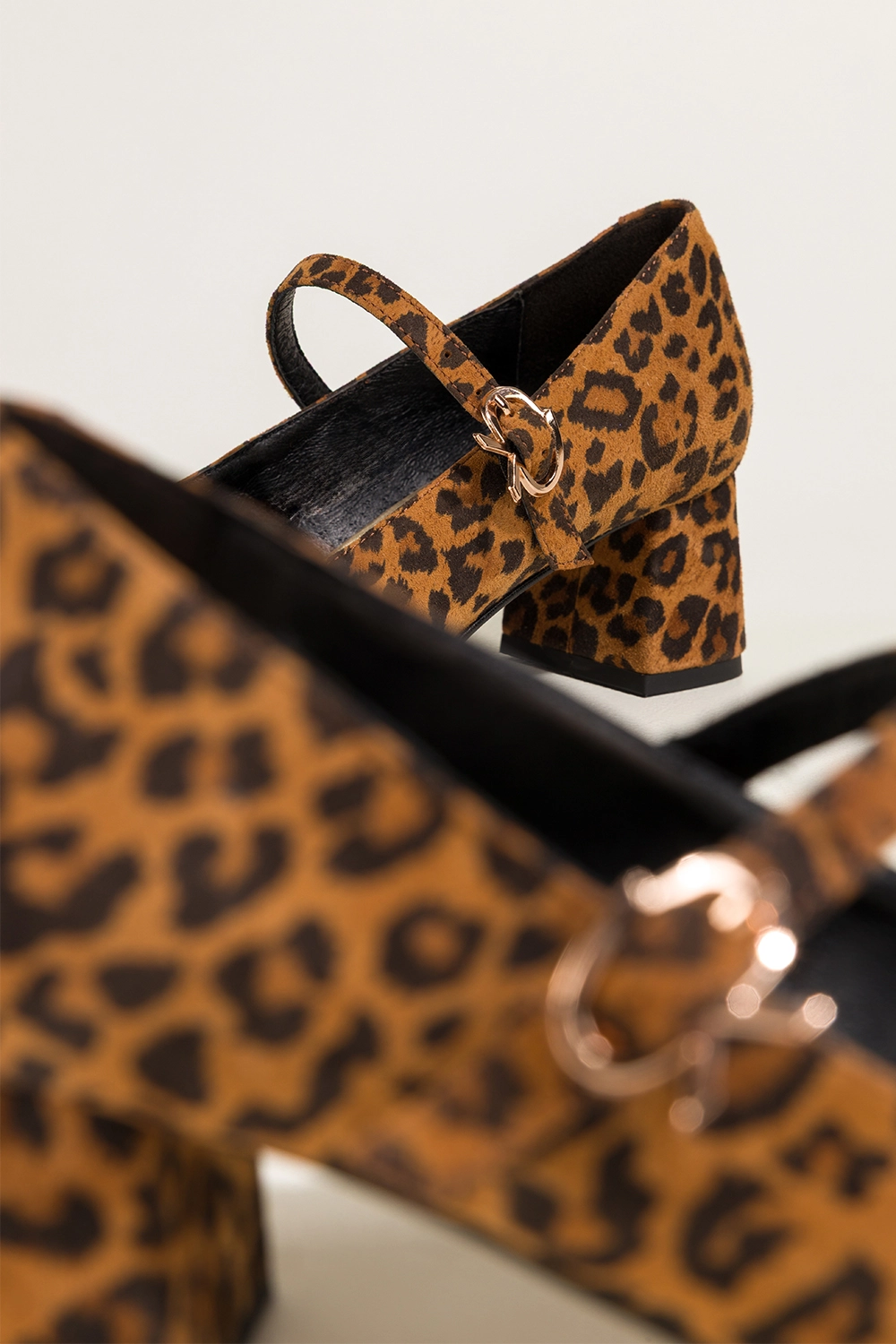 Fason Mary Jane z paskiem i złotą ozdobną klamerką dodaje butom ponadczasowego uroku i kobiecego wdzięku. Niski obcas typu klocek, pokryty skórą z panterkowym wzorem, zapewnia stabilność i komfort noszenia, a jednocześnie przyciąga wzrok i podkreśla indywidualny styl. Kwadratowy nosek pokryty naturalną skórą w kolorze czarnym harmonijnie kontrastuje z camelowym odcieniem cholewki, tworząc spójną i wyrafinowaną kompozycję kolorystyczną. Ten model doskonale uzupełni zarówno klasyczne, jak i bardziej ekstrawaganckie stylizacje.