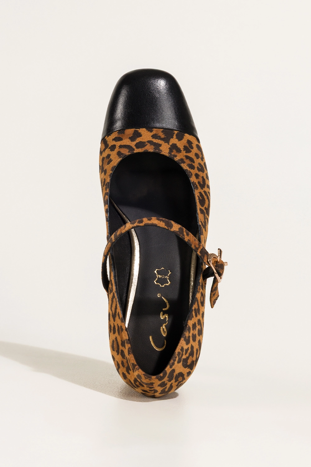 Camelowe czółenka skórzane damskie Mary Jane z paskiem na niskim klocku wzór panterki PRODUKT POLSKI Casu model 7153-899-063. Fason został zaprojektowany i wyprodukowany w Polsce z dbałością o każdy detal, co gwarantuje jego trwałość i wysoką jakość. Cholewka wykonana jest z wysokogatunkowej skóry zamszowej z wzorem panterki, która nie tylko wygląda luksusowo, ale także zapewnia miękkość i idealne dopasowanie do stopy. Miękka wkładka z naturalnej skóry gwarantuje wygodę noszenia przez cały dzień, nawet podczas intensywnych aktywności.
